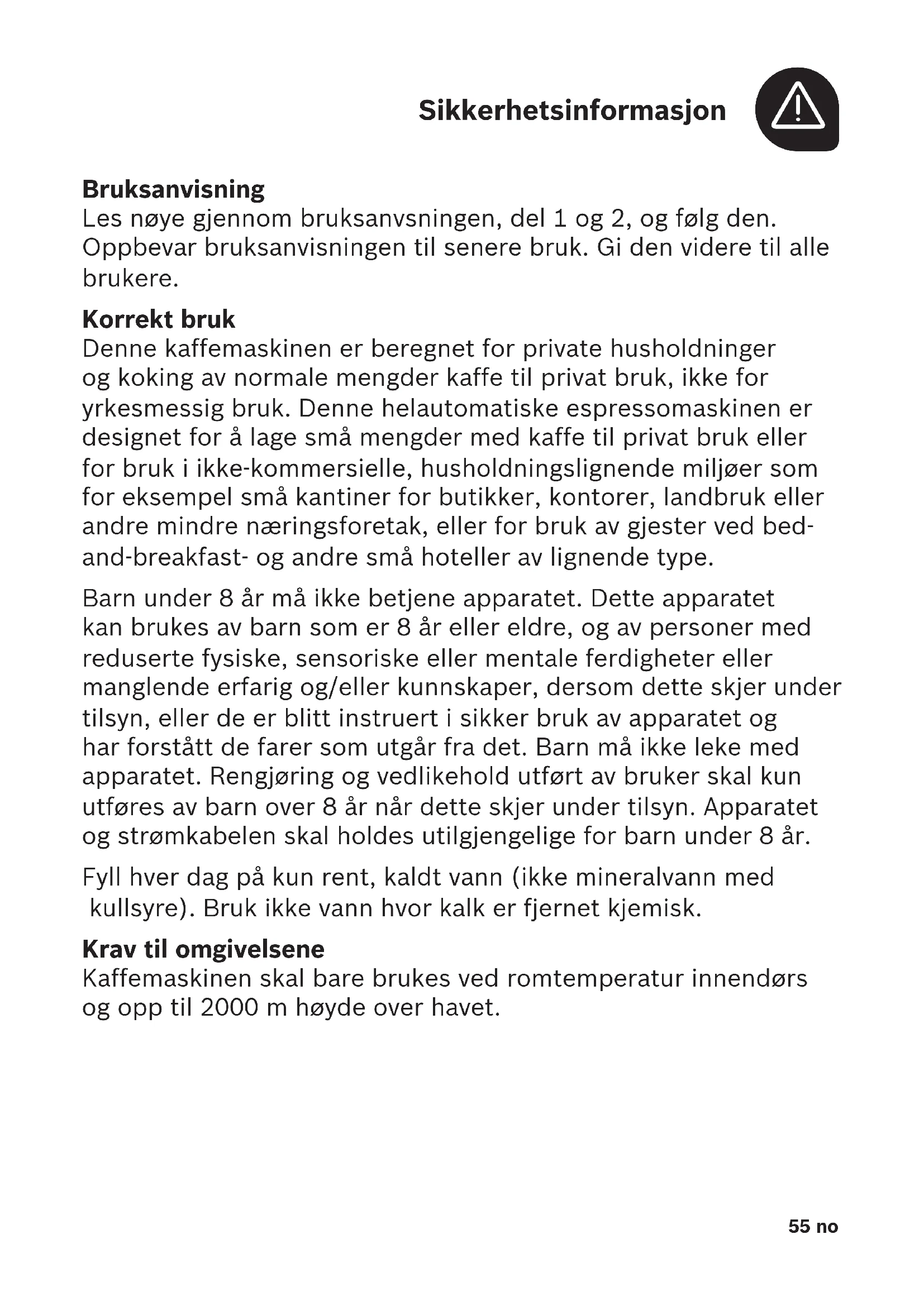 Bruksanvisning Les nøye gjennom bruksanvsningen, del1og 2, og følg den. Oppbevar bruksanvisningen til senere bruk. Gi den videre til alle brukere. Korrekt bruk Denne kaffemaskinen er beregnet for private husholdninger og koking av normale mengder kaffe til privat bruk, ikke for yrkesmessig bruk. Denne helautomatiske espressomaskinen er designet for å lage små mengder med kaffe til privat bruk eller for bruk i ikke-kommersielle, husholdningslignende miljøer som for eksempel små kantiner for butikker, kontorer, landbruk eller andre mindre næringsforetak, eller for bruk av gjester ved bed- and-breakfast- og andre små hoteller av lignende type. Barn under 8 år må ikke betjene apparatet. Dette apparatet kan brukes av barn som er 8 år eller eldre, og av personer med reduserte fysiske, sensoriske eller mentale ferdigheter eller manglende erfarig og/eller kunnskaper, dersom dette skjer under tilsyn, eller de er blitt instruert i sikker bruk av apparatet og har forstått de farer som utgår fra det. Barn må ikke leke med apparatet. Rengjøring og vedlikehold utført av bruker skal kun utføres av barn over 8 år når dette skjer under tilsyn. Apparatet og strømkabelen skal holdes utilgjengelige for barn under 8 år. Fyll hver dag på kun rent, kaldt vann (ikke mineralvann med kullsyre). Bruk ikke vann hvor kalk er fjernet kjemisk. Krav til omgivelsene Kaffemaskinen skal bare brukes ved romtemperatur innendørs og opp til 2000 m høyde over havet.56no Sikkerhetsinformasjon