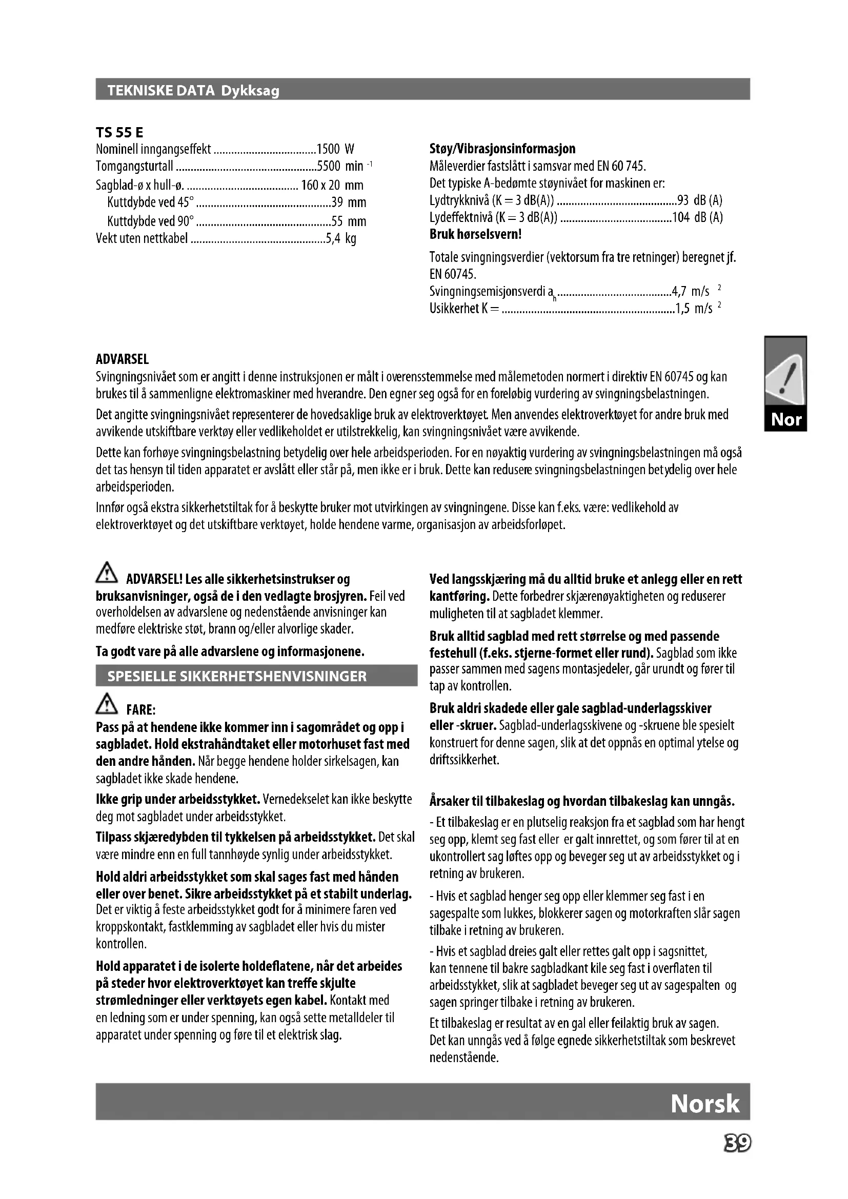 Nor Norsk ADVARSEL! Les alle sikkerhetsinstrukser og bruksanvisninger, også de i den vedlagte brosjyren. Feil ved overholdelsen av advarslene og nedenstående anvisninger kan medføre elektriske støt, brann og/eller alvorlige skader. Ta godt vare på alle advarslene og informasjonene. SPESIELLE SIKKERHETSHENVISNINGER FARE: Pass på at hendene ikke kommer inn i sagområdet og opp i sagbladet. Hold ekstrahåndtaket eller motorhuset fast med den andre hånden. Når begge hendene holder sirkelsagen, kan sagbladet ikke skade hendene. Ikke grip under arbeidsstykket. Vernedekselet kan ikke beskytte deg mot sagbladet under arbeidsstykket. Tilpass skjæredybden til tykkelsen på arbeidsstykket. Det skal være mindre enn en full tannhøyde synlig under arbeidsstykket. Hold aldri arbeidsstykket som skal sages fast med hånden eller over benet. Sikre arbeidsstykket på et stabilt underlag. Det er viktig å feste arbeidsstykket godt for å minimere faren ved kroppskontakt, fastklemming av sagbladet eller hvis du mister kontrollen. Hold apparatet i de isolerte holdeatene, når det arbeides på steder hvor elektroverktøyet kan tree skjulte strømledninger eller verktøyets egen kabel. Kontakt med en ledning som er under spenning, kan også sette metalldeler til apparatet under spenning og føre til et elektrisk slag. Ved langsskjæring må du alltid bruke et anlegg eller en rett kantføring. Dette forbedrer skjærenøyaktigheten og reduserer muligheten til at sagbladet klemmer. Bruk alltid sagblad med rett størrelse og med passende festehull (f.eks. stjerne-formet eller rund). Sagblad som ikke passer sammen med sagens montasjedeler, går urundt og fører til tap av kontrollen. Bruk aldri skadede eller gale sagblad-underlagsskiver eller -skruer. Sagblad-underlagsskivene og -skruene ble spesielt konstruert for denne sagen, slik at det oppnås en optimal ytelse og driftssikkerhet. Årsaker til tilbakeslag og hvordan tilbakeslag kan unngås. - Et tilbakeslag er en plutselig reaksjon fra et sagblad som har hengt seg opp, klemt seg fast eller er galt innrettet, og som fører til at en ukontrollert sag løftes opp og beveger seg ut av arbeidsstykket og i retning av brukeren. - Hvis et sagblad henger seg opp eller klemmer seg fast i en sagespalte som lukkes, blokkerer sagen og motorkraften slår sagen tilbake i retning av brukeren. - Hvis et sagblad dreies galt eller rettes galt opp i sagsnittet, kan tennene til bakre sagbladkant kile seg fast i overaten til arbeidsstykket, slik at sagbladet beveger seg ut av sagespalten og sagen springer tilbake i retning av brukeren. Et tilbakeslag er resultat av en gal eller feilaktig bruk av sagen. Det kan unngås ved å følge egnede sikkerhetstiltak som beskrevet nedenstående. ADVARSEL Svingningsnivået som er angitt i denne instruksjonen er målt i overensstemmelse med målemetoden normert i direktiv EN 60745 og kan brukes til å sammenligne elektromaskiner med hverandre. Den egner seg også for en foreløbig vurdering av svingningsbelastningen. Det angitte svingningsnivået representerer de hovedsaklige bruk av elektroverktøyet. Men anvendes elektroverktøyet for andre bruk med avvikende utskiftbare verktøy eller vedlikeholdet er utilstrekkelig, kan svingningsnivået være avvikende. Dette kan forhøye svingningsbelastning betydelig over hele arbeidsperioden. For en nøyaktig vurdering av svingningsbelastningen må også det tas hensyn til tiden apparatet er avslått eller står på, men ikke er i bruk. Dette kan redusere svingningsbelastningen betydelig over hele arbeidsperioden. Innfør også ekstra sikkerhetstiltak for å beskytte bruker mot utvirkingen av svingningene. Disse kan f.eks. være: vedlikehold av elektroverktøyet og det utskiftbare verktøyet, holde hendene varme, organisasjon av arbeidsforløpet. TS 55 E Nominell inngangseekt ...................................1500 W Tomgangsturtall ................................................5500 min