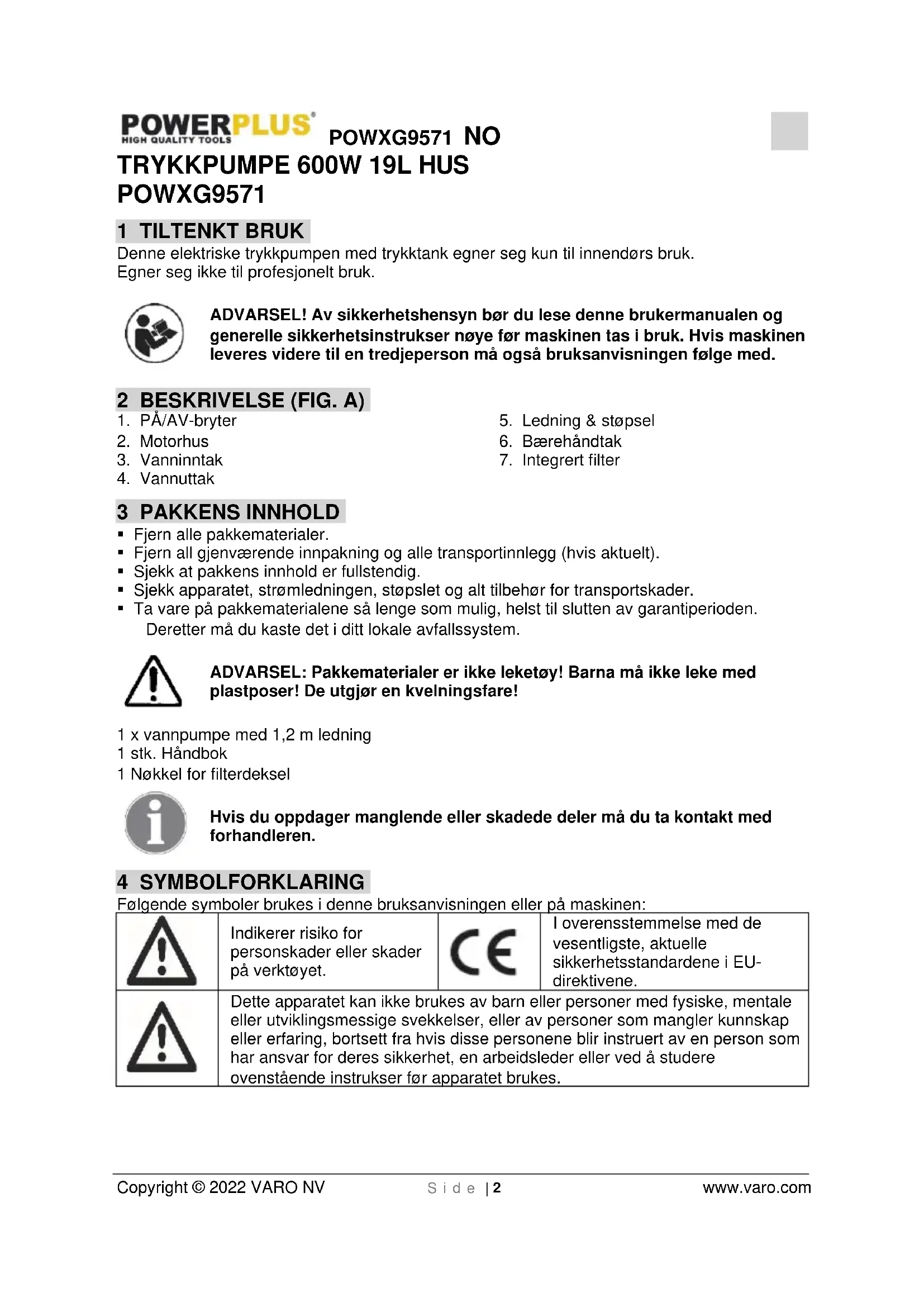 - Gjør rent pumpens kammere med jevne mellomrom, ved å skylle dem i rent vann. Dette for å fjerne oppsamlede urenheter.POWXG9571 NO Copyright © 2022 VARO NV S i d e | 5 www.varo.com