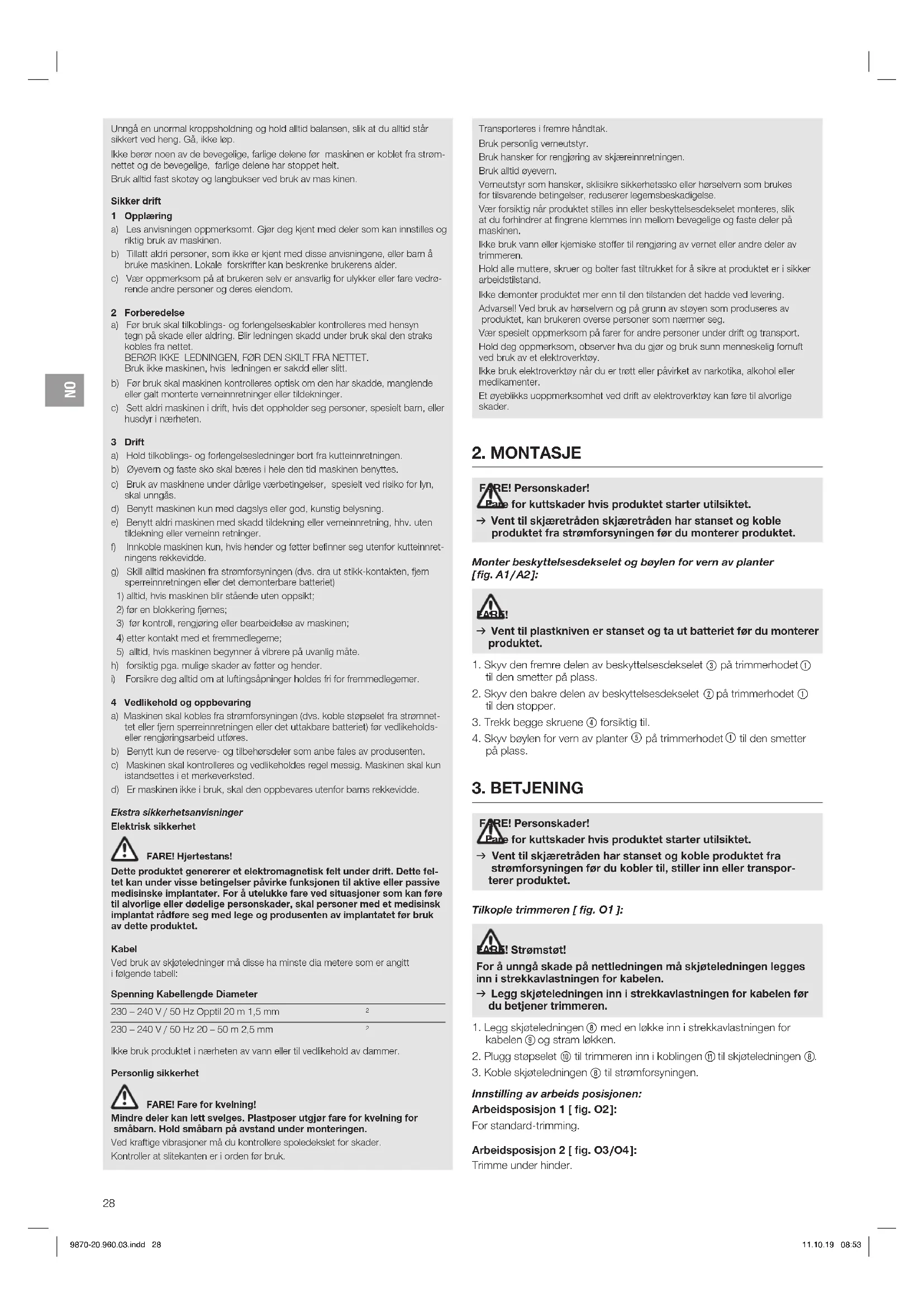 til strømforsyningen. Innstilling av arbeids posisjonen: Arbeidsposisjon 1 [ fig. O2 ]: For standard-trimming. Arbeidsposisjon 2 [ fig. O3 /O4 ]: Trimme under hinder. Transporteres i fremre håndtak. Bruk personlig verneutstyr. Bruk hansker for rengjøring av skjæreinnretningen. Bruk alltid øyevern. Verneutstyr som hansker, sklisikre sikkerhetssko eller hørselvern som brukes for tilsvarende betingelser, reduserer legemsbeskadigelse. Vær forsiktig når produktet stilles inn eller beskyttelsesdekselet monteres, slik at du forhindrer at fingrene klemmes inn mellom bevegelige og faste deler på maskinen. Ikke bruk vann eller kjemiske stoffer til rengjøring av vernet eller andre deler av trimmeren. Hold alle muttere, skruer og bolter fast tiltrukket for å sikre at produktet er i sikker arbeidstilstand. Ikke demonter produktet mer enn til den tilstanden det hadde ved levering. Advarsel! Ved bruk av hørselvern og på grunn av støyen som produseres av produktet, kan brukeren overse personer som nærmer seg. Vær spesielt oppmerksom på farer for andre personer under drift og transport. Hold deg oppmerksom, observer hva du gjør og bruk sunn menneskelig fornuft ved bruk av et elektroverktøy. Ikke bruk elektroverktøy når du er trøtt eller påvirket av narkotika, alkohol eller medikamenter. Et øyeblikks uoppmerksomhet ved drift av elektroverktøy kan føre til alvorlige skader. 9870-20.960.03.indd 28 11.10.19 08:53NO