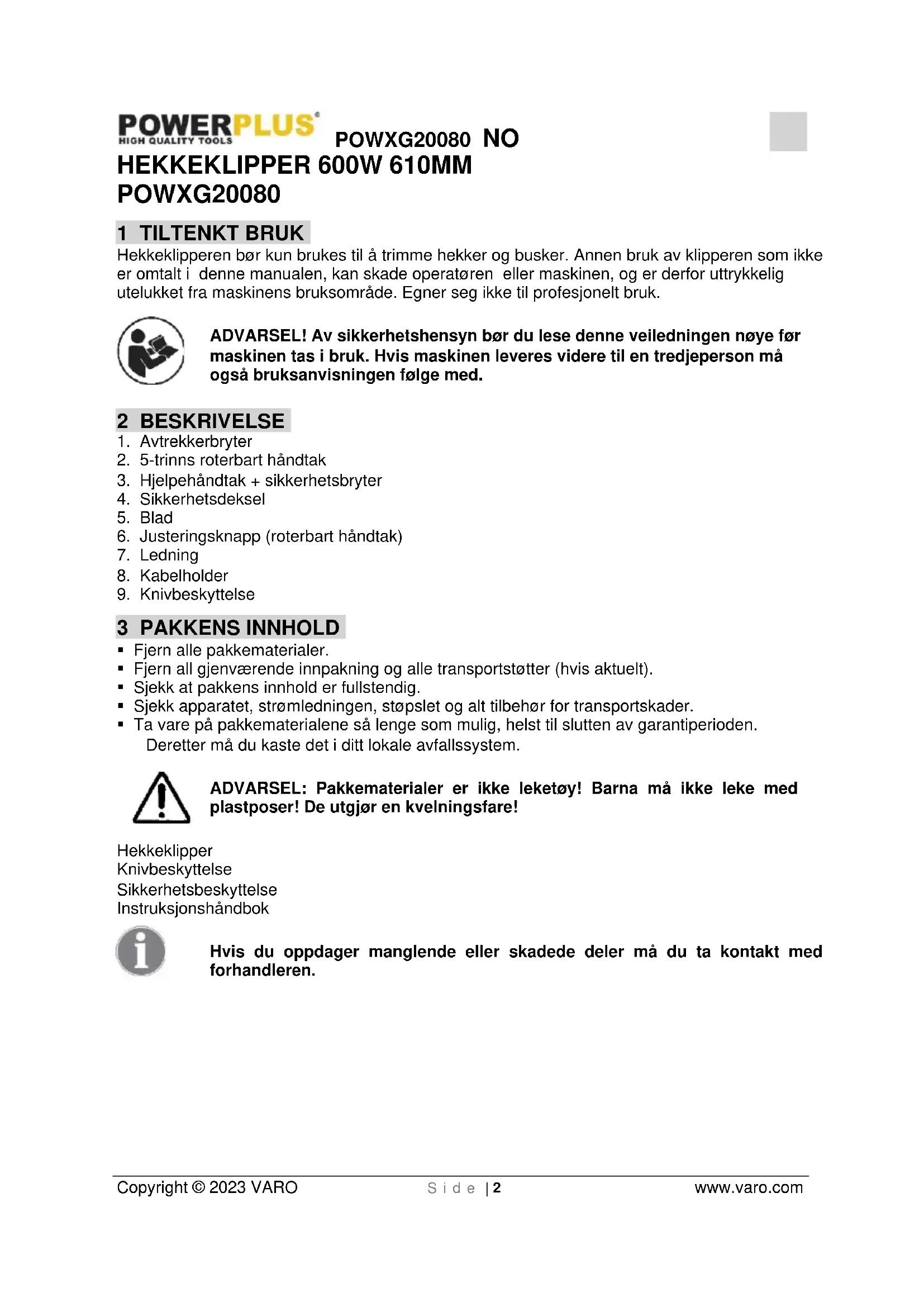 - Hold alle kroppsdeler unna knivene. Ikke forsøk å fjerne kuttet materiale eller å holde i materialet som skal kuttes når knivene beveger seg. Påse at bryteren er slått av når du skal fjerne fastklemte materialer. Et øyeblikks uoppmerksomhet ved bruk av hekkeklipperen kan føre til alvorlige personskader.POWXG20080 NO Copyright © 2023 VARO S i d e | 5 www.varo.com