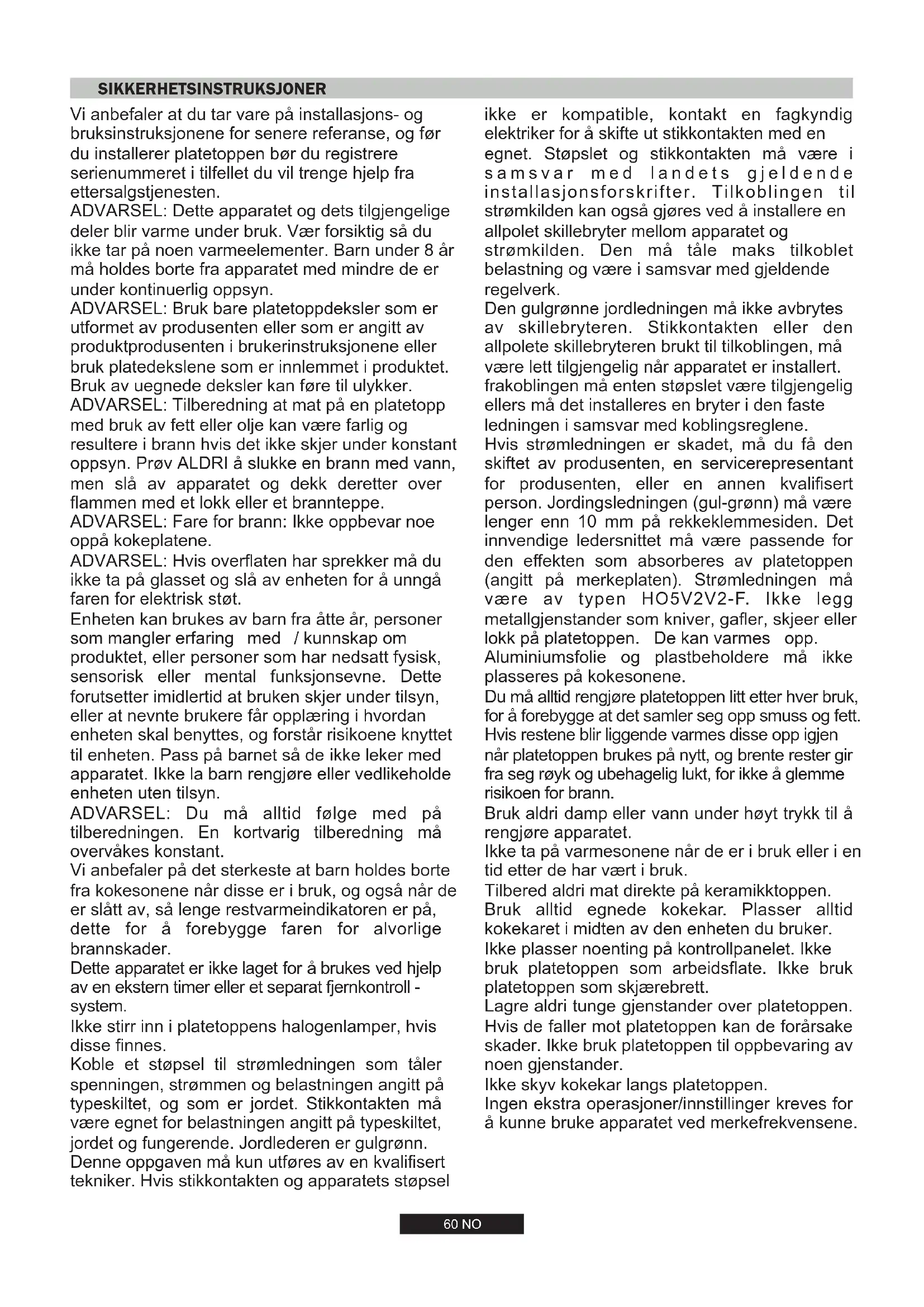 6NO3Barnesikringsfunksjon Denne funksjonen slås på når du trykker på tastene '+' og '-' samtidig. Deretter, hver gang en tast berøres, vil displayet vise “L” i 2 sekunder og oppvarmingen vil forbli i samme status. For å deaktivere barnesikringen følger du prosessen beskrevet tidligere. Det vil høres en kort pipelyd og displayet vil vise bokstaven “n”. Platetoppen vil forbli ulåst. Merk: En automatisk barnesikring vil aktiveres 15 minutter etter at du har slåttAV platetoppen fullstendig. Velge en sone Når sonen allerede er PÅ produseres en lavere lysintensitet for de ikke valgte sonene som er PÅ. Hvis bare en sone er PÅ er denne sonen allerede valgt som standard, uten å du trenger å trykke kort (150 msek) på valgtasten. Øke/redusere effektnivået Når sonen allerede er PÅ produseres en lavere lysintensitet for de ikke valgte sonene som er PÅ. Hvis bare en sone er PÅ er denne sonen allerede valgt som standard, uten å du trenger å trykke kort (150 msek) på valgtasten. Med et kort trykk på tastene '+' eller '-' øker eller reduserer du effekten på den valgte sonen: 0-1-2-3...9-P