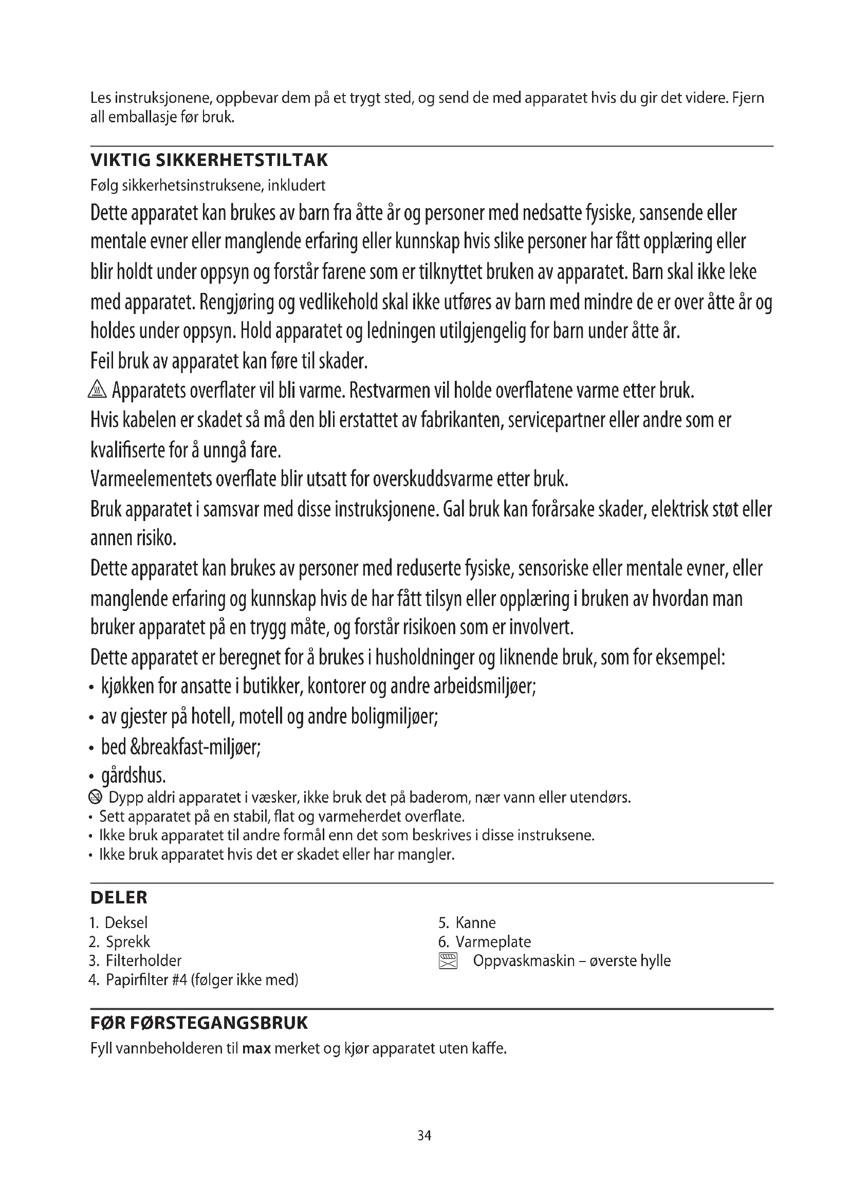 AE34 Les instruksjonene, oppbevar dem på et trygt sted, og send de med apparatet hvis du gir det videre. Fjern all emballasje før bruk. VIKTIG SIKKERHETSTILTAK Følg sikkerhetsinstruksene, inkludert Dette apparatet kan brukes av barn fra åtte år og personer med nedsatte fysiske, sansende eller mentale evner eller manglende erfaring eller kunnskap hvis slike personer har fått opplæring eller blir holdt under oppsyn og forstår farene som er tilknyttet bruken av apparatet. Barn skal ikke leke med apparatet. Rengjøring og vedlikehold skal ikke utføres av barn med mindre de er over åtte år og holdes under oppsyn. Hold apparatet og ledningen utilgjengelig for barn under åtte år. Feil bruk av apparatet kan føre til skader. h Apparatets overater vil bli varme. Restvarmen vil holde overatene varme etter bruk. Hvis kabelen er skadet så må den bli erstattet av fabrikanten, servicepartner eller andre som er kvaliserte for å unngå fare. Varmeelementets overate blir utsatt for overskuddsvarme etter bruk. Bruk apparatet i samsvar med disse instruksjonene. Gal bruk kan forårsake skader, elektrisk støt eller annen risiko. Dette apparatet kan brukes av personer med reduserte fysiske, sensoriske eller mentale evner, eller manglende erfaring og kunnskap hvis de har fått tilsyn eller opplæring i bruken av hvordan man bruker apparatet på en trygg måte, og forstår risikoen som er involvert. Dette apparatet er beregnet for å brukes i husholdninger og liknende bruk, som for eksempel: