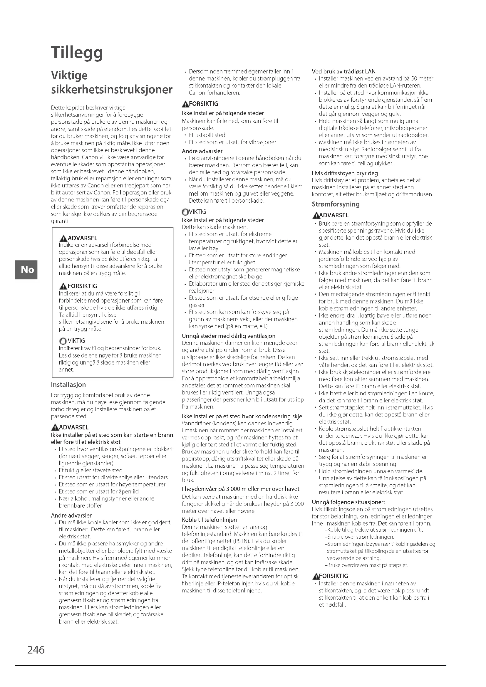 Maskinen fungerer ikke Det har oppstått papirblokkering Skifte tonerkassett Skift tonerkassetten i henhold til anvisningene på skjermen.Modellnummer for skifte av tonerkassett• Canon Cartridge 057• Canon Cartridge 057 H Hurtigstart NoVed bruk av trådløst LAN Installer maskinen ved en avstand på 50 meter eller mindre fra den trådløse LAN-ruteren. Installer på et sted hvor kommunikasjon ikke blokkeres av forstyrrende gjenstander, så frem dette er mulig. Signalet kan bli forringet når det går gjennom vegger og gulv. Hold maskinen så langt som mulig unna digitale trådløse telefoner, mikrobølgeovner eller annet utstyr som sender ut radiobølger. Maskinen må ikke brukes i nærheten av medisinsk utstyr. Radiobølger sendt ut fra maskinen kan forstyrre medisinsk utstyr, noe som kan føre til feil og ulykker.Hvis driftsstøyen bryr degHvis driftstøy er et problem, anbefales det at maskinen installeres på et annet sted enn kontoret, alt etter bruksmiljøet og driftsmodusen. Strømforsyning ADVARSEL Bruk bare en strømforsyning som oppfyller de spesifiserte spenningskravene. Hvis du ikke gjør dette, kan det oppstå brann eller elektrisk støt. Maskinen må kobles til en kontakt med jordingsforbindelse ved hjelp av strømledningen som følger med. Ikke bruk andre strømledninger enn den som følger med maskinen, da det kan føre til brann eller elektrisk støt. Den medfølgende strømledningen er tiltenkt for bruk med denne maskinen. Du må ikke koble strømledningen til andre enheter. Ikke endre, dra i, kraftig bøye eller utføre noen annen handling som kan skade strømledningen. Du må ikke sette tunge objekter på strømledningen. Skade på strømledningen kan føre til brann eller elektrisk støt. Ikke sett inn eller trekk ut strømstøpslet med våte hender, da det kan føre til et elektrisk støt. Ikke bruk skjøteledninger eller strømfordelere med flere kontakter sammen med maskinen. Dette kan føre til brann eller elektrisk støt. Ikke brett eller bind strømledningen i en knute, da det kan føre til brann eller elektrisk støt. Sett strømstøpslet helt inn i strømuttaket. Hvis du ikke gjør dette, kan det oppstå brann eller elektrisk støt. Koble strømstøpslet helt fra stikkontakten under tordenvær. Hvis du ikke gjør dette, kan det oppstå brann, elektrisk støt eller skade på maskinen. Sørg for at strømforsyningen til maskinen er trygg og har en stabil spenning. Hold strømledningen unna en varmekilde. Unnlatelse av dette kan få innkapslingen på strømledningen til å smelte, og det kan resultere i brann eller elektrisk støt.Unngå følgende situasjoner:Hvis tilkoblingsdelen på strømledningen utsettes for stor belastning, kan ledningen eller ledninger inne i maskinen kobles fra. Det kan føre til brann. – Koble til og trekke ut strømledningen ofte. – Snuble over strømledningen. – Strømledningen bøyes nær tilkoblingsdelen og strømuttaket på tilkoblingsdelen utsettes for vedvarende belastning. – Bruke overdreven makt på støpslet.FORSIKTIG Installer denne maskinen i nærheten av stikkontakten, og la det være nok plass rundt stikkontakten til at den enkelt kan kobles fra i et nødsfall. Dersom noen fremmedlegemer faller inn i denne maskinen, kobler du strømpluggen fra stikkontakten og kontakter den lokale Canon-forhandleren.FORSIKTIGIkke installer på følgende stederMaskinen kan falle ned, som kan føre til personskade. Et ustabilt sted Et sted som er utsatt for vibrasjonerAndre advarsler Følg anvisningene i denne håndboken når du bærer maskinen. Dersom den bæres feil, kan den falle ned og forårsake personskade. Når du installerer denne maskinen, må du være forsiktig så du ikke setter hendene i klem mellom maskinen og gulvet eller veggene. Dette kan føre til personskade.VIKTIGIkke installer på følgende stederDette kan skade maskinen. Et sted som er utsatt for ekstreme temperaturer og fuktighet, hvorvidt dette er lav eller høy. Et sted som er utsatt for store endringer itemperatur eller fuktighet Et sted nær utstyr som genererer magnetiske eller elektromagnetiske bølge Et laboratorium eller sted der det skjer kjemiske reaksjoner Et sted som er utsatt for etsende eller giftige gasser Et sted som kan som kan forskyve seg på grunn av maskinens vekt, eller der maskinen kan synke ned (på en matte, e.l.)Unngå steder med dårlig ventilasjonDenne maskinen danner en liten mengde ozon og andre utslipp under normal bruk. Disse utslippene er ikke skadelige for helsen. De kan derimot merkes ved bruk over lengre tid eller ved store produksjoner i rom med dårlig ventilasjon. For å opprettholde et komfortabelt arbeidsmiljø anbefales det at rommet som maskinen skal brukes i er riktig ventilert. Unngå også plasseringer der personer kan bli utsatt for utslipp fra maskinen. Ikke installer på et sted hvor kondensering skjeVanndråper (kondens) kan dannes innvendig imaskinen når rommet der maskinen er installert, varmes opp raskt, og når maskinen flyttes fra et kjølig eller tørt sted til et varmt eller fuktig sted. Bruk av maskinen under slike forhold kan føre til papirstopp, dårlig utskriftskvalitet eller skade på maskinen. La maskinen tilpasse seg temperaturen og fuktigheten i omgivelsene iminst 2 timer før bruk.I høydenivåer på 3 000 m eller mer over havetDet kan være at maskiner med en harddisk ikke fungerer skikkelig når de brukes i høyder på 3 000 meter over havet eller høyere.Koble til telefonlinjenDenne maskinen støtter en analog telefonlinjestandard. Maskinen kan bare kobles til det offentlige nettet (PSTN). Hvis du kobler maskinen til en digital telefonlinje eller en dedikert telefonlinje, kan dette forhindre riktig drift på maskinen, og det kan forårsake skade. Sjekk type telefonline før du kobler til maskinen. Ta kontakt med tjenesteleverandøren for optisk fiberlinje eller IP-telefonlinjen hvis du vil koble maskinen til disse telefonlinjene. Viktige sikkerhetsinstruksjoner Dette kapitlet beskriver vi