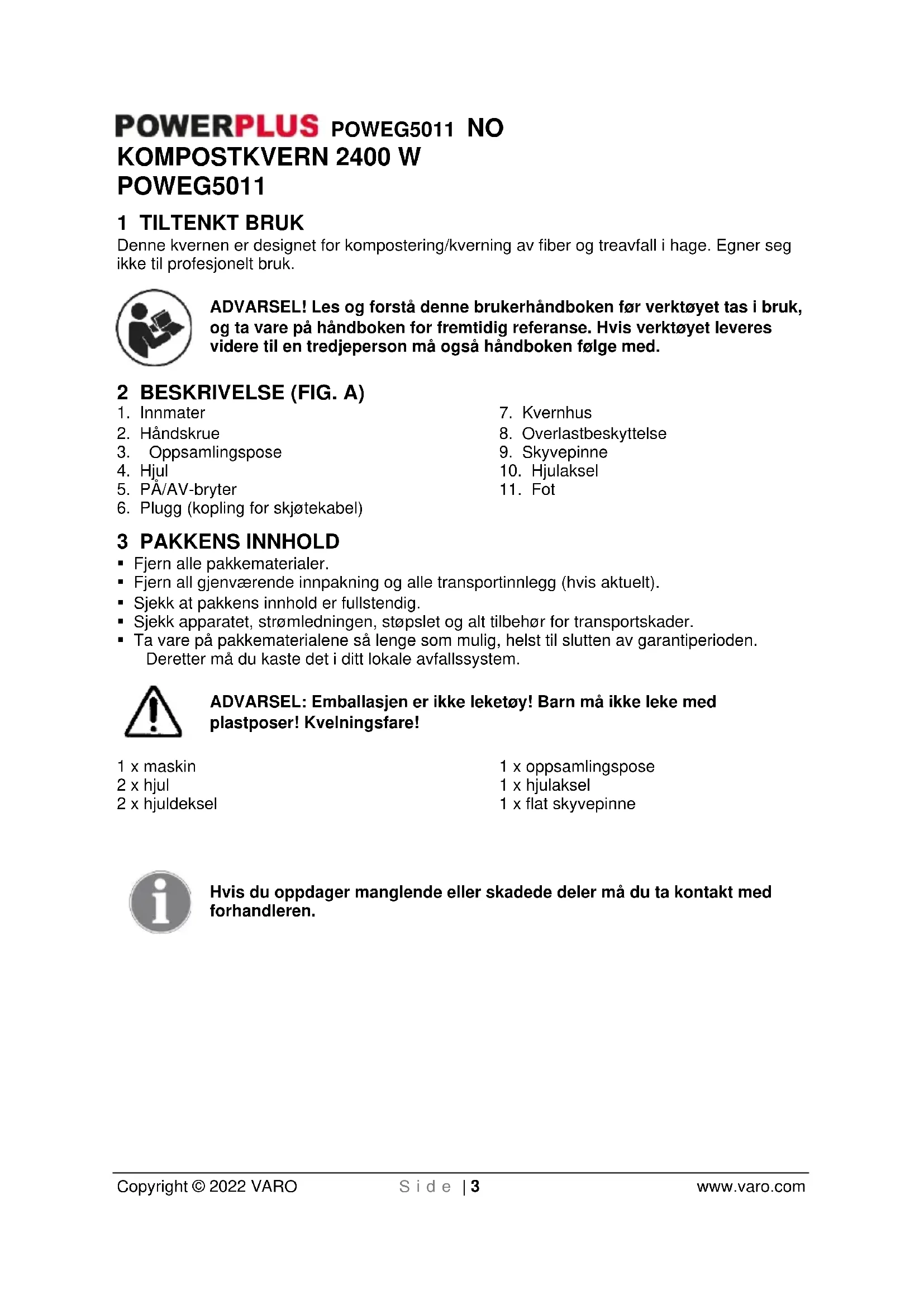 Copyright © 2022 VARO S i d e | 3 www.varo.com KOMPOSTKVERN 2400 W POWEG5011 1 TILTENKT BRUK Denne kvernen er designet for kompostering/kverning av fiber og treavfall i hage. Egner seg ikke til profesjonelt bruk. ADVARSEL! Les og forstå denne brukerhåndboken før verktøyet tas i bruk, og ta vare på håndboken for fremtidig referanse. Hvis verktøyet leveres videre til en tredjeperson må også håndboken følge med. 2 BESKRIVELSE (FIG. A)