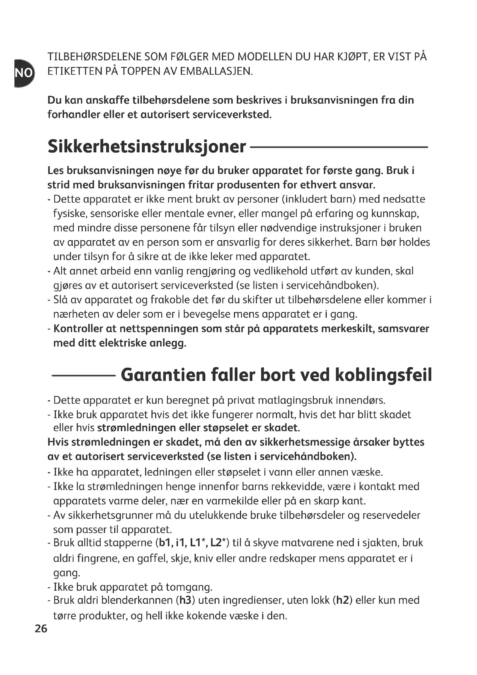 25TILBEHØRSDELENE SOM FØLGER MED MODELLEN DU HAR KJØPT, ER VIST PÅ ETIKETTEN PÅ TOPPEN AV EMBALLASJEN. Du kan anskaffe tilbehørsdelene som beskrives i bruksanvisningen fra din forhandler eller et autorisert serviceverksted. Sikkerhetsinstruksjoner Les bruksanvisningen nøye før du bruker apparatet for første gang. Bruk i strid med bruksanvisningen fritar produsenten for ethvert ansvar. - Dette apparatet er ikke ment brukt av personer (inkludert barn) med nedsatte fysiske, sensoriske eller mentale evner, eller mangel på erfaring og kunnskap, med mindre disse personene får tilsyn eller nødvendige instruksjoner i bruken av apparatet av en person som er ansvarlig for deres sikkerhet. Barn bør holdes under tilsyn for å sikre at de ikke leker med apparatet. - Alt annet arbeid enn vanlig rengjøring og vedlikehold utført av kunden, skal gjøres av et autorisert serviceverksted (se listen i servicehåndboken). - Slå av apparatet og frakoble det før du skifter ut tilbehørsdelene eller kommer i nærheten av deler som er i bevegelse mens apparatet er i gang. - Kontroller at nettspenningen som står på apparatets merkeskilt, samsvarer med ditt elektriske anlegg. Garantien faller bort ved koblingsfeil - Dette apparatet er kun beregnet på privat matlagingsbruk innendørs. - Ikke bruk apparatet hvis det ikke fungerer normalt, hvis det har blitt skadet eller hvis strømledningen eller støpselet er skadet. Hvis strømledningen er skadet, må den av sikkerhetsmessige årsaker byttes av et autorisert serviceverksted (se listen i servicehåndboken). - Ikke ha apparatet, ledningen eller støpselet i vann eller annen væske. - Ikke la strømledningen henge innenfor barns rekkevidde, være i kontakt med apparatets varme deler, nær en varmekilde eller på en skarp kant. - Av sikkerhetsgrunner må du utelukkende bruke tilbehørsdeler og reservedeler som passer til apparatet. - Bruk alltid stapperne (b1, i1, L1*, L2*) til å skyve matvarene ned i sjakten, bruk aldri fingrene, en gaffel, skje, kniv eller andre redskaper mens apparatet er i gang. - Ikke bruk apparatet på tomgang. - Bruk aldri blenderkannen (h3) uten ingredienser, uten lokk (h2) eller kun med tørre produkter, og hell ikke kokende væske i den.