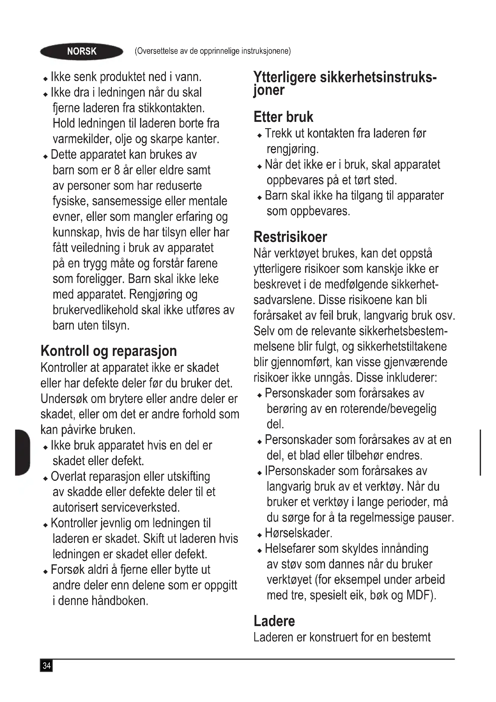 Advarsel! Les alle sikkerhetsadvarsler og alle instruksjoner . Hvis advarslene og anvisningene nedenfor ikke overholdes, kan det medføre elektrisk støt, brann og/eller alvorlige personskader. u Beregnet bruk er beskrevet i denne håndboken. Hvis du bruker annet tilbehør, kobler til annet utstyr eller bruker dette apparatet til andre oppgaver enn det som er anbefalt i denne håndboken, kan det føre til fare for personskade. u Ta vare på denne håndboken for fremtidig bruk. Bruke produktet u Ikke bruk apparatet til å suge opp væske eller materialer som kan ta fyr.34 (Oversettelse av de opprinnelige instruksjonene) NORSK u Ikke senk produktet ned i vann.u Ikke dra i ledningen når du skal fjerne laderen fra stikkontakten. Hold ledningen til laderen borte fra varmekilder, olje og skarpe kanter. u Dette apparatet kan brukes av barn som er 8 år eller eldre samt av personer som har reduserte fysiske, sansemessige eller mentale evner, eller som mangler erfaring og kunnskap, hvis de har tilsyn eller har fått veiledning i bruk av apparatet på en trygg måte og forstår farene som foreligger. Barn skal ikke leke med apparatet. Rengjøring og brukervedlikehold skal ikke utføres av barn uten tilsyn. Kontroll og reparasjon Kontroller at apparatet ikke er skadet eller har defekte deler før du bruker det. Undersøk om brytere eller andre deler er skadet, eller om det er andre forhold som kan påvirke bruken. u Ikke bruk apparatet hvis en del er skadet eller defekt. u Overlat reparasjon eller utskifting av skadde eller defekte deler til et autorisert serviceverksted. u Kontroller jevnlig om ledningen til laderen er skadet. Skift ut laderen hvis ledningen er skadet eller defekt. u Forsøk aldri å fjerne eller bytte ut andre deler enn delene som er oppgitt i denne håndboken. Ytterligere sikkerhetsinstruks- joner Etter bruk u Trekk ut kontakten fra laderen før rengjøring. u Når det ikke er i bruk, skal apparatet oppbevares på et tørt sted. u Barn skal ikke ha tilgang til apparater som oppbevares. Restrisikoer Når verktøyet brukes, kan det oppstå ytterligere risikoer som kanskje ikke er beskrevet i de medfølgende sikkerhet- sadvarslene. Disse risikoene kan bli forårsaket av feil bruk, langvarig bruk osv. Selv om de relevante sikkerhetsbestem- melsene blir fulgt, og sikkerhetstiltakene blir gjennomført, kan visse gjenværende risikoer ikke unngås. Disse inkluderer: u Personskader som forårsakes av berøring av en roterende/bevegelig del. u Personskader som forårsakes av at en del, et blad eller tilbehør endres. u IPersonskader som forårsakes av langvarig bruk av et verktøy. Når du bruker et verktøy i lange perioder, må du sørge for å ta regelmessige pauser. u Hørselskader.u Helsefarer som skyldes innånding av støv som dannes når du bruker verktøyet (for eksempel under arbeid med tre, spesielt eik, bøk og MDF). Ladere Laderen er konstruert for en bestemt35 (Oversettelse av de opprinnelige instruksjonene)NORSK spenning. Kontroller alltid at nettspenningen er i overensstemmelse med spenningen på typeskiltet. Advarsel! Ikke skift ut laderen med et vanlig nettstøpsel. u Bruk din BLACK+DECKER-lader kun til lading av batteriet i apparatet som den ble levert sammen med. Andre batterier kan sprekke og føre til personskade og materiell skade. u Prøv aldri å lade ikke-oppladbare batterier. u Hvis strømledningen blir skadet, må den byttes av produsenten eller et autorisert BLACK+DECKER- servicesenter for å unngå fare. u Ikke utsett laderen for vann.u Ikke åpne laderen.u Ikke stikk gjenstander eller ngre inn i laderen. u Apparatet/batteriet må plasseres på et sted med god lufting når det lades. Elektrisk sikkerhet Symboler på laderenLes hele denne håndboken nøye før du bruker produktet. Dette verktøyet er dobbeltisolert. Jording er derfor ikke nødvendig. Kontroller alltid at strømforsyningen samsvarer med spenningen på merkeskiltet.