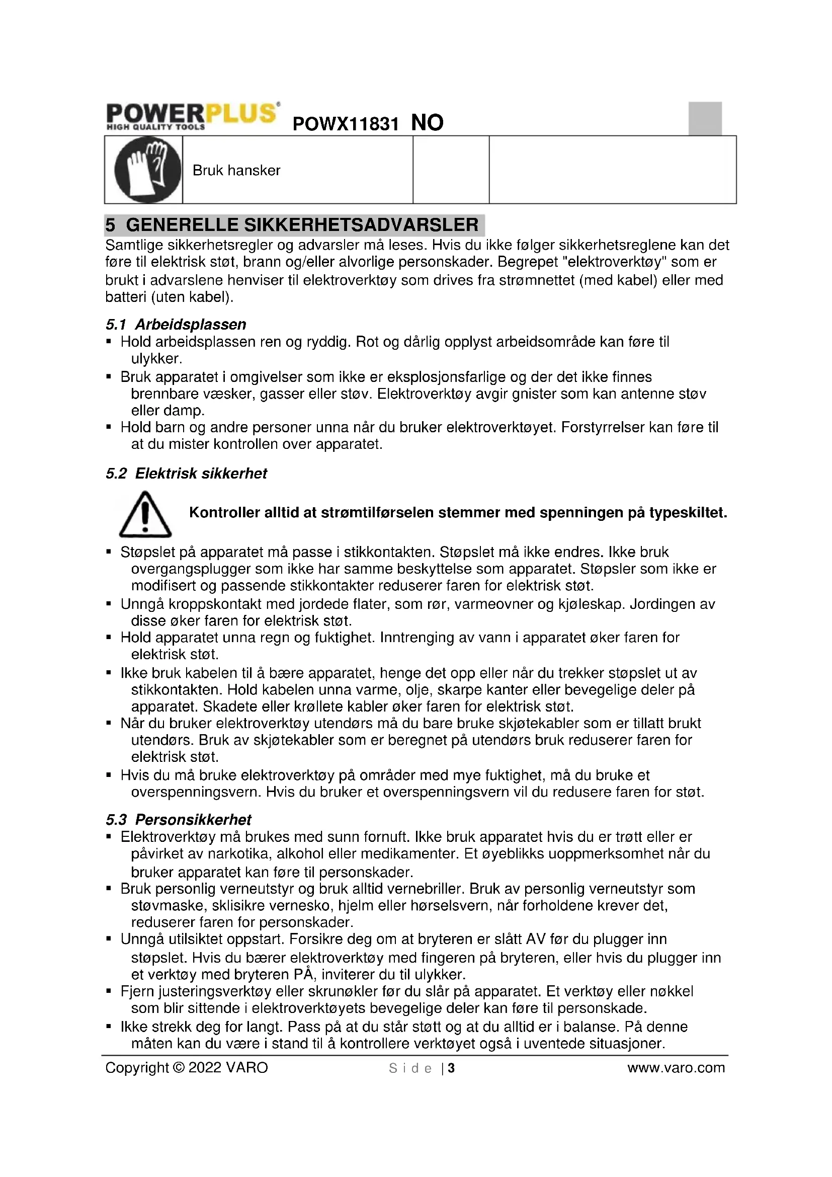 - Ikke strekk deg for langt. Pass på at du står støtt og at du alltid er i balanse. På denne måten kan du være i stand til å kontrollere verktøyet også i uventede situasjoner.POWX11831 NO Copyright © 2022 VARO S i d e | 4 www.varo.com
