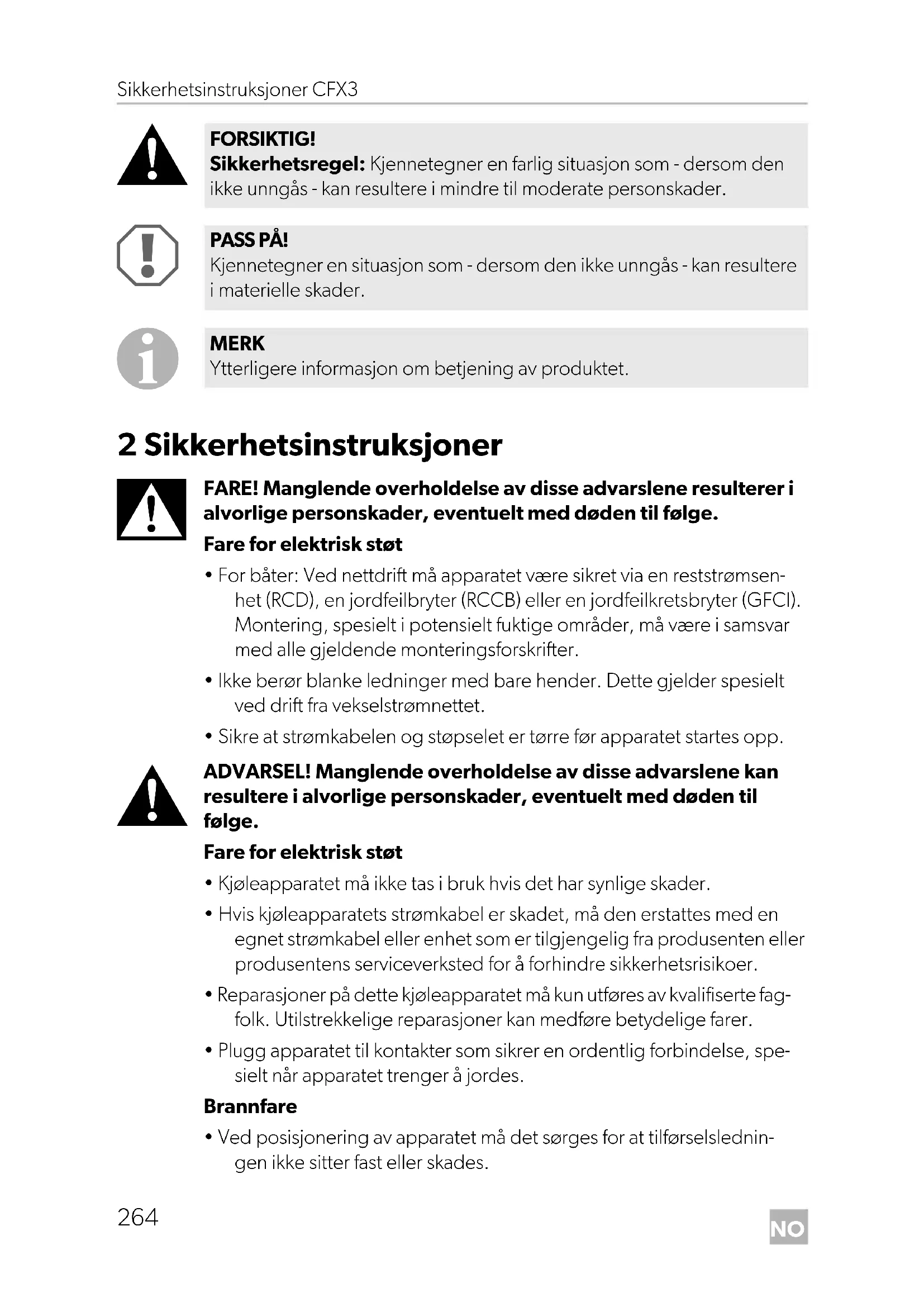 FARE! Sikkerhetsregel: Kjennetegner en farlig situasjon som - dersom den ikke unngås - resulterer i alvorlige personskader, eventuelt med døden til følge. ADVARSEL! Sikkerhetsregel: Kjennetegner en farlig situasjon som - dersom den ikke unngås - kan resultere i alvorlige personskader, eventuelt med døden til følge.NO Sikkerhetsinstruksjoner CFX3