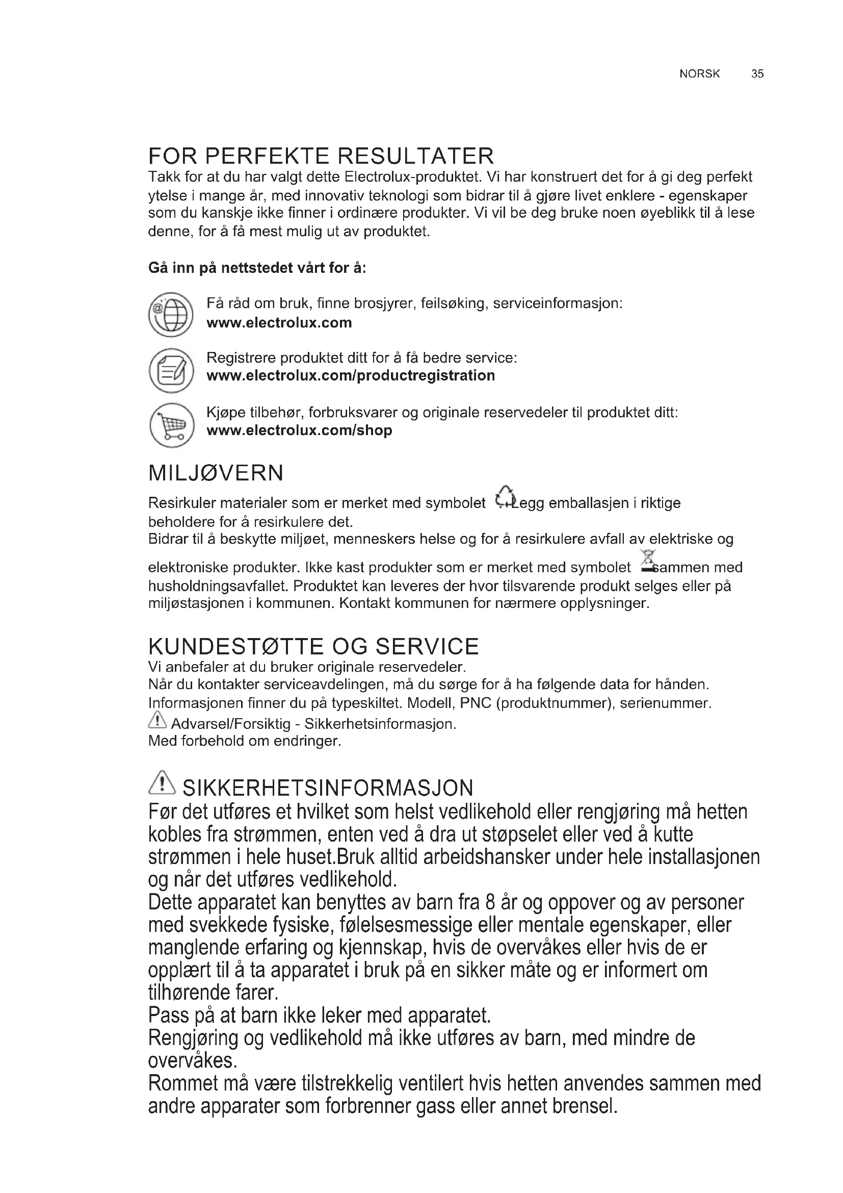 Vi anbefaler at du bruker originale reservedeler Når du kontakter serviceavdelingen, må du sørge for å ha følgende data for hånden. Informasjonen nner du på typeskiltet. Modell, PNC (produktnummer), serienummer. Advarsel/Forsiktig - Sikkerhetsinformasjon Med forbehold om endringer SIKKERHETSINFORMASJON Før det utføres et hvilket som helst vedlikehold eller rengjøring må hetten kobles fra strømmen, enten ved å dra ut støpselet eller ved å kutte strømmen i hele huset.Bruk alltid arbeidshansker under hele installasjonen og når det utføres vedlikehold. Dette apparatet kan benyttes av barn fra 8 år og oppover og av personer med svekkede fysiske, følelsesmessige eller mentale egenskaper, eller manglende erfaring og kjennskap, hvis de overvåkes eller hvis de er opplært til å ta apparatet i bruk på en sikker måte og er informert om tilhørende farer. Pass på at barn ikke leker med apparatet. Rengjøring og vedlikehold må ikke utføres av barn, med mindre de overvåkes. Rommet må være tilstrekkelig ventilert hvis hetten anvendes sammen med andre apparater som forbrenner gass eller annet brensel. NO BRUKSVEILEDNINGwww.electrolux.com36 Hetten må vaskes ofte både innvendig og utvendig (MINST EN GANG I MÅNEDEN), overhold uansett indikasjonene som er oppført i vedlikeholdsinstruksjonene i denne veiledningen. Manglende overholdelse av reglene for rengjøring av hetten og utbytting og rengjøring av lter, kan føre til brann. Det er strengt forbudt å lage ambert mat under hetten. Frie ammer kan skade ltrene og medføre brann og må derfor alltid unngås. Frityrsteking må overvåkes for å unngå at oljen blir for varm og antennes. Vær oppmerksom! Hettens tilgjengelige deler kan bli varme når koketoppen er i drift. Bruk kun samme type lyspære som indikeres i avsnittet vedlikehold/ utbytting av lyspære i denne veiledningen når lyspæren skal byttes ut. Vær oppmerksom! Ikke kobl apparatet til strømnettet før installasjonen er helt ferdig. Når hetten skal kobles til strømnettet er det kun tillatt med sertiserte elektriske adaptere, og ikke skjøtekontakter eller grenuttak.