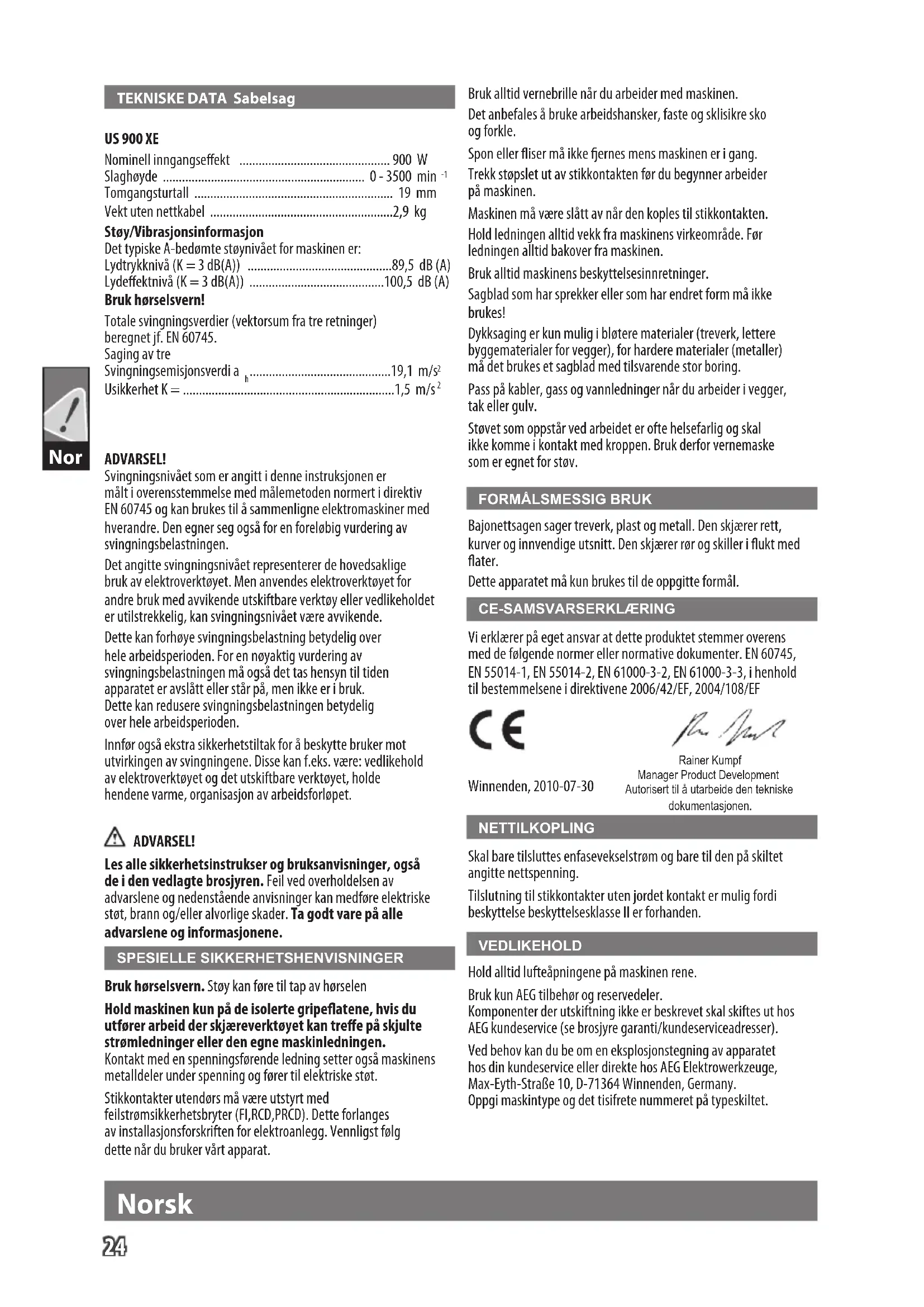 Bajonettsagen sager treverk, plast og metall. Den skjærer rett, kurver og innvendige utsnitt. Den skjærer rør og skiller i ukt med ater. Dette apparatet må kun brukes til de oppgitte formål. CE-SAMSVARSERKLÆRING Vi erklærer på eget ansvar at dette produktet stemmer overens med de følgende normer eller normative dokumenter. EN 60745, EN 55014-1, EN 55014-2, EN 61000-3-2, EN 61000-3-3, i henhold til bestemmelsene i direktivene 2006/42/EF, 2004/108/EF Rainer KumpfManager Product Development Autorisert til å utarbeide den tekniske dokumentasjonen. Winnenden, 2010-07-30 NETTILKOPLING Skal bare tilsluttes enfasevekselstrøm og bare til den på skiltet angitte nettspenning. Tilslutning til stikkontakter uten jordet kontakt er mulig fordi beskyttelse beskyttelsesklasse II er forhanden. VEDLIKEHOLD Hold alltid lufteåpningene på maskinen rene. Bruk kun AEG tilbehør og reservedeler. Komponenter der utskiftning ikke er beskrevet skal skiftes ut hos AEG kundeservice (se brosjyre garanti/kundeserviceadresser). Ved behov kan du be om en eksplosjonstegning av apparatet hos din kundeservice eller direkte hos AEG Elektrowerkzeuge, Max-Eyth-Straße10, D-71364Winnenden, Germany. Oppgi maskintype og det tisifrete nummeret på typeskiltet. ADVARSEL! Svingningsnivået som er angitt i denne instruksjonen er målt i overensstemmelse med målemetoden normert i direktiv EN 60745 og kan brukes til å sammenligne elektromaskiner med hverandre. Den egner seg også for en foreløbig vurdering av svingningsbelastningen. Det angitte svingningsnivået representerer de hovedsaklige bruk av elektroverktøyet. Men anvendes elektroverktøyet for andre bruk med avvikende utskiftbare verktøy eller vedlikeholdet er utilstrekkelig, kan svingningsnivået være avvikende. Dette kan forhøye svingningsbelastning betydelig over hele arbeidsperioden. For en nøyaktig vurdering av svingningsbelastningen må også det tas hensyn til tiden apparatet er avslått eller står på, men ikke er i bruk. Dette kan redusere svingningsbelastningen betydelig over hele arbeidsperioden. Innfør også ekstra sikkerhetstiltak for å beskytte bruker mot utvirkingen av svingningene. Disse kan f.eks. være: vedlikehold av elektroverktøyet og det utskiftbare verktøyet, holde hendene varme, organisasjon av arbeidsforløpet. ADVARSEL! Les alle sikkerhetsinstrukser og bruksanvisninger, også de i den vedlagte brosjyren. Feil ved overholdelsen av advarslene og nedenstående anvisninger kan medføre elektriske støt, brann og/eller alvorlige skader. Ta godt vare på alle advarslene og informasjonene. SPESIELLE SIKKERHETSHENVISNINGER Bruk hørselsvern. Støy kan føre til tap av hørselen Hold maskinen kun på de isolerte gripeatene, hvis du utfører arbeid der skjæreverktøyet kan tree på skjulte strømledninger eller den egne maskinledningen. Kontakt med en spenningsførende ledning setter også maskinens metalldeler under spenning og fører til elektriske støt. Stikkontakter utendørs må være utstyrt med feilstrømsikkerhetsbryter (FI,RCD,PRCD). Dette forlanges av installasjonsforskriften for elektroanlegg. Vennligst følg dette når du bruker vårt apparat. US 900 XE Nominell inngangseekt ............................................... 900 W Slaghøyde ............................................................... 0 - 3500 min