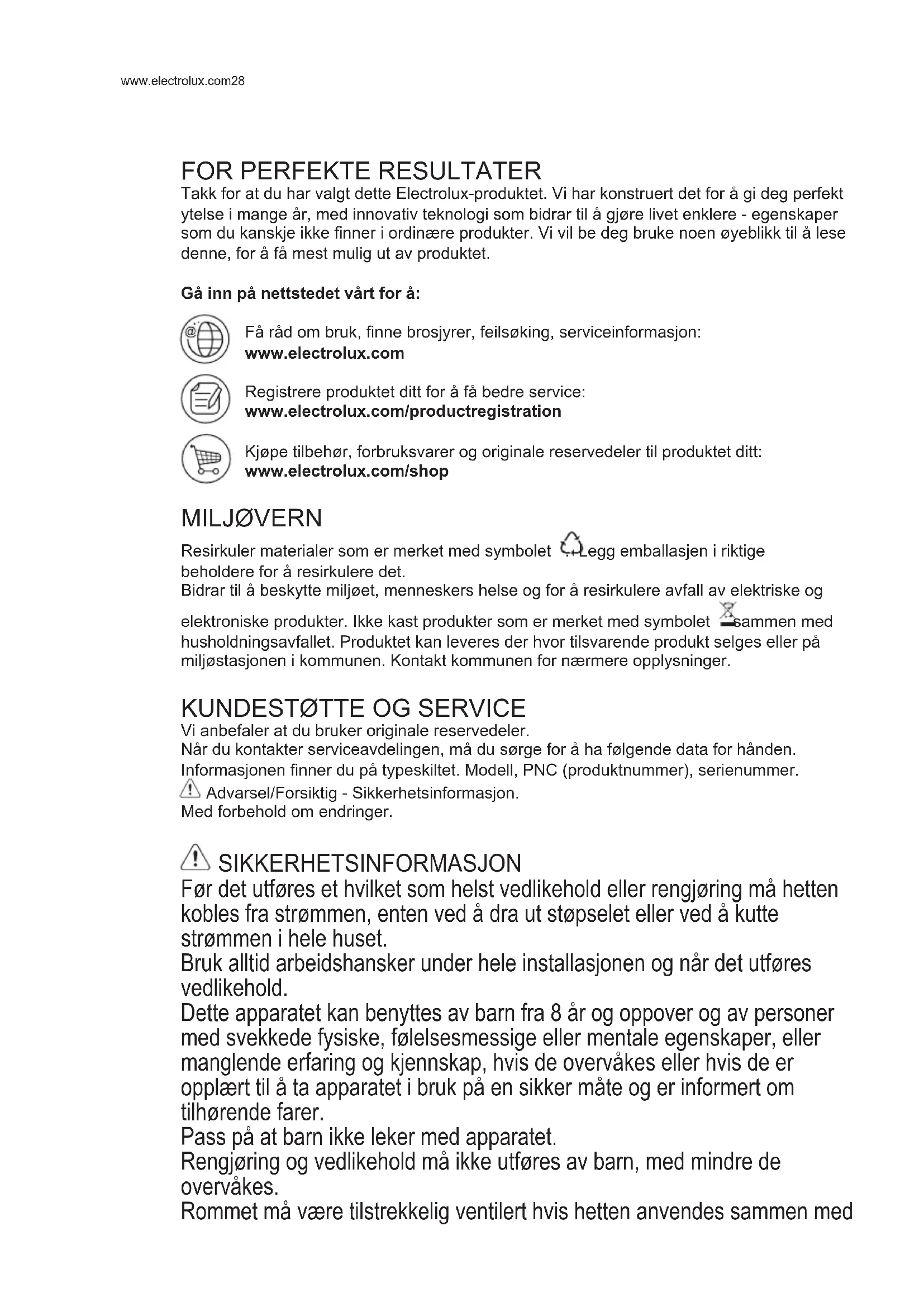Takk for at du har valgt dette Electrolux-produktet. Vi har konstruert det for å gi deg perfekt ytelse i mange år, med innovativ teknologi som bidrar til å gjøre livet enklere - egenskaper som du kanskje ikke nner i ordinære produkter. Vi vil be deg bruke noen øyeblikk til å lese denne, for å få mest mulig ut av produktet. Gå inn på nettstedet vårt for å: Få råd om bruk, nne brosjyrer, feilsøking, serviceinformasjon: www.electrolux.com Registrere produktet ditt for å få bedre service: www.electrolux.com/productregistration Kjøpe tilbehør, forbruksvarer og originale reservedeler til produktet ditt: www.electrolux.com/shop MILJØVERN Resirkuler materialer som er merket med symbolet Legg emballasjen i riktige beholdere for å resirkulere det. Bidrar til å beskytte miljøet, menneskers helse og for å resirkulere avfall av elektriske og elektroniske produkter Ikke kast produkter som er merket med symbolet sammen med husholdningsavfallet. Produktet kan leveres der hvor tilsvarende produkt selges eller på miljøstasjonen i kommunen. Kontakt kommunen for nærmere opplysninger.