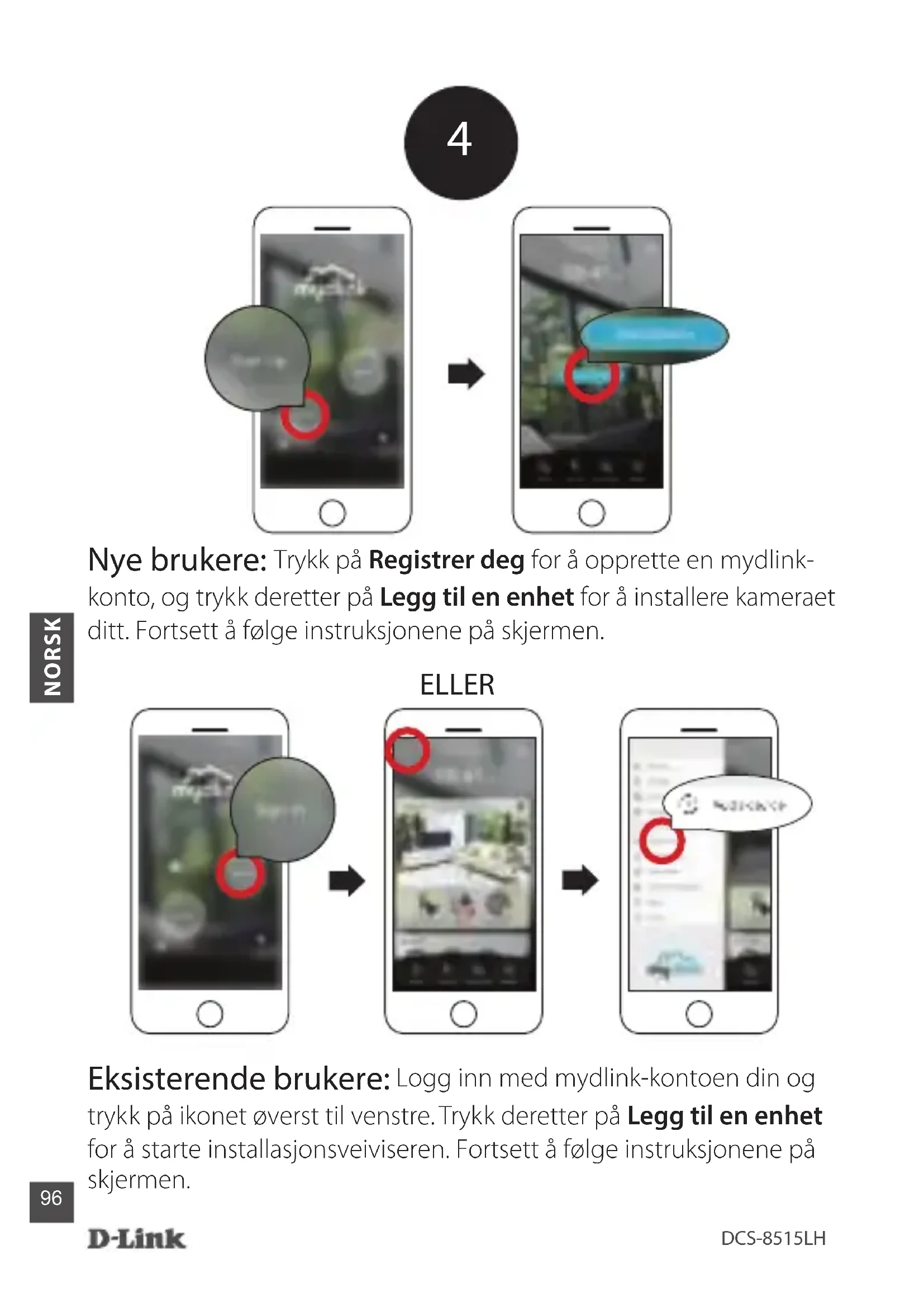 Eksisterende brukere: Logg inn med mydlink-kontoen din og trykk på ikonet øverst til venstre. Trykk deretter på Legg til en enhet for å starte installasjonsveiviseren. Fortsett å følge instruksjonene på skjermen. ELLER Nye brukere: Trykk på Registrer deg for å opprette en mydlink- konto, og trykk deretter på Legg til en enhet for å installere kameraet ditt. Fortsett å følge instruksjonene på skjermen.97 DCS-8515LH NORSK