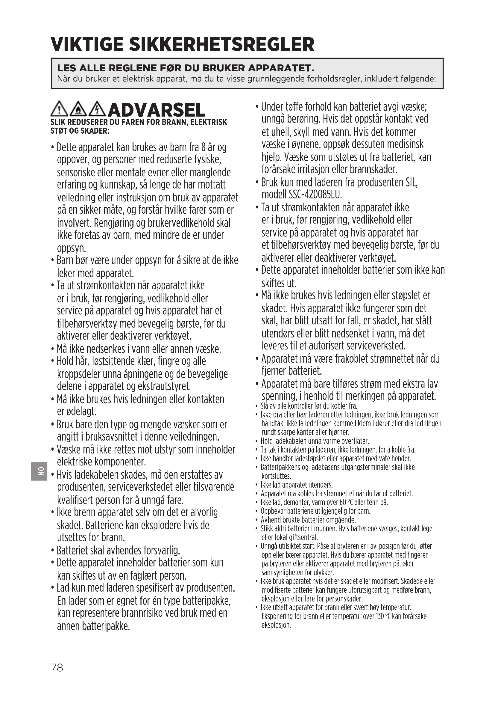- Bruk kun med laderen fra produsenten SIL, modell SSC-420085EU.
