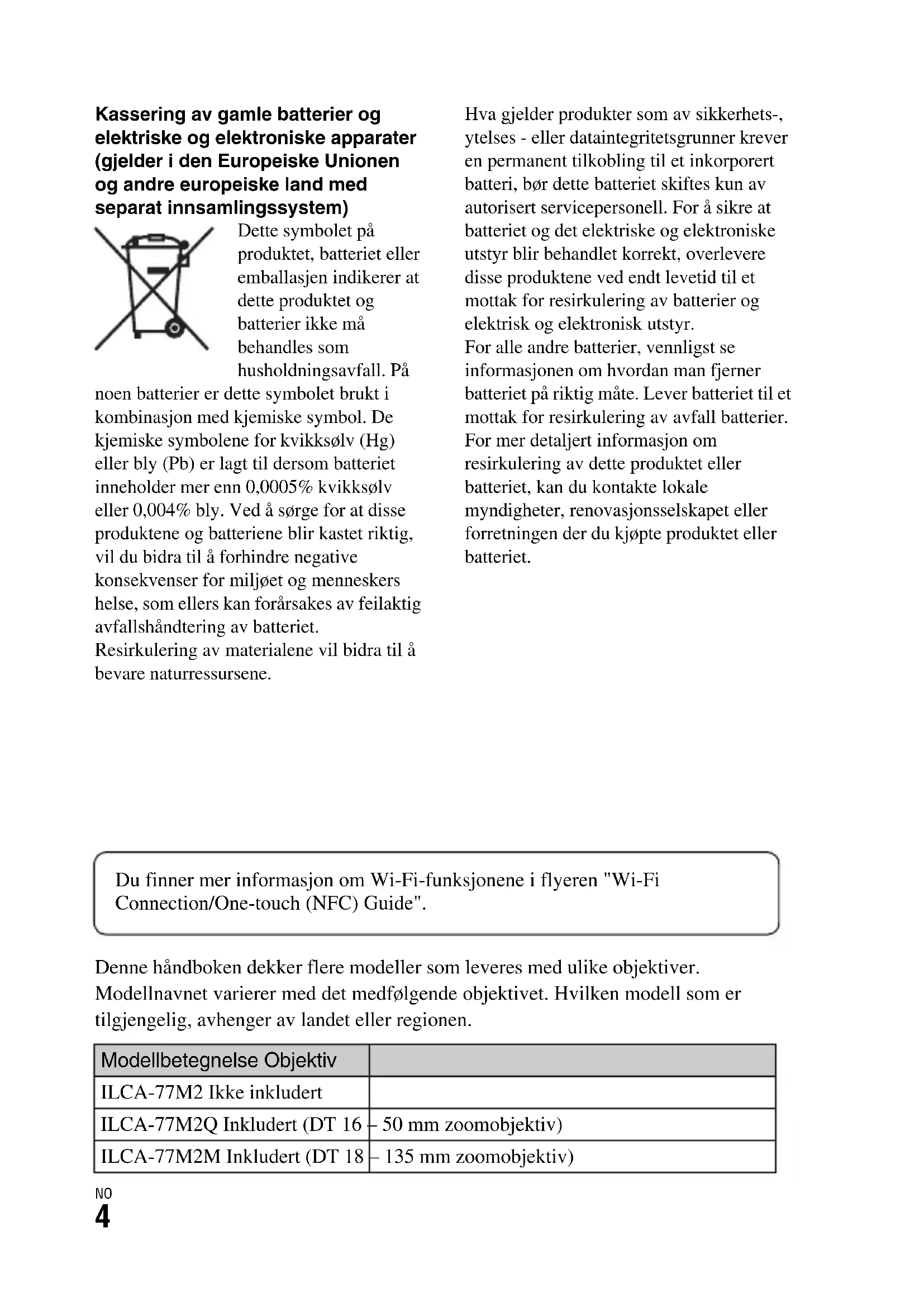 Kassering av gamle batterier og elektriske og elektroniske apparater (gjelder i den Europeiske Unionen og andre europeiske land med separat innsamlingssystem) Dette symbolet på produktet, batteriet eller emballasjen indikerer at dette produktet og batterier ikke må behandles som husholdningsavfall. På noen batterier er dette symbolet brukt i kombinasjon med kjemiske symbol. De kjemiske symbolene for kvikksølv (Hg) eller bly (Pb) er lagt til dersom batteriet inneholder mer enn 0,0005% kvikksølv eller 0,004% bly. Ved å sørge for at disse produktene og batteriene blir kastet riktig, vil du bidra til å forhindre negative konsekvenser for miljøet og menneskers helse, som ellers kan forårsakes av feilaktig avfallshåndtering av batteriet. Resirkulering av materialene vil bidra til å bevare naturressursene. Hva gjelder produkter som av sikkerhets-, ytelses - eller dataintegritetsgrunner krever en permanent tilkobling til et inkorporert batteri, bør dette batteriet skiftes kun av autorisert servicepersonell. For å sikre at batteriet og det elektriske og elektroniske utstyr blir behandlet korrekt, overlevere disse produktene ved endt levetid til et mottak for resirkulering av batterier og elektrisk og elektronisk utstyr. For alle andre batterier, vennligst se informasjonen om hvordan man fjerner batteriet på riktig måte. Lever batteriet til et mottak for resirkulering av avfall batterier. For mer detaljert informasjon om resirkulering av dette produktet eller batteriet, kan du kontakte lokale myndigheter, renovasjonsselskapet eller forretningen der du kjøpte produktet eller batteriet. Du finner mer informasjon om Wi-Fi-funksjonene i flyeren "Wi-Fi Connection/One-touch (NFC) Guide". Denne håndboken dekker flere modeller som leveres med ulike objektiver. Modellnavnet varierer med det medfølgende objektivet. Hvilken modell som er tilgjengelig, avhenger av landet eller regionen. Modellbetegnelse Objektiv ILCA-77M2 Ikke inkludert ILCA-77M2Q Inkludert (DT 16 – 50 mm zoomobjektiv) ILCA-77M2M Inkludert (DT 18 – 135 mm zoomobjektiv)NO
