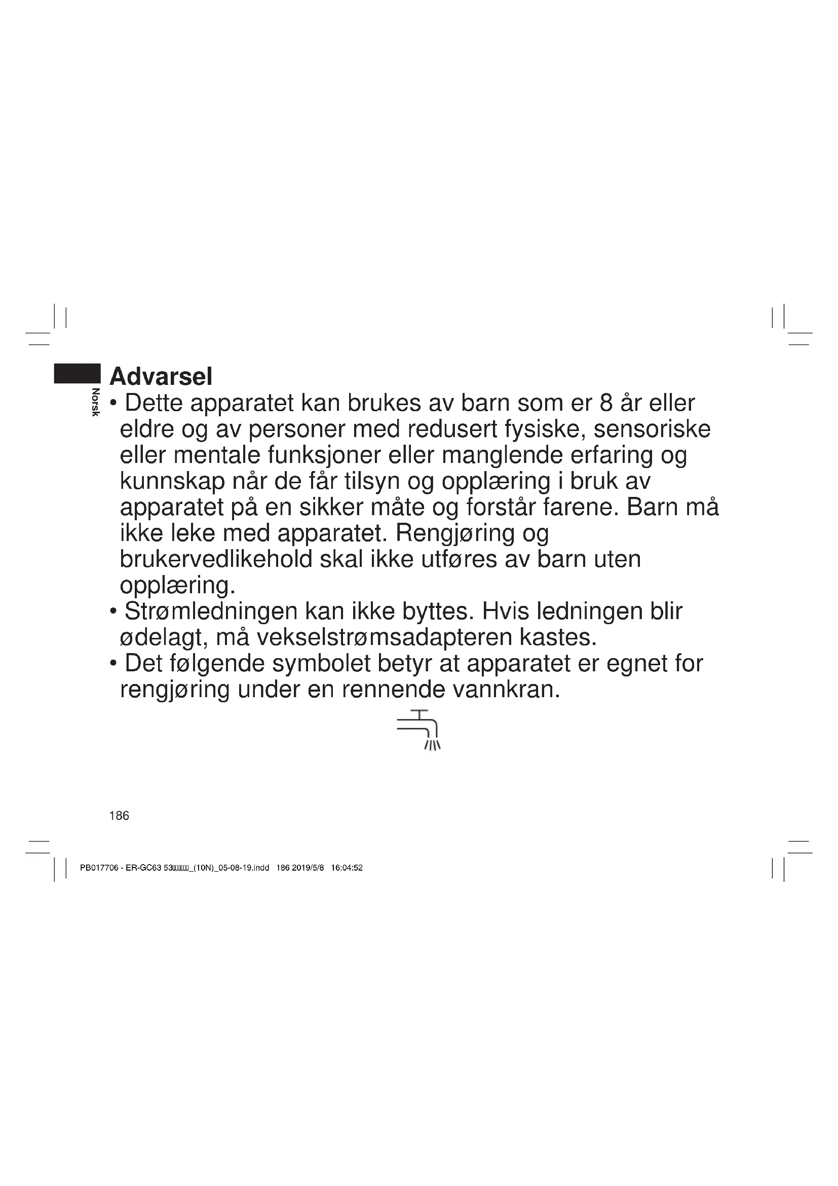 - Det følgende symbolet betyr at apparatet er egnet for rengjøring under en rennende vannkran. PB017706 - ER-GC63 53_(10N)_05-08-19.indd 186 2019/5/8 16:04:52187 Norsk