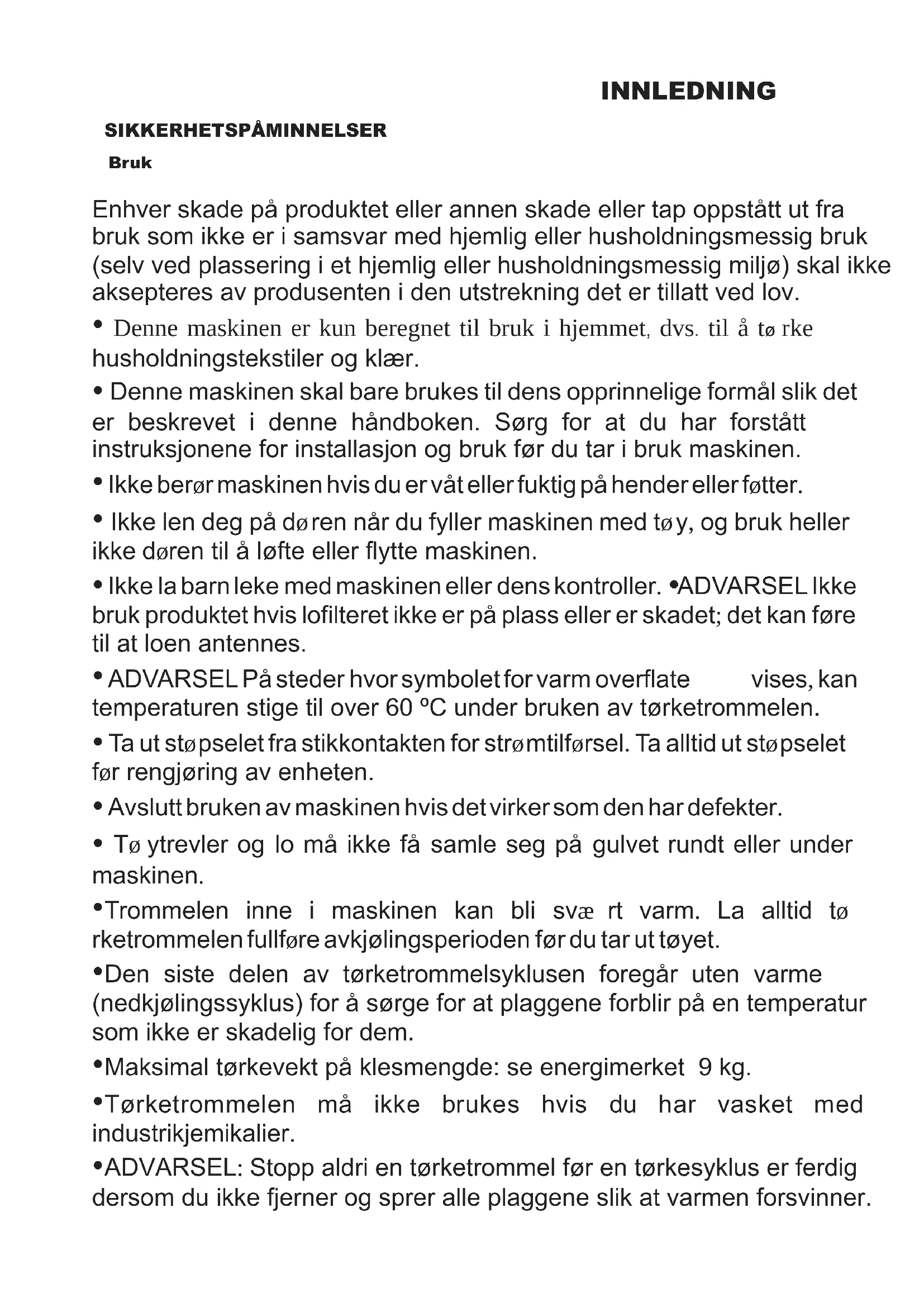 Innledning Leveringsinformasjon Sikkerhetspåminnelser Bruk Installasjon Tøyet Miljømessige hensyn GIAS Service Installasjon Elektriske krav Justere føttene Avløpsslange: Monteringsveiledning Gjøre klart tøyet Sjekk av tøyet før tørking Sortering av tøyet Ikke bruk tørketrommel Energisparing Tørkeguide Kontrollpanel og indikatorlamper Velge program Dør og filter Åpne døren Filter Indikator for filtervedlikehold Vannbeholder Slik fjerner du beholderen Kondensator Slik fjerner du kondensatoren Drift Avbryte og nullstille programmet Startforsinkelse Rengjøring og rutinemessig vedlikehold Tekniske spesifikasjoner Rengjøring av tørketrommelen Feilsøking Kundeservice Reservedeler GIAS Service Ventilasjon INDEKS NO 30INNLEDNING Bruk SIKKERHETSPÅMINNELSER Enhver skade på produktet eller annen skade eller tap oppstått ut fra bruk som ikke er i samsvar med hjemlig eller husholdningsmessig bruk (selv ved plassering i et hjemlig eller husholdningsmessig miljø) skal ikke aksepteres av produsenten i den utstrekning det er tillatt ved lov. Denne maskinen er kun beregnet til bruk i hjemmet, dvs. til å tø rke husholdningstekstiler og klær. Denne maskinen skal bare brukes til dens opprinnelige formål slik det er beskrevet i denne håndboken. Sørg for at du har forstått instruksjonene for installasjon og bruk før du tar i bruk maskinen. Ikke berør maskinen hvis du er våt eller fuktig på hender eller føtter. Ikke len deg på døren når du fyller maskinen med tøy, og bruk heller ikke døren til å løfte eller flytte maskinen. Ikke la barn leke med maskinen eller dens kontroller. ADVARSEL Ikke bruk produktet hvis lofilteret ikke er på plass eller er skadet; det kan føre til at loen antennes. ADVARSEL På steder hvor symbolet for varm overflate vises, kan temperaturen stige til over 60 ºC under bruken av tørketrommelen. Ta ut støpselet fra stikkontakten for strømtilførsel. Ta alltid ut støpselet før rengjøring av enheten. Avslutt bruken av maskinen hvis det virker som den har defekter. Tø ytrevler og lo må ikke få samle seg på gulvet rundt eller under maskinen. Trommelen inne i maskinen kan bli svæ rt varm. La alltid tø rketrommelen fullføre avkjølingsperioden før du tar ut tøyet. Den siste delen av tørketrommelsyklusen foregår uten varme (nedkjølingssyklus) for å sørge for at plaggene forblir på en temperatur som ikke er skadelig for dem. Maksimal tørkevekt på klesmengde: se energimerket 9 kg. Tørketrommelen må ikke brukes hvis du har vasket med industrikjemikalier. ADVARSEL: Stopp aldri en tørketrommel før en tørkesyklus er ferdig dersom du ikke fjerner og sprer alle plaggene slik at varmen forsvinner.