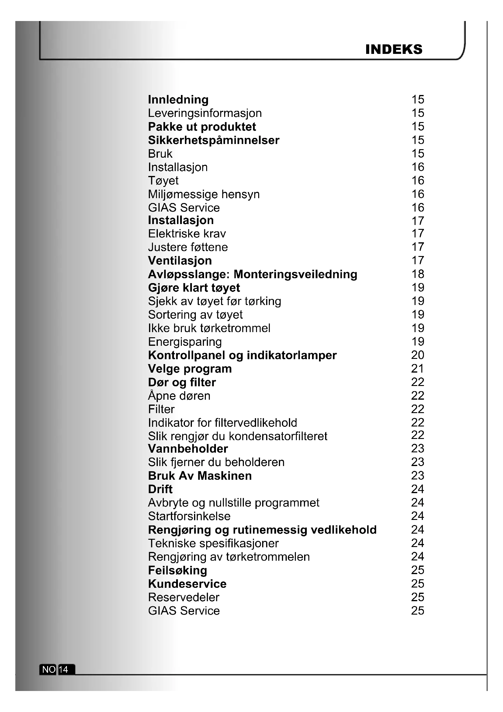 Innledning Leveringsinformasjon Pakke ut produktet Sikkerhetspåminnelser Bruk Installasjon Tøyet Miljømessige hensyn GIAS Service Installasjon Elektriske krav Justere føttene Ventilasjon Avløpsslange: Monteringsveiledning Gjøre klart tøyet Sjekk av tøyet før tørking Sortering av tøyet Ikke bruk tørketrommel Energisparing Kontrollpanel og indikatorlamper Velge program Dør og filter Åpne døren Filter Indikator for filtervedlikehold Vannbeholder Slik fjerner du beholderen Bruk Av Maskinen Drift Avbryte og nullstille programmet Startforsinkelse Rengjøring og rutinemessig vedlikehold Tekniske spesifikasjoner Rengjøring av tørketrommelen Feilsøking Kundeservice Reservedeler GIAS Service Slik rengjør du kondensatorfilteret INDEKS NO 14INNLEDNING Bruk Vennligst kontroller at følgende artikler fulgte med maskinen ved levering: ● Instruksjonsbok ● Garantikort ● Energimerke P a k k u t m a s k i n e n i nærheten av det stedet der den skal plasseres.