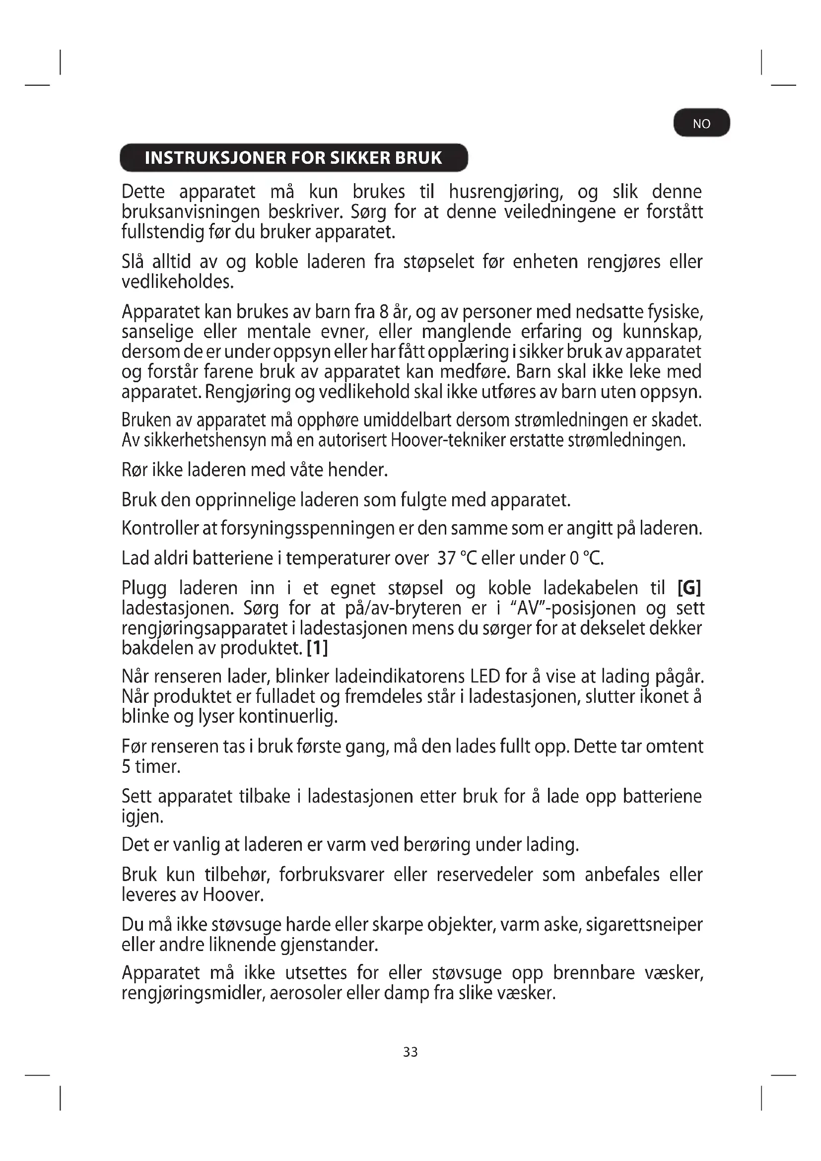 Dette apparatet må kun brukes til husrengjøring, og slik denne bruksanvisningen beskriver. Sørg for at denne veiledningene er forstått fullstendig før du bruker apparatet. Slå alltid av og koble laderen fra støpselet før enheten rengjøres eller vedlikeholdes. Apparatet kan brukes av barn fra 8 år, og av personer med nedsatte fysiske, sanselige eller mentale evner, eller manglende erfaring og kunnskap, dersom de er under oppsyn eller har fått opplæring i sikker bruk av apparatet og forstår farene bruk av apparatet kan medføre. Barn skal ikke leke med apparatet. Rengjøring og vedlikehold skal ikke utføres av barn uten oppsyn. Bruken av apparatet må opphøre umiddelbart dersom strømledningen er skadet. Av sikkerhetshensyn må en autorisert Hoover-tekniker erstatte strømledningen. Rør ikke laderen med våte hender. Bruk den opprinnelige laderen som fulgte med apparatet. Kontroller at forsyningsspenningen er den samme som er angitt på laderen. Lad aldri batteriene i temperaturer over 37 °C eller under 0 °C. Plugg laderen inn i et egnet støpsel og koble ladekabelen til [G] ladestasjonen. Sørg for at på/av-bryteren er i “AV”-posisjonen og sett rengjøringsapparatet i ladestasjonen mens du sørger for at dekselet dekker bakdelen av produktet. [1] Når renseren lader, blinker ladeindikatorens LED for å vise at lading pågår. Når produktet er fulladet og fremdeles står i ladestasjonen, slutter ikonet å blinke og lyser kontinuerlig. Før renseren tas i bruk første gang, må den lades fullt opp. Dette tar omtent 5 timer. Sett apparatet tilbake i ladestasjonen etter bruk for å lade opp batteriene igjen. Det er vanlig at laderen er varm ved berøring under lading. Bruk kun tilbehør, forbruksvarer eller reservedeler som anbefales eller leveres av Hoover. Du må ikke støvsuge harde eller skarpe objekter, varm aske, sigarettsneiper eller andre liknende gjenstander. Apparatet må ikke utsettes for eller støvsuge opp brennbare væsker, rengjøringsmidler, aerosoler eller damp fra slike væsker. NO34 Ikke fortsett å bruke rengjøringsapparatet eller laderen hvis det virker som om det er noe feil med dem. Hoover-service: For å sikre at apparatet fortsatt virker som det skal, og er trygt å bruke, anbefaler vi at all service og alle reparasjoner blir utført av en autorisert Hoover-tekniker. Du må ikke bruke apparatet til å rengjøre dyr eller mennesker. Hold hender, føtter, løse klær og hår unna roterende børster. Rengjør støvbeholderen og lterinnretningen jevnlig. Ikke koble fra laderen ved å trekke i ledningen. Koble fra laderen dersom du er borte over langre tid (f.eks. ferie). Produktet bør lades opp igjen før bruk, da batteriene kan selvutløses ved lengre tids lagring. Statisk elektrisitet: Enkelte tepper kan bygge opp små mengder statisk elektrisitet. Utladning av statisk elektrisitet er ikke helseskadelig. Du må ikke bruke apparatet utendørs, på våte overater eller til å støvsuge væske. Utskifting av batteri Av sikkerhetsgrunner kAn lithium-ion-batteriene i dette rengjøringspparatet kun skiftes ut av en reparatør fra Hoover. Når batteriene ikke lenger kan lades opp, bør du kontakte Hoover kundeservice for å få dem skiftet ut. Ikke erstatt batteriene med ikke-oppladbare batterier. Avhending av batterier ved utgangen av produktetslevetid Hvis apparatet skal avhendes, bør batteriene ernes først. Apparatet må være frakoblet strømnettet når du erner batteriet. Kast batteriene på en trygg måte. Brukte batterier bør leveres til en gjenbruksstasjon, og ikke kastes sammen med husholdningsavfall. For å erne batteriene, bør du kontakte Hoovers kundesenter, eller fortsette som anvist nedenfor: VIKTIG: Tøm alltid batteriene helt før erning, og kontroller at laderen er koblet fra. La rengjøringsapparatet gå til batteriene er helt tømt. Ta frontdekselet og toppdekselet av enheten. Skru løs 7 skruer og åpne enheten. Skru løs 6 skruer og åpne batteripakken. Kutt ledningene til batteriene én etter én for å forhindre kortslutning. MERK: Hvis du har vanskeligheter med å demontere enheten eller ønsker mer detaljert informasjon om behandling, gjenvinning og resirkulering av apparatet, ta kontakt med kommunen eller renovasjonsselskapet. NO35 FUNKSJONER LAGRING/LADING Enhetslagring Produktet er designet til å sitte i ladestasjonen på en at overate eller vertikalt hvis den er montert på vegg. [1] For å sikre en ryddig oppbevaring, vikler du overødig ledning på baksiden av laderen og la enden av ledningen være enten under eller på siden. Hvordan montere på vegg (Nødvendige verktøy: skrutrekker og drill)