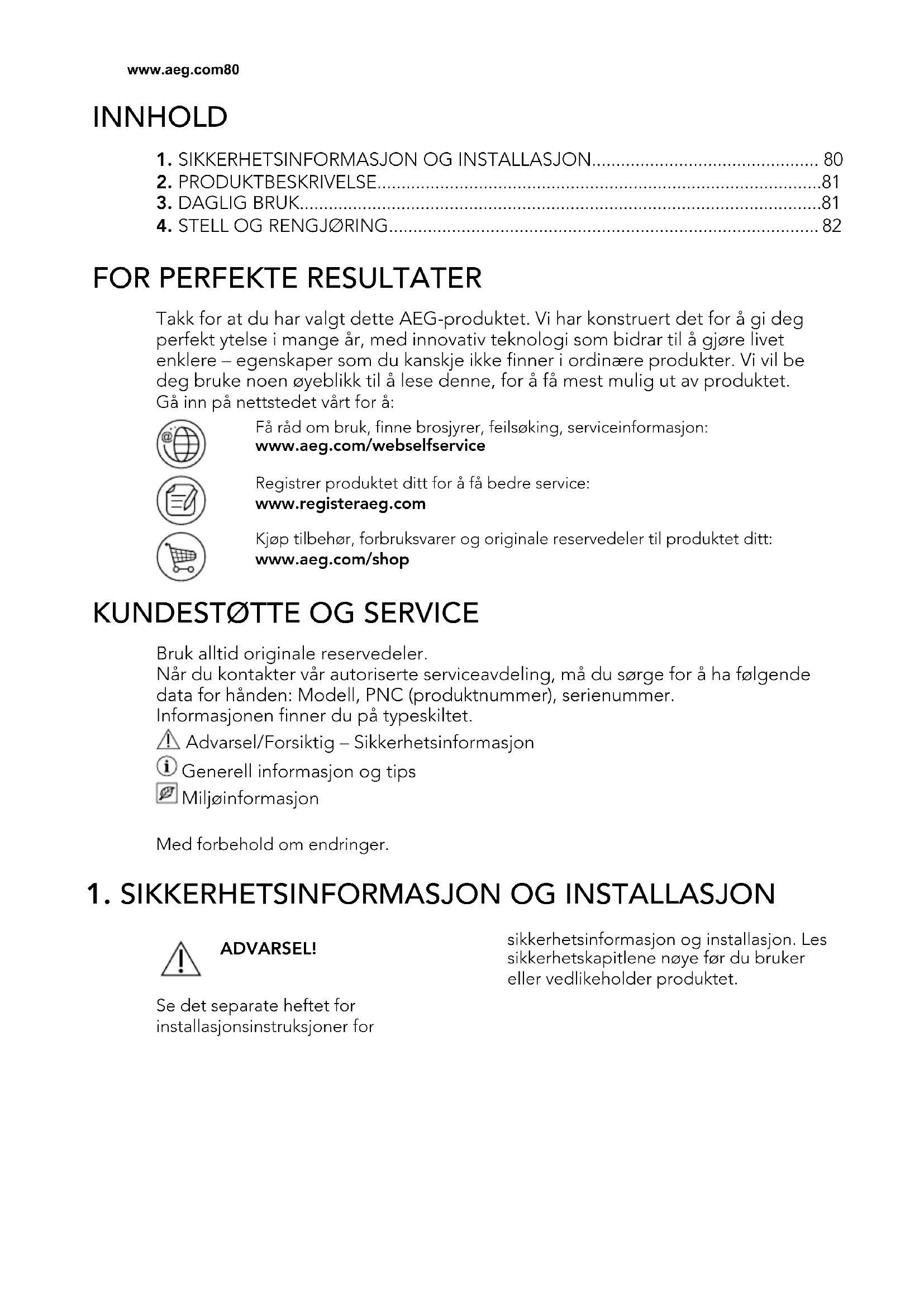 Takk for at du har valgt dette AEG-produktet. Vi har konstruert det for å gi deg perfekt ytelse i mange år, med innovativ teknologi som bidrar til å gjøre livet enklere – egenskaper som du kanskje ikke finner i ordinære produkter. Vi vil be deg bruke noen øyeblikk til å lese denne, for å få mest mulig ut av produktet. Gå inn på nettstedet vårt for å: Få råd om bruk, finne brosjyrer, feilsøking, serviceinformasjon: www.aeg.com/webselfservice Registrer produktet ditt for å få bedre service: www.registeraeg.com Kjøp tilbehør, forbruksvarer og originale reservedeler til produktet ditt: www.aeg.com/shop