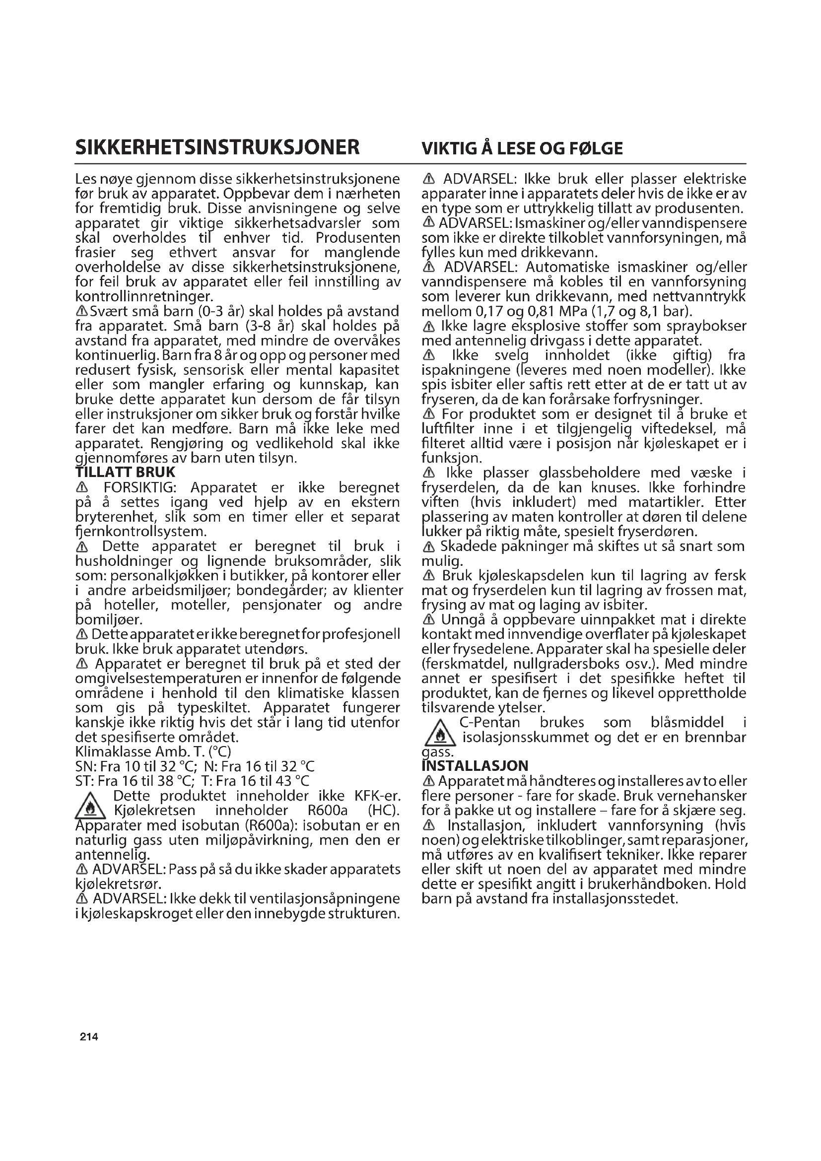 - ETTERSALGSSERVICE For å motta en mer fullstendig hjelp registrer produktet ditt på www.whirlpool.eu/register.214 SIKKERHETSINSTRUKSJONER Les nøye gjennom disse sikkerhetsinstruksjonene før bruk av apparatet. Oppbevar dem i nærheten for fremtidig bruk. Disse anvisningene og selve apparatet gir viktige sikkerhetsadvarsler som skal overholdes til enhver tid. Produsenten frasier seg ethvert ansvar for manglende overholdelse av disse sikkerhetsinstruksjonene, for feil bruk av apparatet eller feil innstilling av kontrollinnretninger. Svært små barn (0-3 år) skal holdes på avstand fra apparatet. Små barn (3-8 år) skal holdes på avstand fra apparatet, med mindre de overvåkes kontinuerlig. Barn fra 8 år og opp og personer med redusert fysisk, sensorisk eller mental kapasitet eller som mangler erfaring og kunnskap, kan bruke dette apparatet kun dersom de får tilsyn eller instruksjoner om sikker bruk og forstår hvilke farer det kan medføre. Barn må ikke leke med apparatet. Rengjøring og vedlikehold skal ikke gjennomføres av barn uten tilsyn. TILLATT BRUK FORSIKTIG: Apparatet er ikke beregnet på å settes igang ved hjelp av en ekstern bryterenhet, slik som en timer eller et separat ernkontrollsystem. Dette apparatet er beregnet til bruk i husholdninger og lignende bruksområder, slik som: personalkjøkken i butikker, på kontorer eller i andre arbeidsmiljøer; bondegårder; av klienter på hoteller, moteller, pensjonater og andre bomiljøer. Dette apparatet er ikke beregnet for profesjonell bruk. Ikke bruk apparatet utendørs. Apparatet er beregnet til bruk på et sted der omgivelsestemperaturen er innenfor de følgende områdene i henhold til den klimatiske klassen som gis på typeskiltet. Apparatet fungerer kanskje ikke riktig hvis det står i lang tid utenfor det spesiserte området. Klimaklasse Amb. T. (°C) SN: Fra 10 til 32 °C; N: Fra 16 til 32 °C ST: Fra 16 til 38 °C; T: Fra 16 til 43 °C Dette produktet inneholder ikke KFK-er. Kjølekretsen inneholder R600a (HC). Apparater med isobutan (R600a): isobutan er en naturlig gass uten miljøpåvirkning, men den er antennelig. ADVARSEL: Pass på så du ikke skader apparatets kjølekretsrør. ADVARSEL: Ikke dekk til ventilasjonsåpningene i kjøleskapskroget eller den innebygde strukturen. p. 234