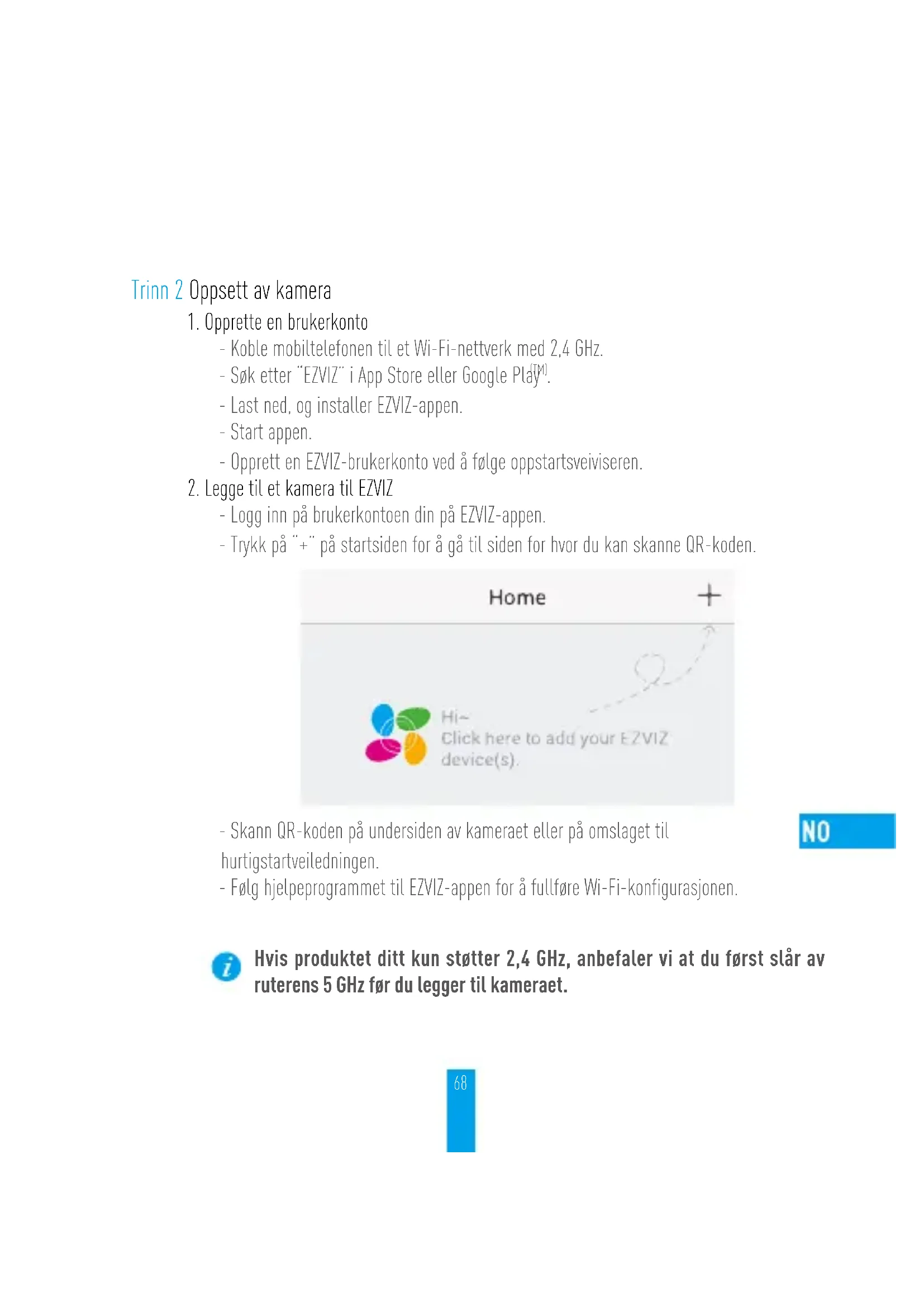- Last ned, og installer EZVIZ-appen. - Start appen. - Opprett en EZVIZ-brukerkonto ved å følge oppstartsveiviseren.