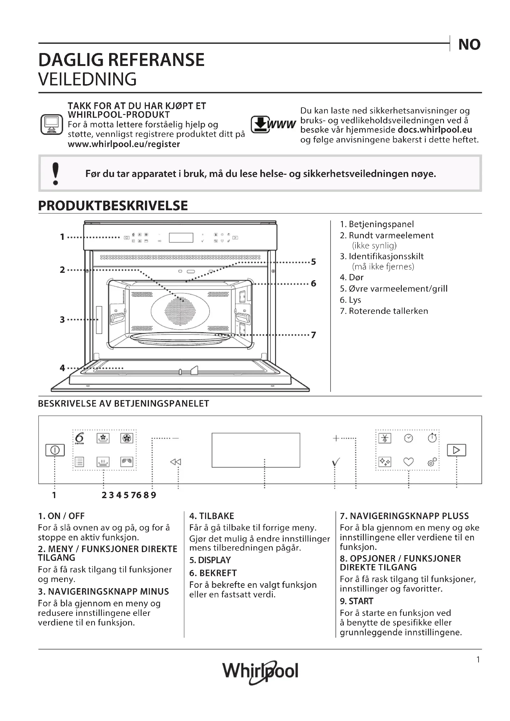 DAGLIG REFERANSE VEILEDNING TAKK FOR AT DU HAR KJØPT ET WHIRLPOOLPRODUKTFor å motta lettere forståelig hjelp og støtte, vennligst registrere produktet ditt på www . whirlpool . eu/ register WWW Du kan laste ned sikkerhetsanvisninger og bruks- og vedlikeholdsveiledningen ved å besøke vår hjemmeside docs . whirlpool . eu og følge anvisningene bakerst i dette heftet. Før du tar apparatet i bruk, må du lese helse- og sikkerhetsveiledningen nøye. PRODUKTBESKRIVELSE 1. Betjeningspanel2. Rundt varmeelement(ikke synlig)3. Identifikasjonsskilt(må ikke fjernes)4. Dør5. Øvre varmeelement/grill6. Lys7. Roterende tallerkenBESKRIVELSE AV BETJENINGSPANELET 2 3 4 5 76 8 91. ON / OFFFor å slå ovnen av og på, og for åstoppe en aktiv funksjon.2. MENY / FUNKSJONER DIREKTETILGANGFor å få rask tilgang til funksjoner og meny. 3. NAVIGERINGSKNAPP MINUSFor å bla gjennom en meny ogredusere innstillingene ellerverdiene til en funksjon.4. TILBAKEFår å gå tilbake til forrige meny.Gjør det mulig å endre innstillingermens tilberedningen pågår.5. DISPLAY6. BEKREFTFor å bekrefte en valgt funksjoneller en fastsatt verdi.7. NAVIGERINGSKNAPP PLUSSFor å bla gjennom en meny og økeinnstillingene eller verdiene til enfunksjon.8. OPSJONER / FUNKSJONERDIREKTE TILGANGFor å få rask tilgang til funksjoner, innstillinger og favoritter.9. STARTFor å starte en funksjon vedå benytte de spesifikke ellergrunnleggende innstillingene.