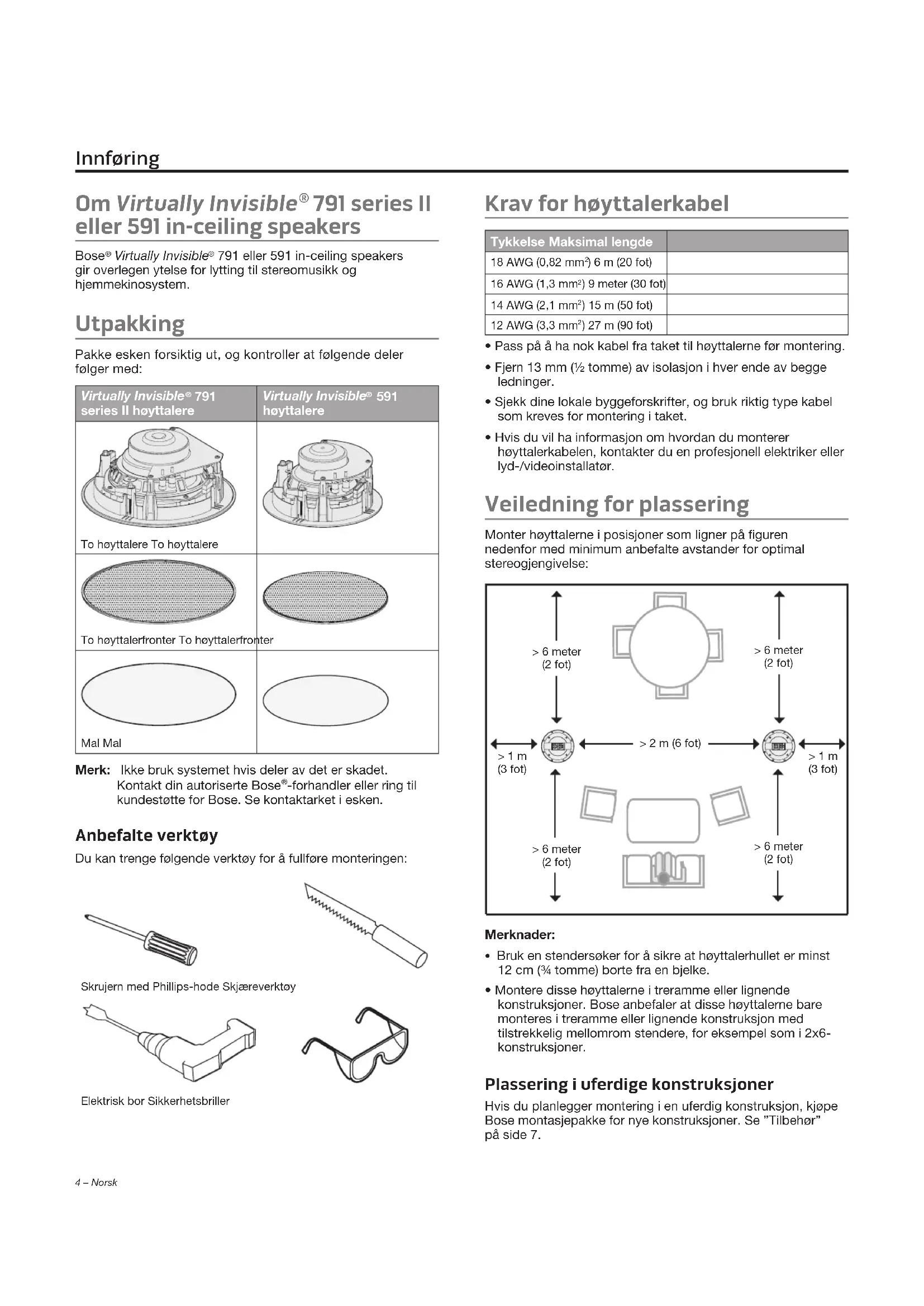 -forhandler eller ring til kundestøtte for Bose. Se kontaktarket i esken. Anbefalte verktøy Du kan trenge følgende verktøy for å fullføre monteringen: Skrujern med Phillips-hode SkjæreverktøyElektrisk bor Sikkerhetsbriller Krav for høyttalerkabel Tykkelse Maksimal lengde 18 AWG (0,82 mm ) 6 m (20 fot)16 AWG (1,3 mm ) 9 meter (30 fot)14 AWG (2,1 mm ) 15 m (50 fot)12 AWG (3,3 mm ) 27 m (90 fot)