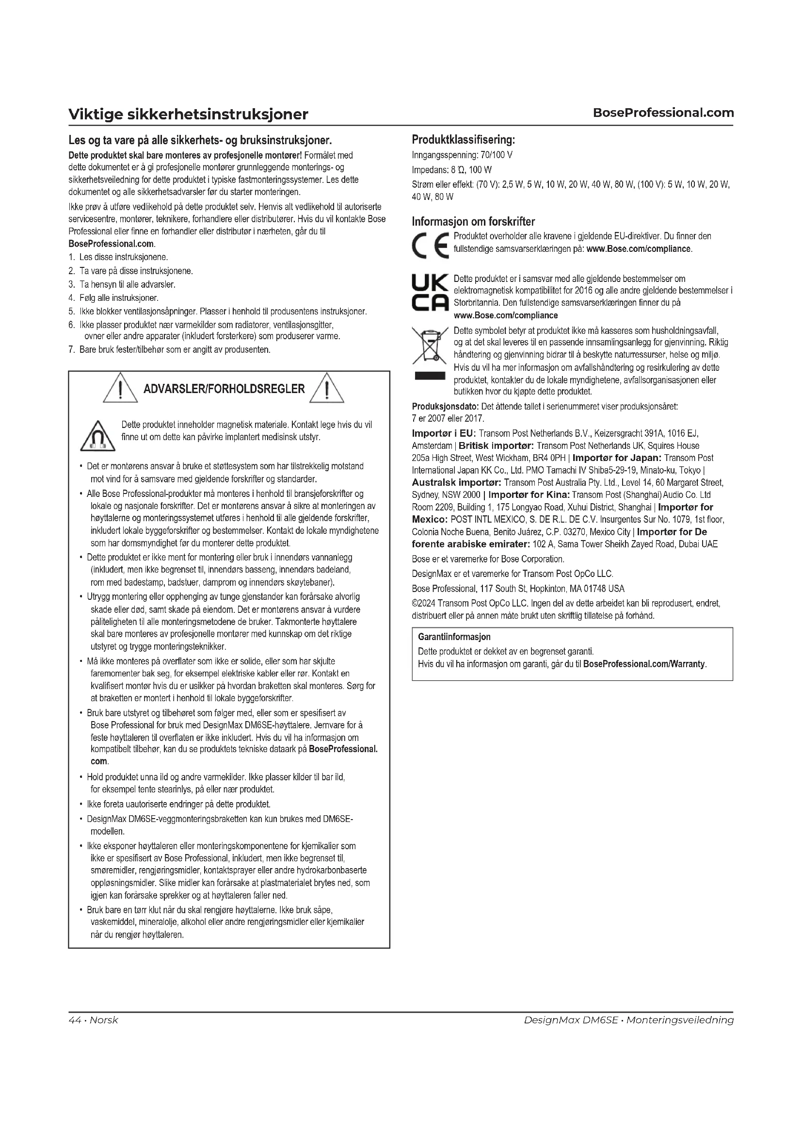 - Bruk bare en tørr klut når du skal rengjøre høyttalerne. Ikke bruk såpe, vaskemiddel, mineralolje, alkohol eller andre rengjøringsmidler eller kjemikalier når du rengjør høyttaleren. Produktklassisering: Inngangsspenning: 70/100 V Impedans: 8 Ώ, 100 W Strøm eller effekt: (70 V): 2,5 W, 5 W, 10 W, 20 W, 40 W, 80 W, (100 V): 5 W, 10 W, 20 W, 40 W, 80 W Informasjon om forskrifter Produktet overholder alle kravene i gjeldende EU-direktiver. Du nner den fullstendige samsvarserklæringen på: www.Bose.com/compliance. Dette produktet er i samsvar med alle gjeldende bestemmelser om elektromagnetisk kompatibilitet for 2016 og alle andre gjeldende bestemmelser i Storbritannia. Den fullstendige samsvarserklæringen nner du på www.Bose.com/compliance Dette symbolet betyr at produktet ikke må kasseres som husholdningsavfall, og at det skal leveres til en passende innsamlingsanlegg for gjenvinning. Riktig håndtering og gjenvinning bidrar til å beskytte naturressurser, helse og miljø. Hvis du vil ha mer informasjon om avfallshåndtering og resirkulering av dette produktet, kontakter du de lokale myndighetene, avfallsorganisasjonen eller butikken hvor du kjøpte dette produktet. Produksjonsdato: Det åttende tallet i serienummeret viser produksjonsåret: 7 er 2007 eller 2017. Importør i EU: Transom Post Netherlands B.V., Keizersgracht 391A, 1016 EJ, Amsterdam | Britisk importør: Transom Post Netherlands UK, Squires House 205a High Street, West Wickham, BR4 0PH | Importør for Japan: Transom Post International Japan KK Co., Ltd. PMO Tamachi IV Shiba5-29-19, Minato-ku, Tokyo | Australsk importør: Transom Post Australia Pty. Ltd., Level 14, 60 Margaret Street, Sydney, NSW 2000 | Importør for Kina: Transom Post (Shanghai) Audio Co. Ltd Room 2209, Building 1, 175 Longyao Road, Xuhui District, Shanghai | Importør for Mexico: POST INTL MEXICO, S. DE R.L. DE C.V. Insurgentes Sur No. 1079, 1st oor, Colonia Noche Buena, Benito Juárez, C.P. 03270, Mexico City | Importør for De forente arabiske emirater: 102 A, Sama Tower Sheikh Zayed Road, Dubai UAE Bose er et varemerke for Bose Corporation. DesignMax er et varemerke for Transom Post OpCo LLC. Bose Professional, 117 South St, Hopkinton, MA 01748 USA ©2024 Transom Post OpCo LLC. Ingen del av dette arbeidet kan bli reprodusert, endret, distribuert eller på annen måte brukt uten skriftlig tillatelse på forhånd. Garantiinformasjon Dette produktet er dekket av en begrenset garanti. Hvis du vil ha informasjon om garanti, går du til BoseProfessional.com/Warranty.Norsk • 45Monteringsveiledning • DesignMax DM6SE BoseProfessional.com Oversikt Innhold i pakken Produktmål × 2 × 2 × 2 × 2 267 mm 210 mm 222 mm 223 mm 229 mm 245 mm 340 mm Tekniske spesifikasjoner Hvis du vil ha flere spesifikasjoner, kan du se det tekniske dataarket for DesignMax DM6SE på BoseProfessional.com. Fysisk Produktmål Høyde: 340 mm Bredde: 222 mm Dybde: 229 mm Nettovekt, Høyttaler med grill og brakett (enkel) 6,40 kg Forsendelsesvekt (par) 14,74 kg Viktig informasjon om montering Før du monterer høyttaleren, må du se gjennom Viktige sikkerhetsinstruksjoner på side 44. Ø 5,5mm46 • Norsk DesignMax DM6SE • Monteringsveiledning BoseProfessional.com Konfigurering Monteringsalternativer Monteringsalternativer og tilbehør q Monteringsbrakett (inkludert) w Surface-Mount Pan and Tilt Bracket (valgfritt) CMBS2 takmonteringsbrakett (valgfri; kun for bruk innendørs) Pole Mount Bracket (valgfritt)