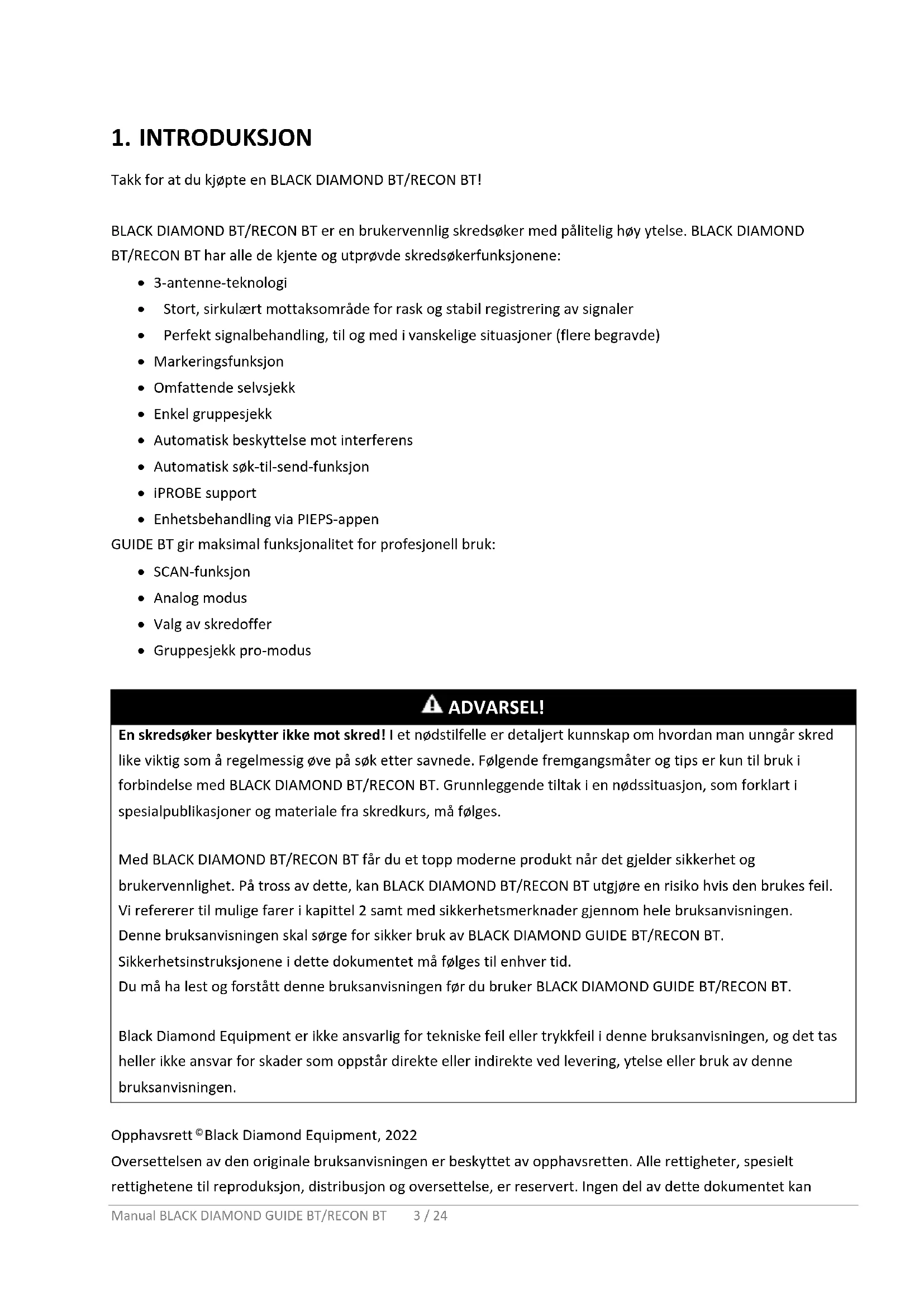 - Gruppesjekk pro-modus ADVARSEL! En skredsøker beskytter ikke mot skred! I et nødstilfelle er detaljert kunnskap om hvordan man unngår skred like viktig som å regelmessig øve på søk etter savnede. Følgende fremgangsmåter og tips er kun til bruk i forbindelse med BLACK DIAMOND BT/RECON BT. Grunnleggende tiltak i en nødssituasjon, som forklart i spesialpublikasjoner og materiale fra skredkurs, må følges. Med BLACK DIAMOND BT/RECON BT får du et topp moderne produkt når det gjelder sikkerhet og brukervennlighet. På tross av dette, kan BLACK DIAMOND BT/RECON BT utgjøre en risiko hvis den brukes feil. Vi refererer til mulige farer i kapittel 2 samt med sikkerhetsmerknader gjennom hele bruksanvisningen. Denne bruksanvisningen skal sørge for sikker bruk av BLACK DIAMOND GUIDE BT/RECON BT. Sikkerhetsinstruksjonene i dette dokumentet må følges til enhver tid. Du må ha lest og forstått denne bruksanvisningen før du bruker BLACK DIAMOND GUIDE BT/RECON BT. Black Diamond Equipment er ikke ansvarlig for tekniske feil eller trykkfeil i denne bruksanvisningen, og det tas heller ikke ansvar for skader som oppstår direkte eller indirekte ved levering, ytelse eller bruk av denne bruksanvisningen.