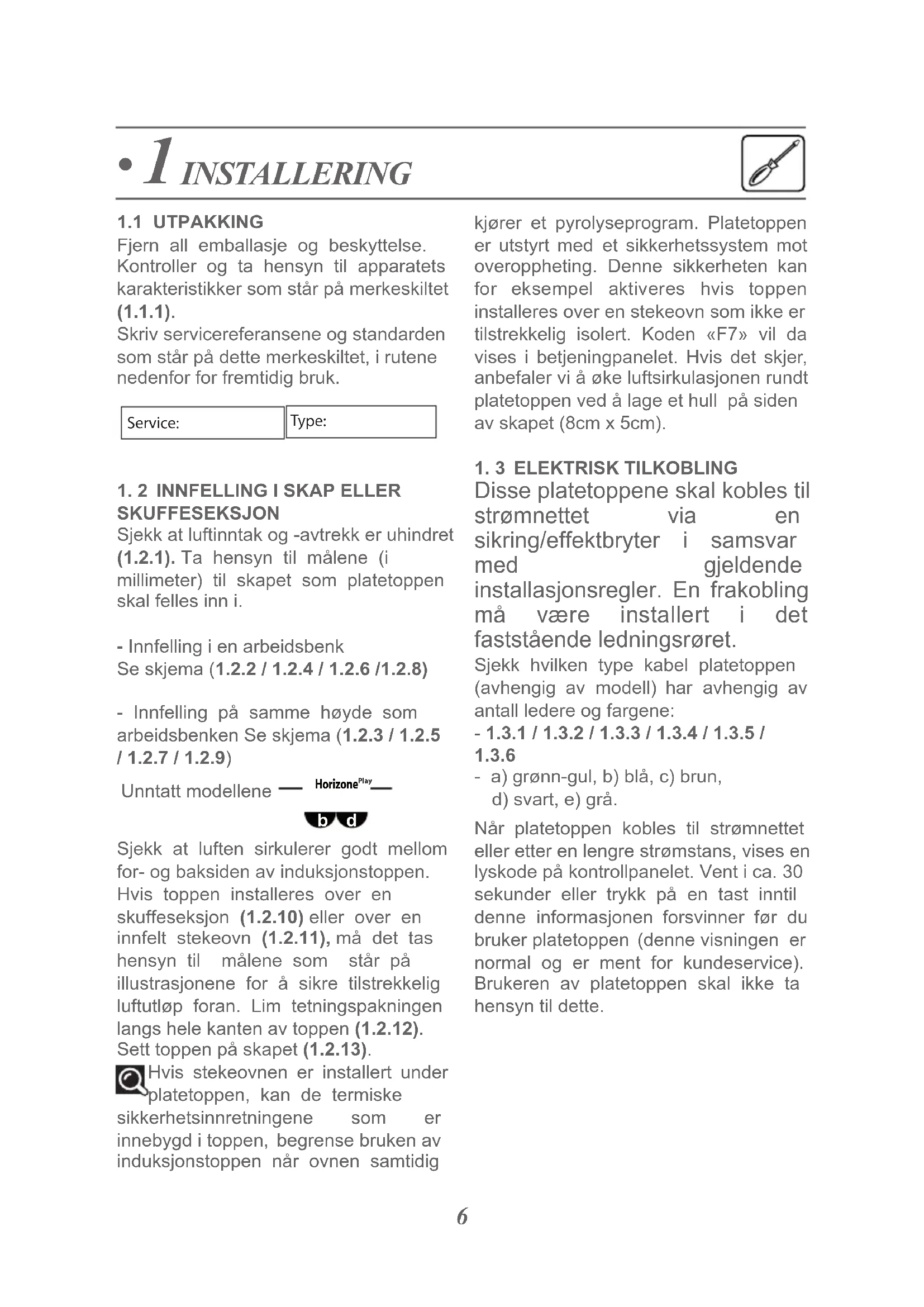 1.1 UTPAKKINGFjern all emballasje og beskyttelse.Kontroller og ta hensyn til apparatetskarakteristikker som står på merkeskiltet(1.1.1).Skriv servicereferansene og standardensom står på dette merkeskiltet, i rutenenedenfor for fremtidig bruk.1. 2 INNFELLING I SKAP ELLERSKUFFESEKSJONSjekk at luftinntak og -avtrekk er uhindret(1.2.1). Ta hensyn til målene (imillimeter) til skapet som platetoppenskal felles inn i.- Innfelling i en arbeidsbenkSe skjema (1.2.2 / 1.2.4 / 1.2.6 /1.2.8)- Innfelling på samme høyde somarbeidsbenken Se skjema (1.2.3 / 1.2.5/ 1.2.7 / 1.2.9)Unntatt modellene Sjekk at luften sirkulerer godt mellomfor- og baksiden av induksjonstoppen.Hvis toppen installeres over enskuffeseksjon (1.2.10) eller over eninnfelt stekeovn (1.2.11), må det tashensyn til målene som står påillustrasjonene for å sikre tilstrekkeligluftutløp foran. Lim tetningspakningenlangs hele kanten av toppen (1.2.12).Sett toppen på skapet (1.2.13). Hvis stekeovnen er installert under platetoppen, kan de termiskesikkerhetsinnretningene som erinnebygd i toppen, begrense bruken avinduksjonstoppen når ovnen samtidig