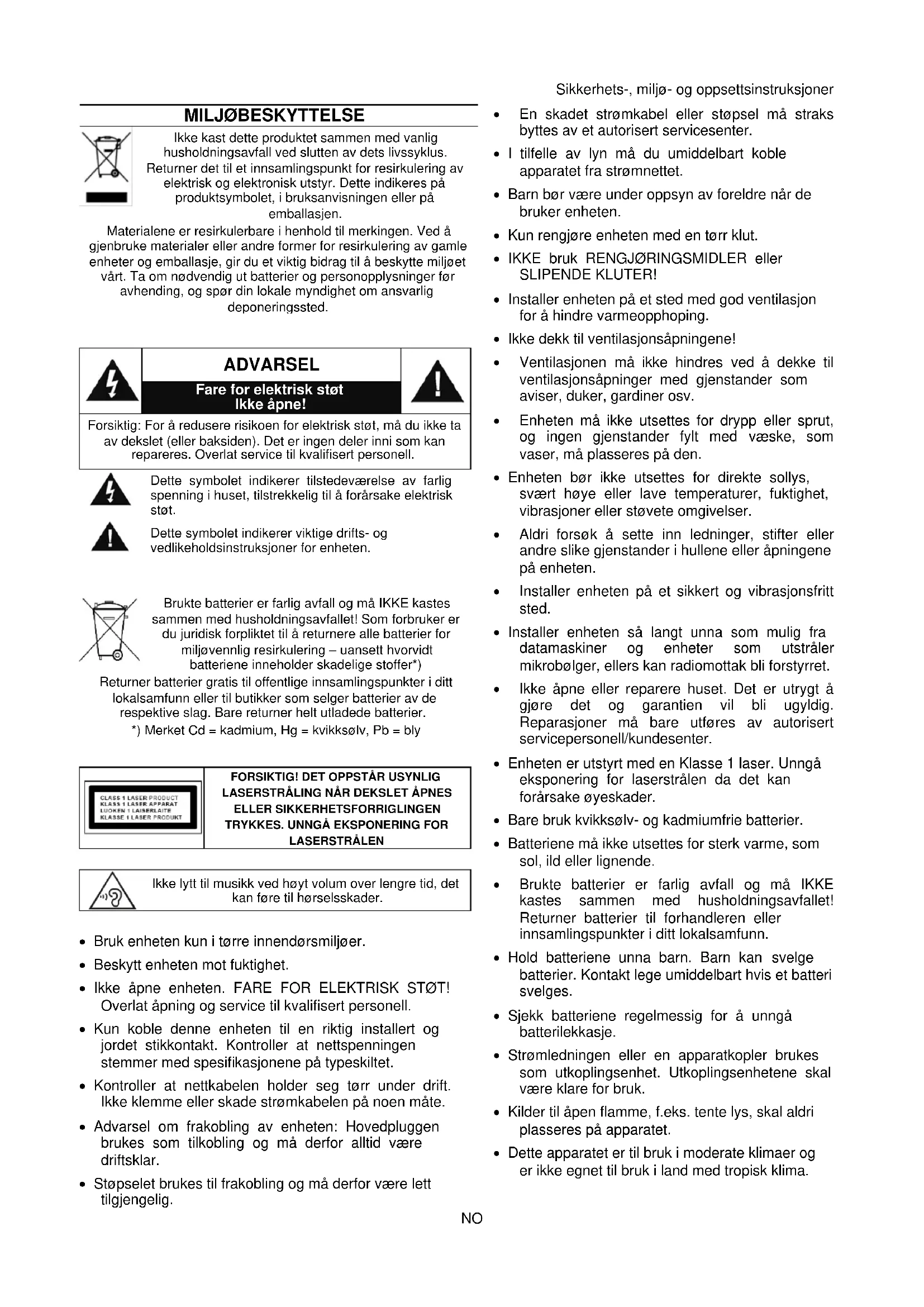 Forsiktig: Bruk av anlegget på andre måter enn det som beskrives i denne bruksanvisningen anses som ukorrekt og kan resultere i skader på anlegg eller person, samt tap av garantirett. Denne enheten må ikke repareres av andre enn kvalifisert servicepersonale. Viktig: Ettersom bevegelse av CD-mekanismen og det sensitive kretssystemet kan forårsake interferens for radiomottakere i nærheten, må denne enheten slås av mens du bruker andre radioenheter.