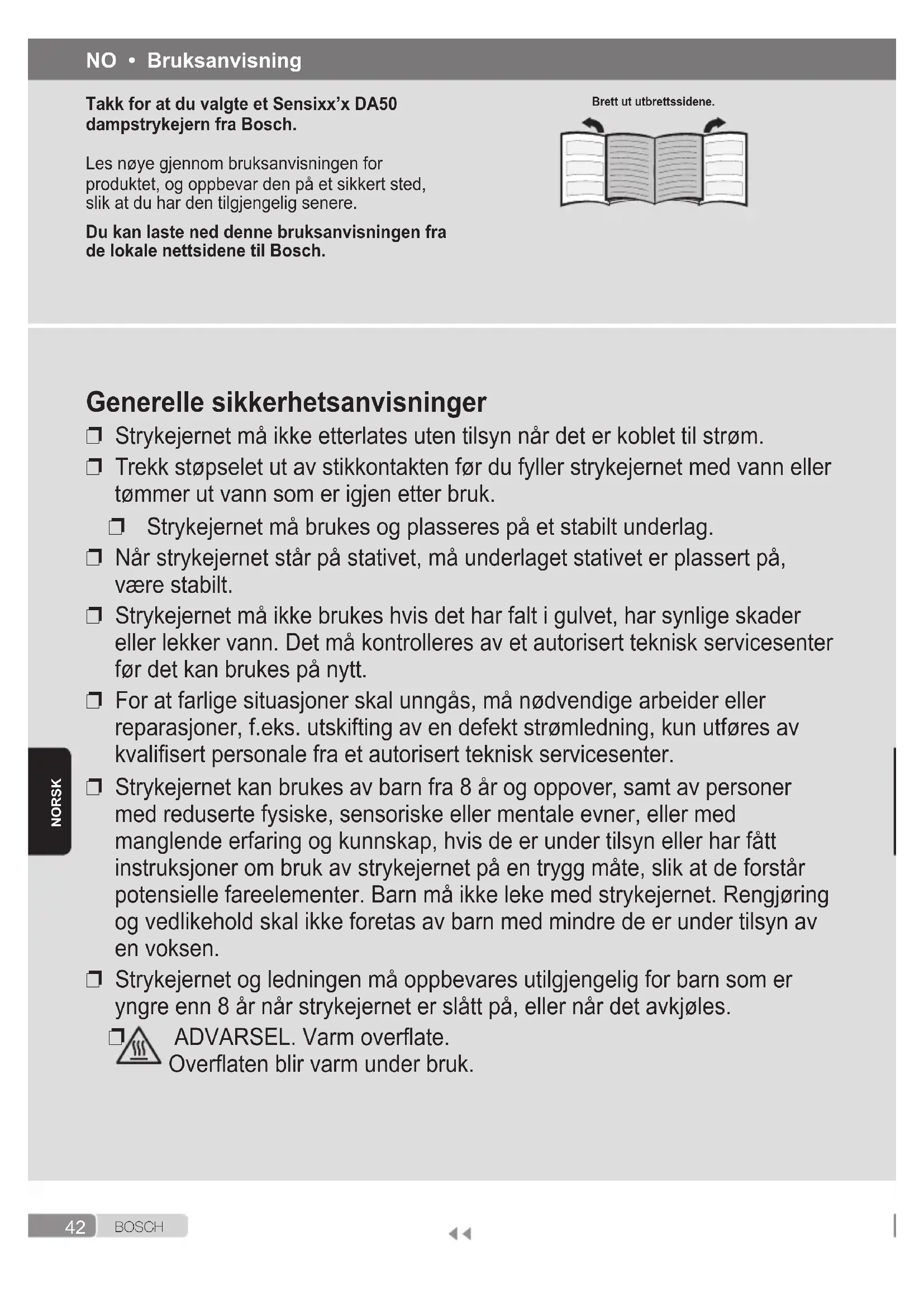 ADVARSEL. Varm overate. Overaten blir varm under bruk. NO • Bruksanvisning Takk for at du valgte et Sensixx’x DA50 dampstrykejern fra Bosch. Les nøye gjennom bruksanvisningen for produktet, og oppbevar den på et sikkert sted, slik at du har den tilgjengelig senere. Du kan laste ned denne bruksanvisningen fra de lokale nettsidene til Bosch. Brett ut utbrettssidene.43 B O S C H