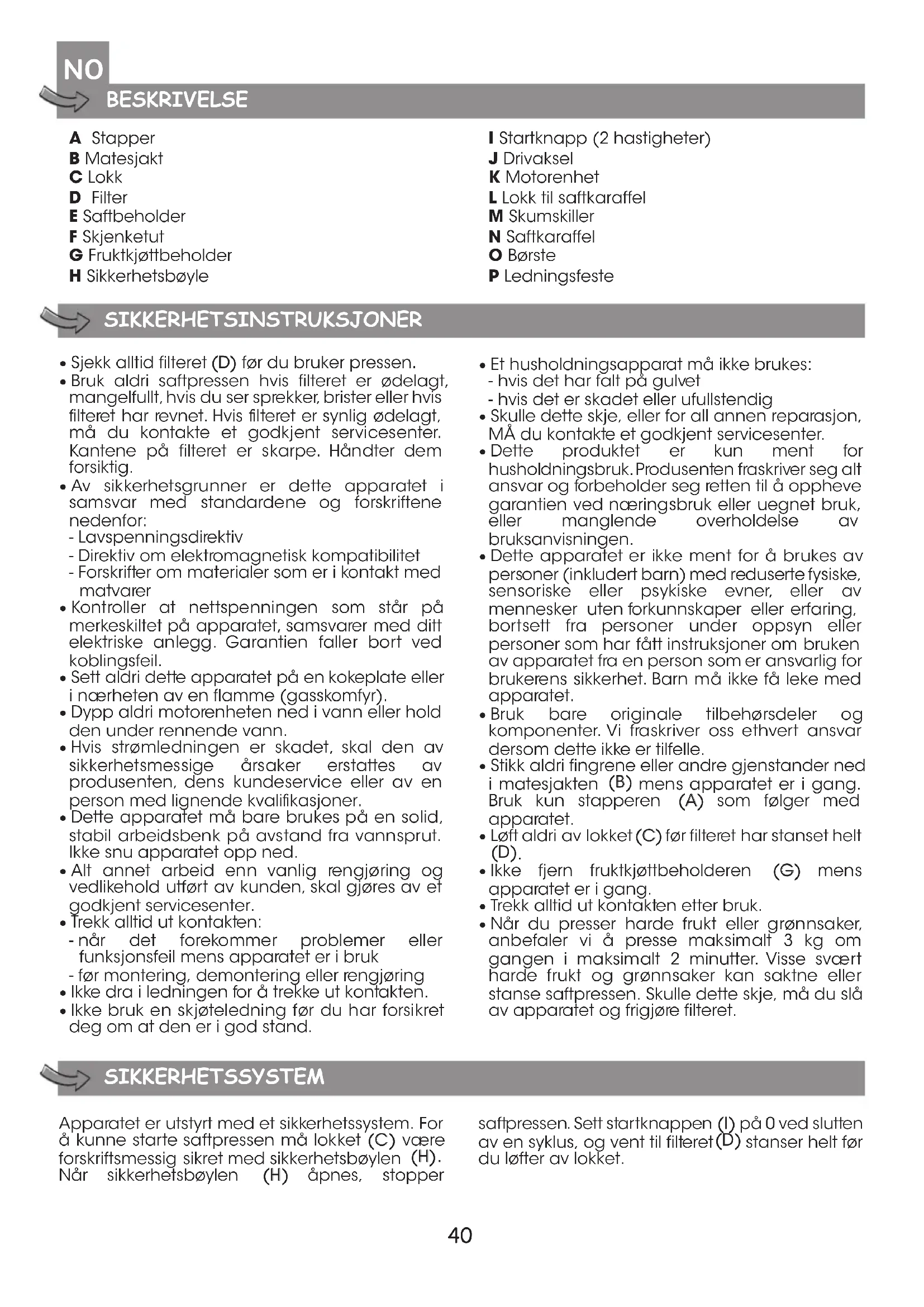- Dette produktet er kun ment for husholdningsbruk. Produsenten fraskriver seg alt ansvar og forbeholder seg retten til å oppheve garantien ved næringsbruk eller uegnet bruk, eller manglende overholdelse av bruksanvisningen.