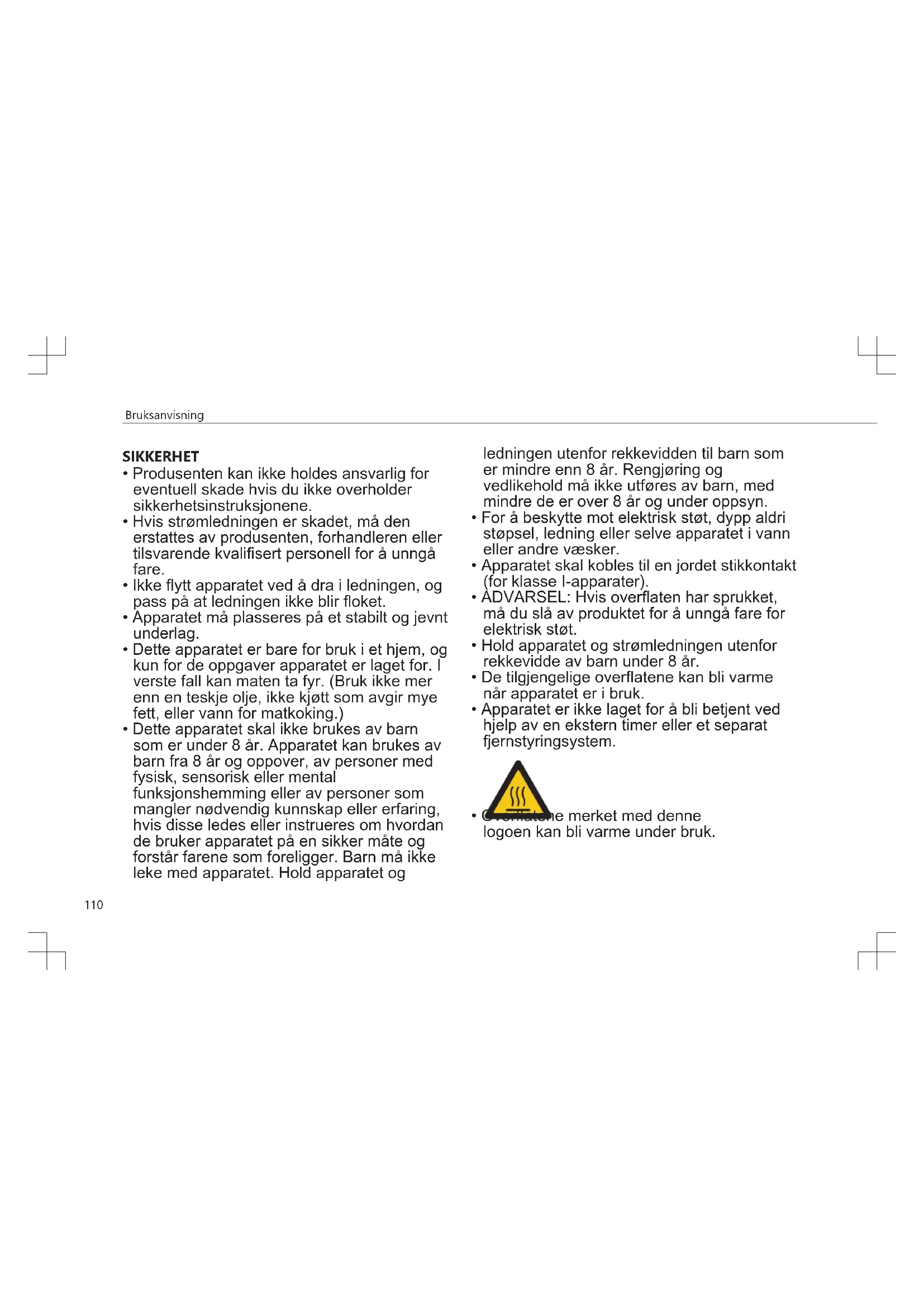 - Dette apparatet skal ikke brukes av barn som er under 8 år. Apparatet kan brukes av barn fra 8 år og oppover, av personer med fysisk, sensorisk eller mental funksjonshemming eller av personer som mangler nødvendig kunnskap eller erfaring, hvis disse ledes eller instrueres om hvordan de bruker apparatet på en sikker måte og forstår farene som foreligger. Barn må ikke leke med apparatet. Hold apparatet og ledningen utenfor rekkevidden til barn som er mindre enn 8 år. Rengjøring og vedlikehold må ikke utføres av barn, med mindre de er over 8 år og under oppsyn.