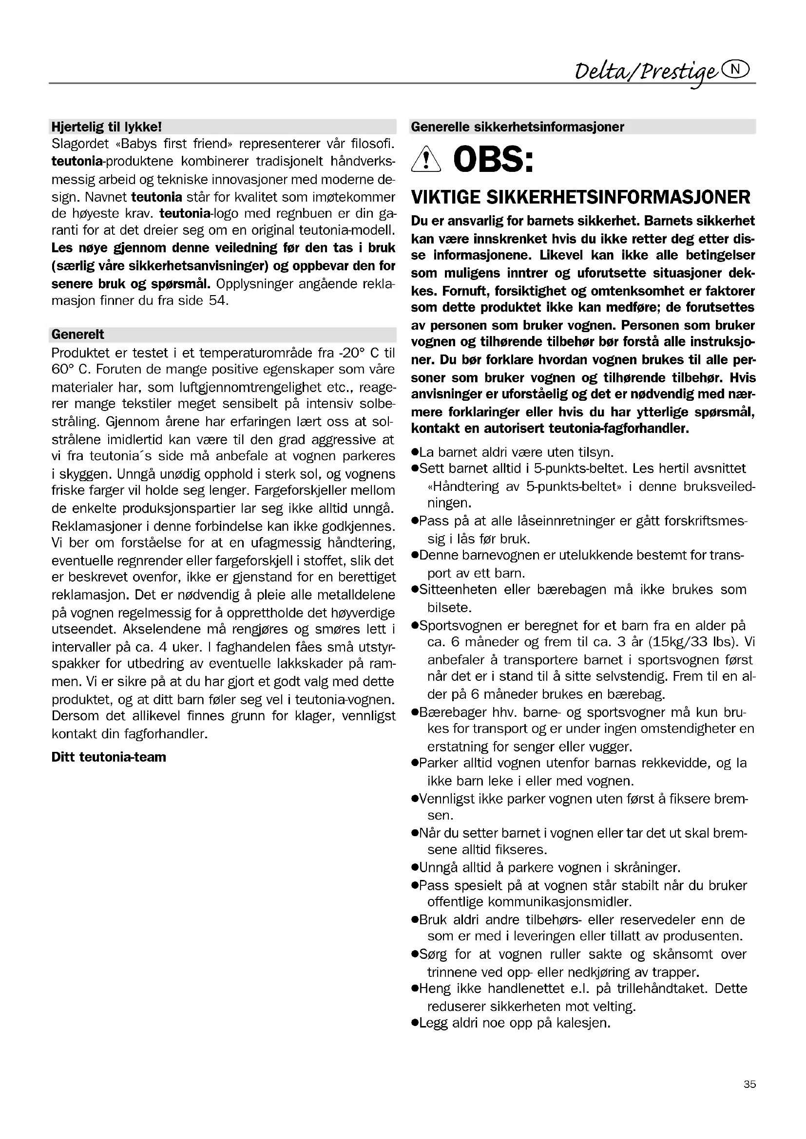 - hjultype 32 på teutonia-Y2K System 04 ** hjultype 40 på teutonia-Y2K System 04Delta/Prestige n Hjertelig til lykke! Slagordet «Babys first friend» representerer vår filosofi. teutonia-produktene kombinerer tradisjonelt håndverks- messig arbeid og tekniske innovasjoner med moderne de- sign. Navnet teutonia står for kvalitet som imøtekommer de høyeste krav. teutonia-logo med regnbuen er din ga- ranti for at det dreier seg om en original teutonia-modell. Les nøye gjennom denne veiledning før den tas i bruk (særlig våre sikkerhetsanvisninger) og oppbevar den for senere bruk og spørsmål. Opplysninger angående rekla- masjon finner du fra side