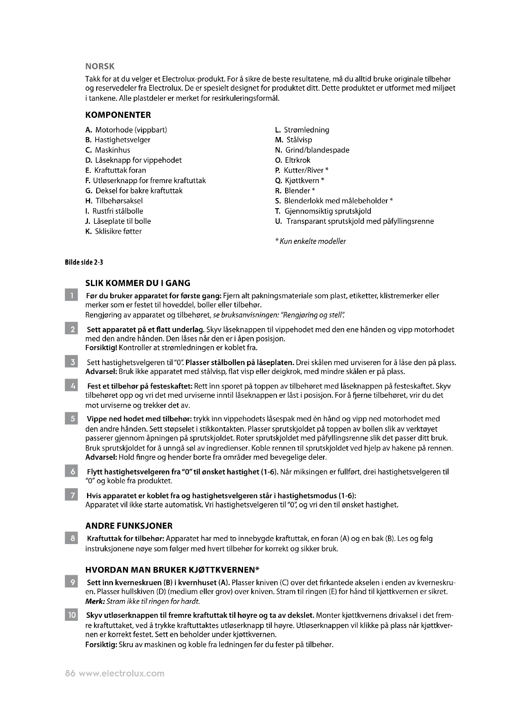 17 Koble fra produktet. Ballongvispen, kjøttkvernen* og skjære-/rivemaskinen* skal kun vaskes for hånd i varmt såpevann. Bollen, atvispen og deigkroken kan settes i oppvaskmaskinen. Bare plasser deler på øverste hyllen hvis du bruker en oppvaskmaskin. Forsiktig! Knivbladene og innsatsene er meget skarpe og kan forårsake skade. Advarsel! Aldri senk hoveddelen, pluggen eller ledningen i vann eller annen væske. Tørk hver del grundig før bruk. 18 Rengjøring av blenderen*: Roter blenderen mot urviseren og ta den av. Ta av lokket. Hell ut blandingen fra blenderen. Tilsett en dråpe op- pvaskmiddel og en liter varmt vann. Fest blenderen på apparatet. Kjør maskinen på hastighet 6 i et halvt minutt, og hell ut vannet. Skyll blenderen og la den tørke. Forsiktig! Knivbladene og innsatsene er meget skarpe og kan forårsake skade. 19 Hoveddelen bør bare rengjøres med en fuktig klut, og deretter tørkes med en klut. Merk: Ikke bruk skuremidler eller skuresvamper for å rengjøre overatene på apparatet. Nyt ditt nye Electrolux-produkt!88 www.electrolux.com SIKKERHETSRÅD Les følgende anvisninger nøye før du bruker apparatet for første gang.