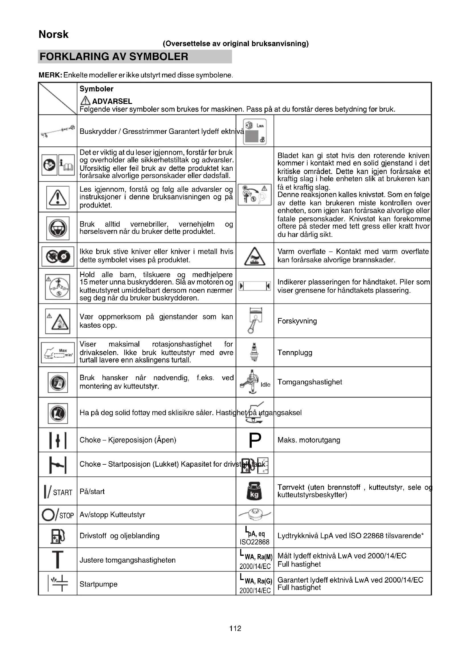 MERK: Enkelte modeller er ikke utstyrt med disse symbolene. Symboler ADVARSEL Følgende viser symboler som brukes for maskinen. Pass på at du forstår deres betydning før bruk. Buskrydder / Gresstrimmer Garantert lydeff ektnivå Det er viktig at du leser igjennom, forstår før bruk og overholder alle sikkerhetstiltak og advarsler. Uforsiktig eller feil bruk av dette produktet kan forårsake alvorlige personskader eller dødsfall. Bladet kan gi støt hvis den roterende kniven kommer i kontakt med en solid gjenstand i det kritiske området. Dette kan igjen forårsake et kraftig slag i hele enheten slik at brukeren kan få et kraftig slag. Denne reaksjonen kalles knivstøt. Som en følge av dette kan brukeren miste kontrollen over enheten, som igjen kan forårsake alvorlige eller fatale personskader. Knivstøt kan forekomme oftere på steder med tett gress eller kratt hvor du har dårlig sikt. Les igjennom, forstå og følg alle advarsler og instruksjoner i denne bruksanvisningen og på produktet. Bruk alltid vernebriller, vernehjelm og hørselsvern når du bruker dette produktet. Ikke bruk stive kniver eller kniver i metall hvis dette symbolet vises på produktet. Varm overfl ate – Kontakt med varm overfl ate kan forårsake alvorlige brannskader. Hold alle barn, tilskuere og medhjelpere 15 meter unna buskrydderen. Slå av motoren og kutteutstyret umiddelbart dersom noen nærmer seg deg når du bruker buskrydderen. Indikerer plasseringen for håndtaket. Piler som viser grensene for håndtakets plassering. Vær oppmerksom på gjenstander som kan kastes opp. Forskyvning min