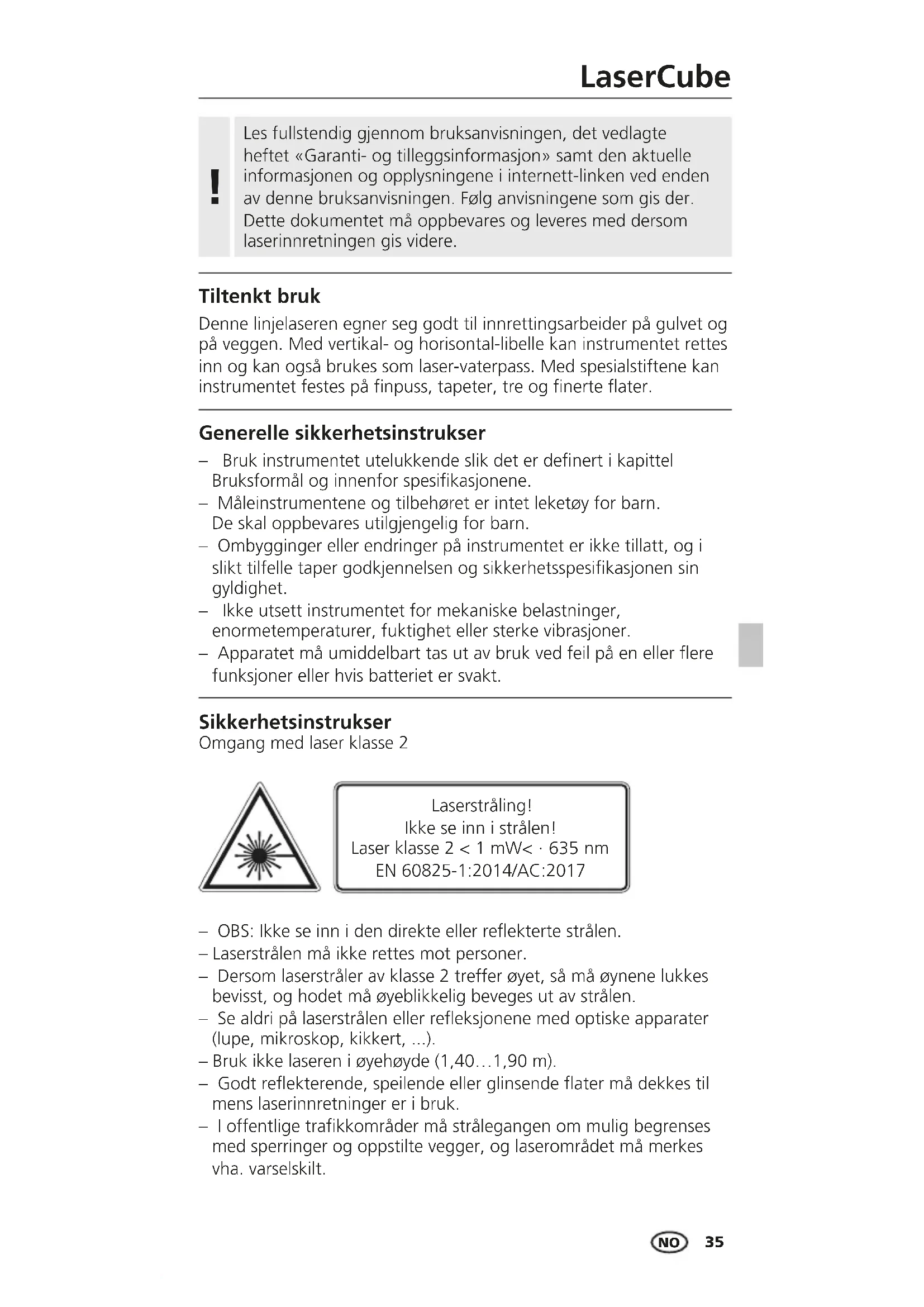 Tiltenkt bruk Denne linjelaseren egner seg godt til innrettingsarbeider på gulvet og på veggen. Med vertikal- og horisontal-libelle kan instrumentet rettes inn og kan også brukes som laser-vaterpass. Med spesialstiftene kan instrumentet festes på finpuss, tapeter, tre og finerte flater. Generelle sikkerhetsinstrukser – Bruk instrumentet utelukkende slik det er denert i kapittel Bruksformål og innenfor spesikasjonene. – Måleinstrumentene og tilbehøret er intet leketøy for barn. De skal oppbevares utilgjengelig for barn. – Ombygginger eller endringer på instrumentet er ikke tillatt, og i slikt tilfelle taper godkjennelsen og sikkerhetsspesikasjonen sin gyldighet. – Ikke utsett instrumentet for mekaniske belastninger, enormetemperaturer, fuktighet eller sterke vibrasjoner. – Apparatet må umiddelbart tas ut av bruk ved feil på en eller ere funksjoner eller hvis batteriet er svakt. – OBS: Ikke se inn i den direkte eller reekterte strålen. – Laserstrålen må ikke rettes mot personer. – Dersom laserstråler av klasse 2 treffer øyet, så må øynene lukkes bevisst, og hodet må øyeblikkelig beveges ut av strålen. – Se aldri på laserstrålen eller reeksjonene med optiske apparater (lupe, mikroskop, kikkert, ...). – Bruk ikke laseren i øyehøyde (1,40…1,90 m). – Godt reekterende, speilende eller glinsende ater må dekkes til mens laserinnretninger er i bruk. – I offentlige trakkområder må strålegangen om mulig begrenses med sperringer og oppstilte vegger, og laserområdet må merkes vha. varselskilt. Sikkerhetsinstrukser Omgang med laser klasse 2 Laserstråling! Ikke se inn i strålen! Laser klasse 2 < 1 mW< · 635 nm EN 60825-1:2014/AC:2017NO