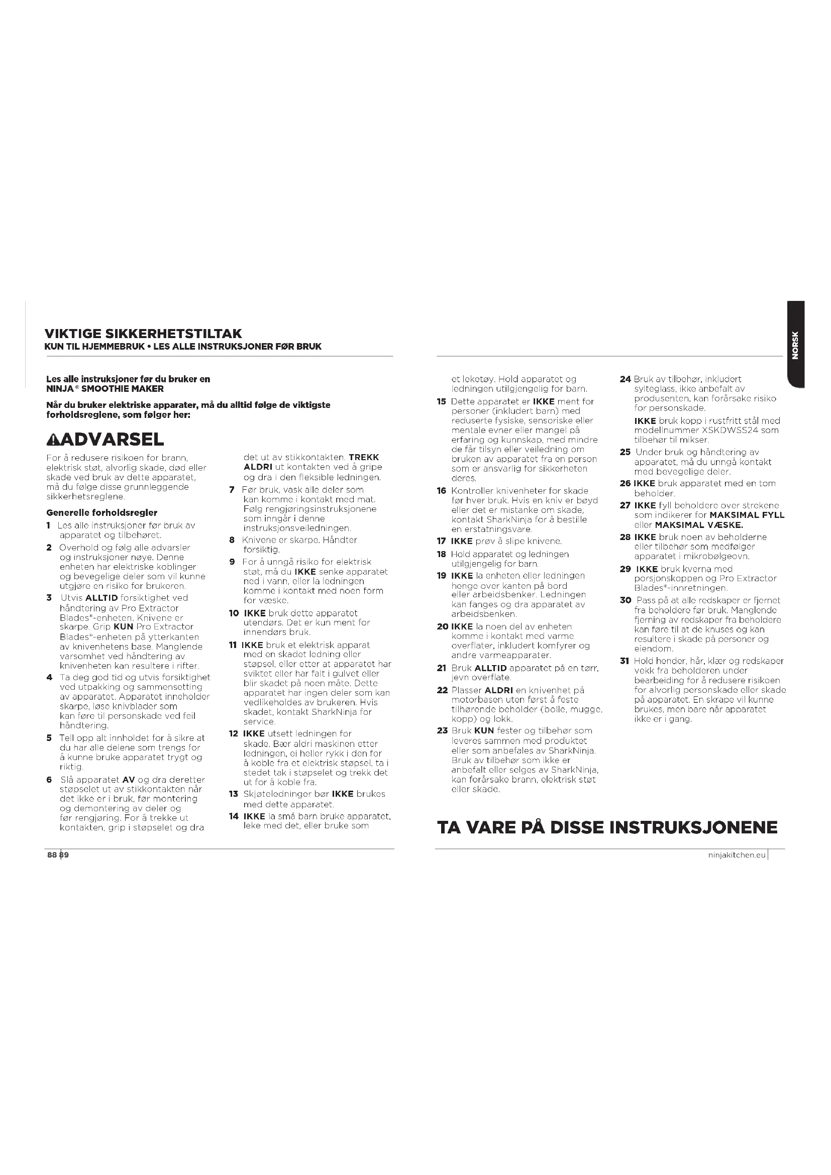 av en Ninja® Smoothie Maker Dette merket indikerer at produktet ikke skal kastes sammen med annet husholdningsavfall i EU. For å forhindre potensiell skade av miljøet eller menneskelig helse fra ukontrollert kassering av avfall, skal det resirkuleres på en ansvarlig måte for å fremme bærekraftig gjenbruk av materielle ressurser. For å returnere en brukt enhet, bruk systemene for retur- og innsamling, eller kontakt forhandleren der produktet ble kjøpt. De kan ta imot og resirkulere produktet på en miljømessig trygg måte.88 89 ninjakitchen.eu NORSK Les alle instruksjoner før du bruker en NINJA