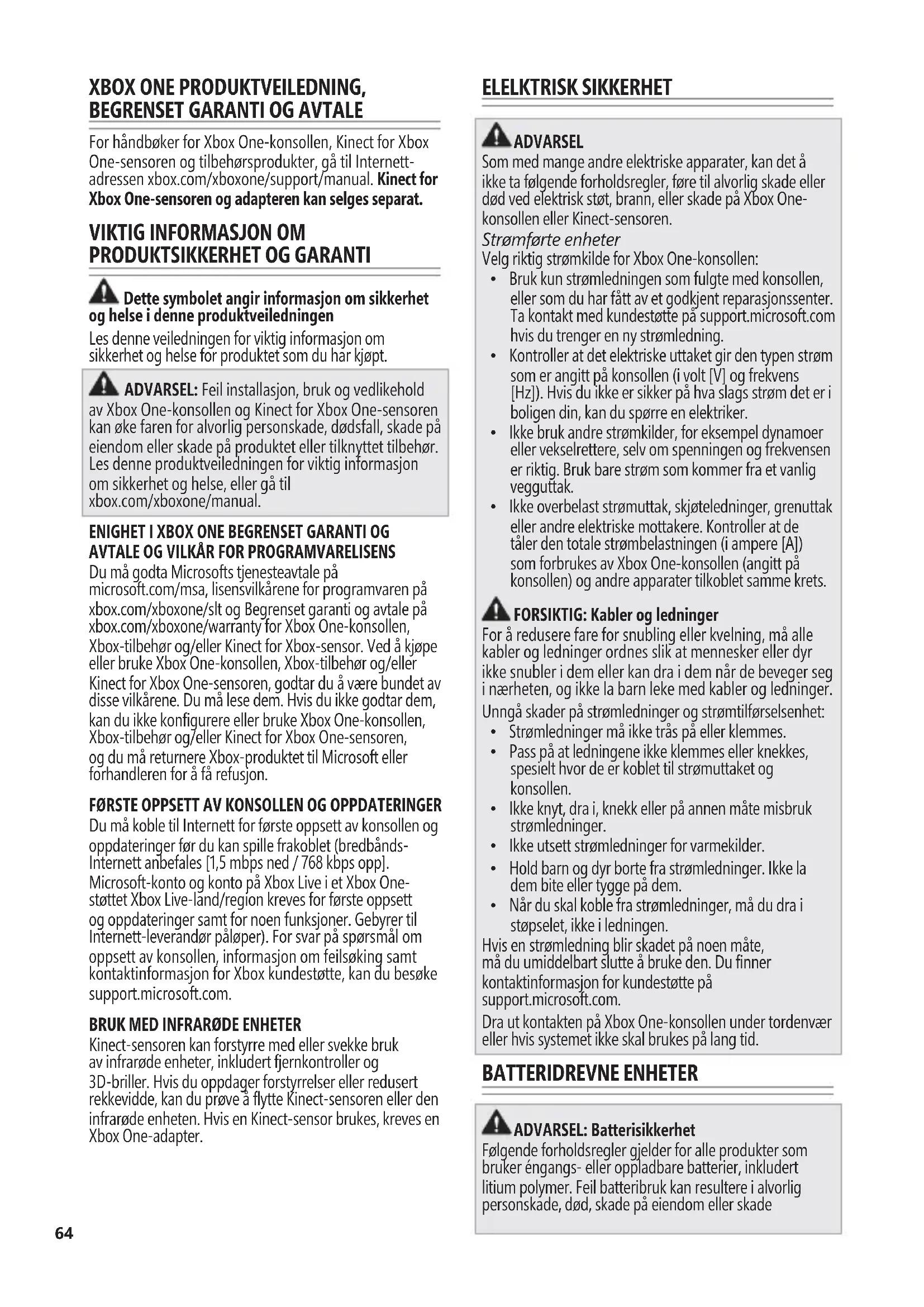 - Når du skal koble fra strømledninger, må du dra i støpselet, ikke i ledningen. Hvis en strømledning blir skadet på noen måte, må du umiddelbart slutte å bruke den. Du finner kontaktinformasjon for kundestøtte på support.microsoft.com. Dra ut kontakten på Xbox One-konsollen under tordenvær eller hvis systemet ikke skal brukes på lang tid. BATTERIDREVNE ENHETER ADVARSEL: Batterisikkerhet Følgende forholdsregler gjelder for alle produkter som bruker éngangs- eller oppladbare batterier, inkludert litium polymer. Feil batteribruk kan resultere i alvorlig personskade, død, skade på eiendom eller skade65 på produktet eller relatert tilbehør, som følge av at batterivæsken lekker ut, brann, overoppheting eller eksplosjon. Batterivæske som kommer ut er etsende og kan være giftig. Den kan forårsake brannsår på huden og øynene, og er skadelig hvis den svelges. Gjør følgende for å redusere faren for skade: Oppbevar batterier utilgjengelig for barn. Ta ut batteriene hvis de er utbrukte eller før du skal lagre enheten over en lengre periode. Batterier som er gamle, svake eller tomme skal alltid straks tas ut og resirkuleres eller kastes i henhold til lokale og nasjonale/regionale lover om avhending. Hvis et batteri lekker, tar du ut alle batterier ved å følge installasjonstrinnene i motsatt rekkefølge. Vær forsiktig så du ikke får batterivæske på huden eller klærne dine. Hvis du får batterivæske på hud eller klær, må du øyeblikkelig skylle huden med vann. Tørk batteripakken godt med en tørr klut før nye batterier settes i, eller følg produsentens anvisning for renhold.