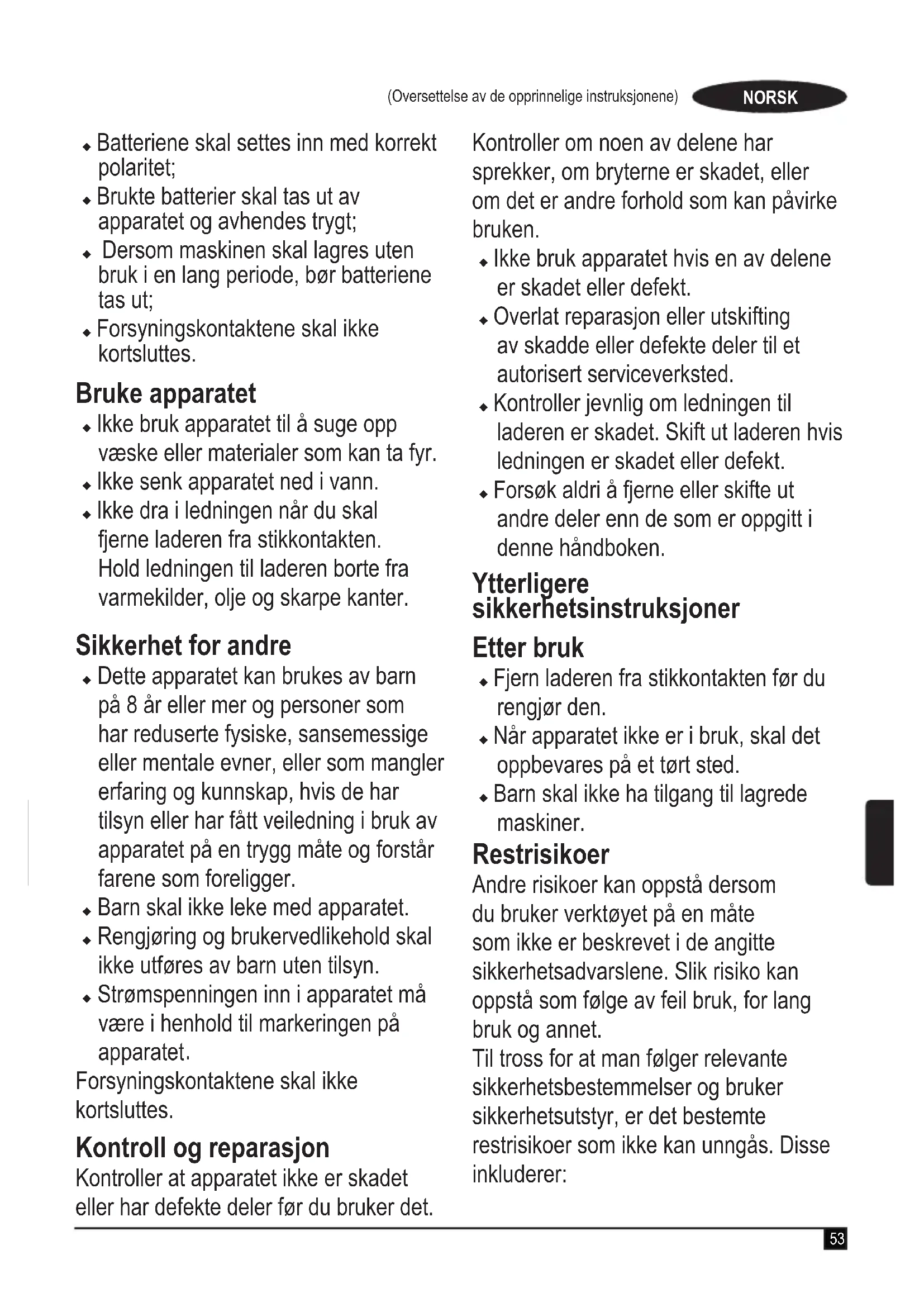 Advarsel! Les alle sikkerhetsadvarsler og alle instruksjoner. Manglende overholdelse av advarslene og instruksjonene kan resultere i elektrisk sjokk, brann og/eller alvorlig skade. u Beregnet bruk er beskrevet i denne håndboken. Hvis du bruker annet tilbehør, kobler til annet utstyr eller bruker dette apparatet til andre oppgaver enn det som er anbefalt i denne håndboken, kan det føre til fare for personskade. u Ta vare på denne håndboken for fremtidig bruk. u Oppladbare batterier skal tas ut av apparatet for lading; u Ulike typer batterier eller nye og gamle batterier skal ikke blandes;53 (Oversettelse av de opprinnelige instruksjonene) NORSK u Batteriene skal settes inn med korrekt polaritet; u Brukte batterier skal tas ut av apparatet og avhendes trygt; u Dersom maskinen skal lagres uten bruk i en lang periode, bør batteriene tas ut; u Forsyningskontaktene skal ikke kortsluttes. Bruke apparatet u Ikke bruk apparatet til å suge opp væske eller materialer som kan ta fyr. u Ikke senk apparatet ned i vann.u Ikke dra i ledningen når du skal fjerne laderen fra stikkontakten. Hold ledningen til laderen borte fra varmekilder, olje og skarpe kanter. Sikkerhet for andre u Dette apparatet kan brukes av barn på 8 år eller mer og personer som har reduserte fysiske, sansemessige eller mentale evner, eller som mangler erfaring og kunnskap, hvis de har tilsyn eller har fått veiledning i bruk av apparatet på en trygg måte og forstår farene som foreligger. u Barn skal ikke leke med apparatet. u Rengjøring og brukervedlikehold skal ikke utføres av barn uten tilsyn. u Strømspenningen inn i apparatet må være i henhold til markeringen på apparatet
