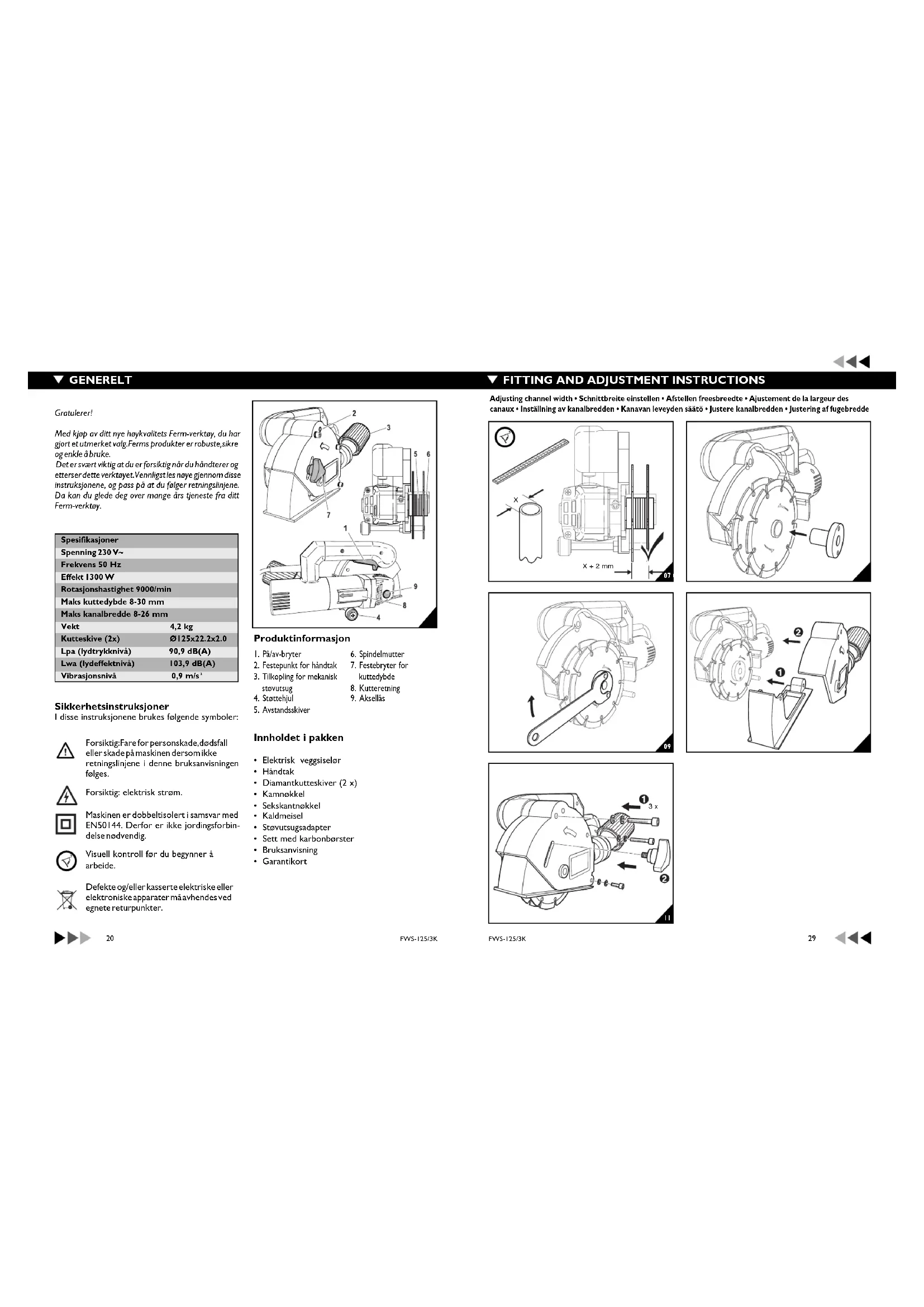 - Garantikort Spesifikasjoner Spenning 230 V~ Frekvens 50 Hz Effekt 1300 W Rotasjonshastighet 9000/min Maks kuttedybde 8-30 mm Maks kanalbredde 8-26 mm Vekt 4,2 kg Kutteskive (2x) Ø125x22.2x2.0 Lpa (lydtrykknivå) 90,9 dB(A) Lwa (lydeffektnivå) 103,9 dB(A) Vibrasjonsnivå 0,9 m/s