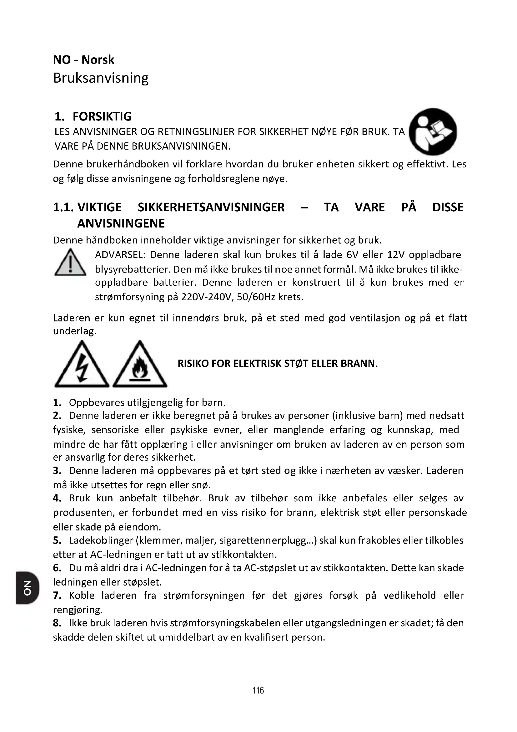ANVISNINGENE Denne håndboken inneholder viktige anvisninger for sikkerhet og bruk. ADVARSEL: Denne laderen skal kun brukes til å lade 6V eller 12V oppladbare blysyrebatterier. Den må ikke brukes til noe annet formål. Må ikke brukes til ikke- oppladbare batterier. Denne laderen er konstruert til å kun brukes med en strømforsyning på 220V-240V, 50/60Hz krets.
