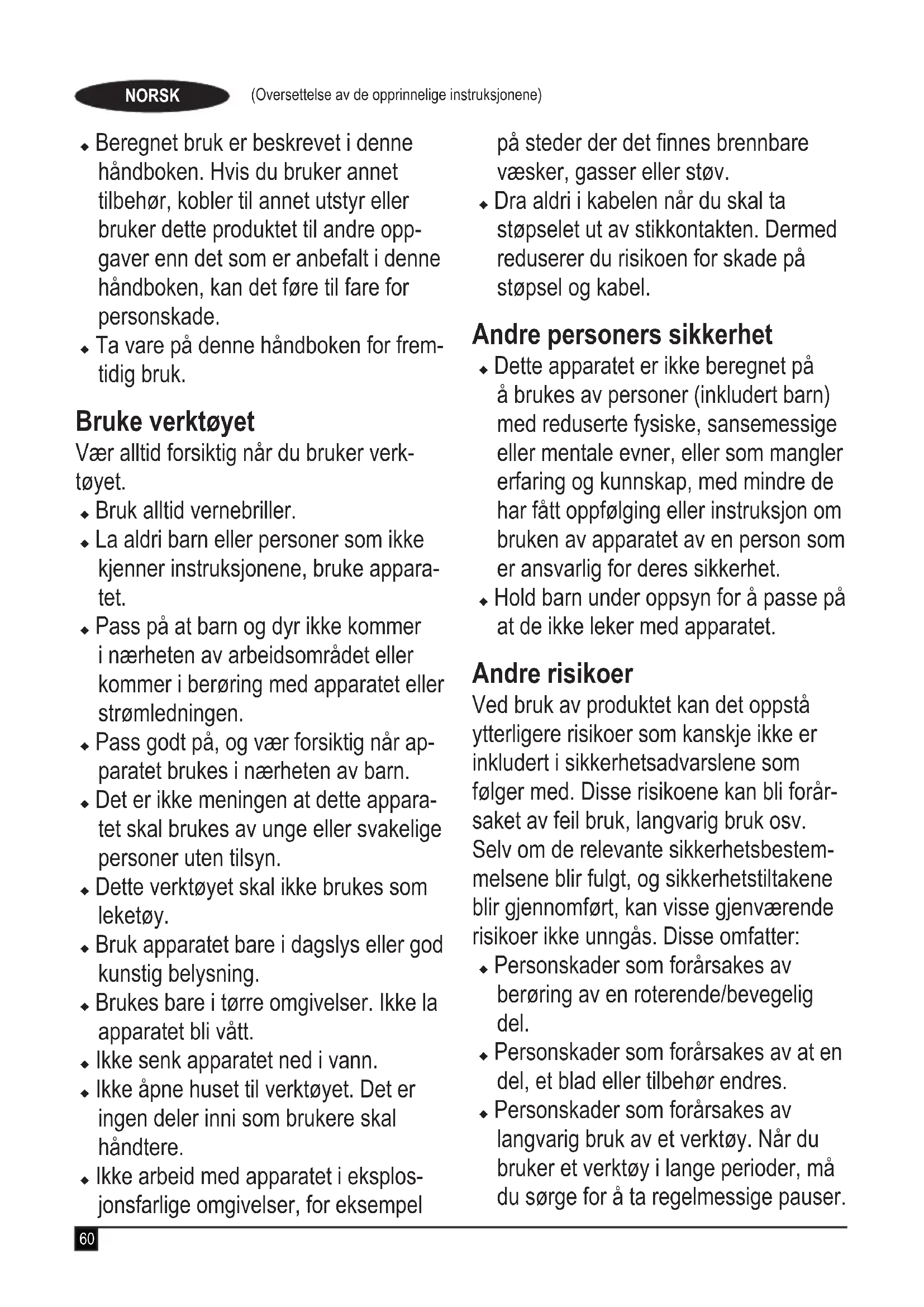 (garanterad ljudnivå) 95 dB(A)De här produkterna överensstämmer även med direktiven 2006/42/EC, 2014/108/EU och 2011/65/EU.Mer information får du genom att titta i slutet av bruksanvis-ningen eller genom att kontakta Black & Decker på följande adress.Undertecknad är ansvarig för sammanställningen av tekniska data och gör denna försäkran för Black & Decker.R.LaverickEngineering ManagerBlack & Decker Europe, 210 Bath Road, Slough,Berkshire, SL1 3YDUnited Kingdom27/11/2018 Garanti Black & Decker är säker på kvaliteten hos denna produkt och erbjuder kunder 24 månaders garanti från inköpsdatumet. Garantin gäller utöver konsumentens rättigheter enligt lag och påverkar inte dessa. Garantin är giltig i de områden som tillhör medlemsstaterna i Europeiska unionen och det europeiska frihandelsområdet. För yrkande under garantin måste yrkandet vara in enlighet med Black & Deckers villkor och du kommer att behöva skicka in bevis på köpet till försäljaren eller en auktoriserad reparatör. Villkoren för Black & Deckers tvååriga garanti och var du hittar din närmaste auktoriserade reparatör kan erhållas på internet på www.2helpU.com, eller genom att kontakta ditt lokal Black & Decker kontor på adressen som angetts i denna bruksanvisning. Besök vår webbplats www.blackanddecker.se för att registrera din nya Black & Decker-produkt samt för att få information om nya produkter och specialerbjudanden. Bruksområde BLACK+DECKER-BDT555KIT - Trimmeren er konstruert for å trimme og pynte plenkanter og slå gress på trange steder. Verktøyet er beregnet bare som konsumentverktøy. Sikkerhetsinstruksjoner Advarsel! Når du bruker apparater som drives med strøm fra nettet, må grunnleggende sikkerhetsforholdsregler (inkludert punktene som er beskrevet nedenfor) alltid følges for å redusere risikoen for brann, elektrisk støt, person- skade og skade på materiell. Advarsel! Når du bruker maskinen, må du følge sikkerhetsreglene. Les disse instruksjonene før du bruker maskinen, for å ivareta sikkerheten for deg selv og personer i nærheten. Ta vare på instruks- jonene for senere bruk. u Les hele denne håndboken nøye før du bruker apparatet.60 (Oversettelse av de opprinnelige instruksjonene) NORSK på steder der det nnes brennbare væsker, gasser eller støv. u Dra aldri i kabelen når du skal ta støpselet ut av stikkontakten. Dermed reduserer du risikoen for skade på støpsel og kabel. Andre personers sikkerhet u Dette apparatet er ikke beregnet på å brukes av personer (inkludert barn) med reduserte fysiske, sansemessige eller mentale evner, eller som mangler erfaring og kunnskap, med mindre de har fått oppfølging eller instruksjon om bruken av apparatet av en person som er ansvarlig for deres sikkerhet. u Hold barn under oppsyn for å passe på at de ikke leker med apparatet. Andre risikoer Ved bruk av produktet kan det oppstå ytterligere risikoer som kanskje ikke er inkludert i sikkerhetsadvarslene som følger med. Disse risikoene kan bli forår- saket av feil bruk, langvarig bruk osv. Selv om de relevante sikkerhetsbestem- melsene blir fulgt, og sikkerhetstiltakene blir gjennomført, kan visse gjenværende risikoer ikke unngås. Disse omfatter: u Personskader som forårsakes av berøring av en roterende/bevegelig del. u Personskader som forårsakes av at en del, et blad eller tilbehør endres. u Personskader som forårsakes av langvarig bruk av et verktøy. Når du bruker et verktøy i lange perioder, må du sørge for å ta regelmessige pauser. u Beregnet bruk er beskrevet i denne håndboken. Hvis du bruker annet tilbehør, kobler til annet utstyr eller bruker dette produktet til andre opp- gaver enn det som er anbefalt i denne håndboken, kan det føre til fare for personskade. u Ta vare på denne håndboken for frem- tidig bruk. Bruke verktøyet Vær alltid forsiktig når du bruker verk- tøyet. u Bruk alltid vernebriller. u La aldri barn eller personer som ikke kjenner instruksjonene, bruke appara- tet. u Pass på at barn og dyr ikke kommer i nærheten av arbeidsområdet eller kommer i berøring med apparatet eller strømledningen. u Pass godt på, og vær forsiktig når ap- paratet brukes i nærheten av barn. u Det er ikke meningen at dette appara- tet skal brukes av unge eller svakelige personer uten tilsyn. u Dette verktøyet skal ikke brukes som leketøy. u Bruk apparatet bare i dagslys eller god kunstig belysning. u Brukes bare i tørre omgivelser. Ikke la apparatet bli vått. u Ikke senk apparatet ned i vann. u Ikke åpne huset til verktøyet. Det er ingen deler inni som brukere skal håndtere. u Ikke arbeid med apparatet i eksplos- jonsfarlige omgivelser, for eksempel61 (Oversettelse av de opprinnelige instruksjonene) NORSK u Svekket hørsel. u Helsefarer som forårsakes av innånd- ing av støv som dannes når du bruker apparatet (for eksempel i arbeid med tre, spesielt eik, bøk og MDF). Etter bruk u Når produktet ikke er i bruk, skal det oppbevares på et tørt og godt ventilert sted utilgjengelig for barn. u Oppbevar apparatet utilgjengelig for barn. u Når produktet oppbevares eller transporteres i et kjøretøy, bør det plasseres i bagasjerommet eller fes- tes, slik at det ikke påvirkes av raske farts- eller retningsendringer. Kontroll og reparasjon u Kontroller at apparatet ikke er skadet eller har defekte deler før du bruker det. Kontroller om noen av delene er skadet, eller om det er andre forhold som kan påvirke bruken. u Ikke bruk apparatet hvis noen del er skadet eller defekt. u Overlat reparasjon eller utskifting av skadde eller defekte deler til et autoris- ert serviceverksted. u Forsøk aldri å fjerne eller bytte ut andre deler enn de som er oppgitt i denne håndboken. Ytterligere sikkerhetsinstruks- joner gresstrimmere Advarsel! Skjæreelementene vil fortsette å rotere etter at motoren er slått av. u Gjør deg kjent med hvordan man betjener og bruker apparatet på riktig måte. u Før bruk må du kontrollere str