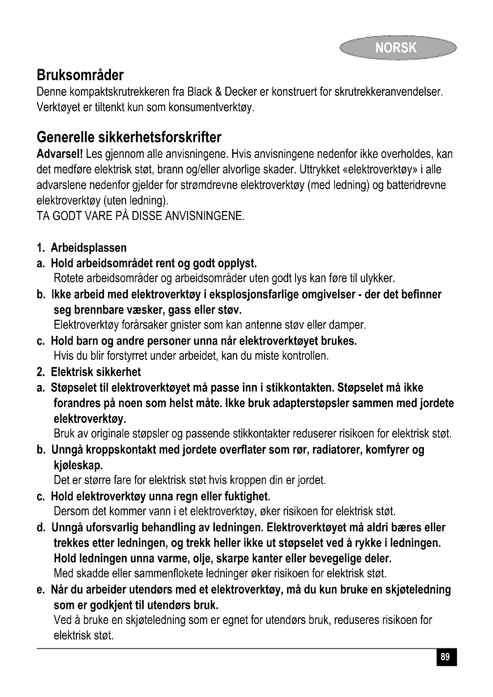 (usikkerhet i akustisk effekt) 3 dB(A) Kevin Hewitt Adm. dir. for forbrukerteknikk Spennymoor, County Durham DL16 6JG, Storbritannia 1-12-2006 Reservdeler / reparasjoner Reservdeler kan kjøpes hos autoriserte Black & Decker serviceverksteder, som også gir kostnadsoverslag og reparerer våre produkter. Oversikt over våre autoriserte serviceverksteder finnes på Internet, vår hjemmeside www.blackanddecker.no samt www.2helpU.com Garanti Black & Decker garanterer at produktet ikke har material- og/eller fabrikasjonsfeil ved levering til kunde. Garantien er i tillegg til kundens lovlige rettigheter og påvirker ikke disse. Garantien gjelder innen medlemsstatene i den Europeiske Unionen og i det Europeiske Frihandelsområdet. Hvis et Black & Decker produkt går i stykker på grunn av material- og/eller fabrikasjonsfeil eller har mangler i forhold til spesifikasjonene, innen 24 måneder fra kjøpet, påtar Black & Decker seg å reparere eller bytte ut produktet med minst mulig vanskelighet for kunden. Garantien gjelder ikke for feil som kommer av: normal slittasje feilaktig bruk eller vedlikehold (mislighold) at produktet har blitt skadet av fremmede gjenstander, emner eller ved et uhell98 NORSK Det gjøres oppmerksom på at produktet ikke er beregnet på industriell/profesjonell/ yrkesmessig bruk, men til hus- og hjemmebruk. Garantien gjelder ikke om reparasjoner har blitt utført av noen andre enn et autorisert Black & Decker serviceverksted. For å ta garantien i bruk skal produktet og kjøpekvittering leveres til forhandleren eller til et autorisert serviceverksted senest 2 måneder etter at feilen har blitt oppdaget. For informasjon om nærmeste autoriserte serviceverksted; kontakt det lokale Black & Decker kontoret på den adressen som er angitt i bruksanvisningen. En oversikt over alle autoriserte serviceverksteder samt servicevilkår finnes også tilgjengelig på Internet, adresse: www.2helpU.com Vennligst stikk innom våre nettsider på www.blackanddecker.no for å registrere ditt nye Black & Decker-produkt og for å holde deg oppdatert om nye produkter og spesialtilbud. Du finner mer informasjon om Black & Decker og produktutvalget vårt på www.blackanddecker.no99 DANSK Anvendelsesområde Din Black & Decker kompakte skruetrækker er beregnet til skruning af skruer. Værktøjet er kun beregnet til privat brug. Generelle sikkerhedsregler Advarsel! Læs alle instrukserne. Hvis nedenstående instrukser ikke følges, er der risiko for elektrisk stød, brand og/eller alvorlige personskader. Det benyttede begreb "el-værktøj" i nedennævnte advarsler refererer til netdrevne (med tilslutningsledning) eller batteridrevne maskiner (uden tilslutningsledning). DISSE INSTRUKSER BØR OPBEVARES TIL SENERE BRUG.