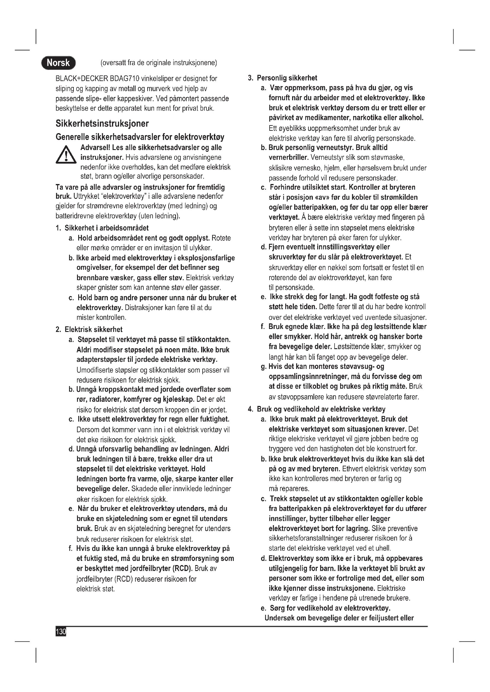 (oversatt fra de originale instruksjonene) Norsk (oversatt fra de originale instruksjonene) BLACK+DECKER BDAG710 vinkelsliper er designet for sliping og kapping av metall og murverk ved hjelp av passende slipe- eller kappeskiver. Ved påmontert passende beskyttelse er dette apparatet kun ment for privat bruk. Sikkerhetsinstruksjoner Generelle sikkerhetsadvarsler for elektroverktøy