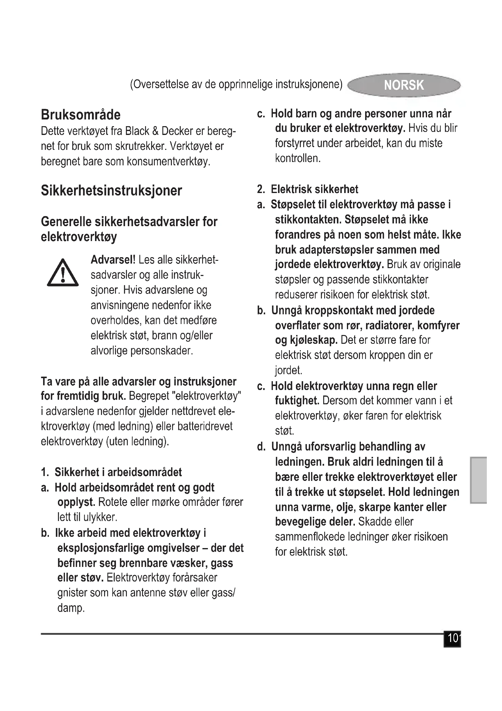 Kevin Hewitt Vice-President Global Engineering Black & Decker Europe, 210 Bath Road, Slough Berkshire, SL1 3YD Storbritannia 28/05/2013111 (Oversettelse av de opprinnelige instruksjonene) NORSK Garanti Black & Decker er trygg på kvaliteten på sine produkter og tilbyr en enestående garanti. Denne garantierklæringen kommer i tillegg til dine lovbestemte rettigheter og er ikke i konikt med disse. Garantien er gyldig i EU- og EFTA-medlemsstatene. Hvis et Black & Decker-produkt går i stykker på grunn av material- og/eller fabrikasjonsfeil eller har mangler i forhold til spesikasjonene innen 24 måneder fra kjøpet, påtar Black & Decker seg å skifte ut defekte deler, reparere produkter som har vært utsatt for alminnelig slitasje, eller bytte ut slike produkter med minst mulig vanskelighet for kunden, med mindre: u Produktet har vært brukt i yrkes-/nærings- virksomhet eller til utleie. u Produktet har vært utsatt for feilaktig bruk eller dårlig vedlikehold. u Produktet har blitt skadet av fremmede gjenstander eller stoffer eller ved et uhell. u Andre enn autoriserte serviceverksteder eller Black & Deckers serviceteknikere har forsøk å reparere produktet. For å ta garantien i bruk må du vise kjøpskvit- tering til forhandleren eller til et autorisert serviceverksted. Du kan nne ut hvor nærmeste autoriserte serviceverksted er, ved å kontakte din lokale Black & Decker-avdeling på adressen som er oppgitt i denne hånd- boken. En oversikt over autoriserte Black & Decker-serviceverksteder og alle opplysninger om ettersalgsservice og kontakter er også tilgjengelig på Internett: www.2helpU.com Besøk vårt webområde www.blackanddecker. no for å registrere ditt nye Black & Decker- produkt og for å holde deg oppdatert om nye produkter og spesialtilbud. Du nner mer informasjon om Black & Decker og produk- tutvalget vårt på www.blackanddecker.no.112 (Oversættelse af de oprindelige instruktioner) DANSK Tilsigtet brug Din Black & Decker-skruemaskine uden ledn- ing er designet til at skrue med. Værktøjet er kun beregnet til privat brug. Sikkerhedsanvisninger Generelle sikkerhedsadvarsler ve- drørende elværktøj