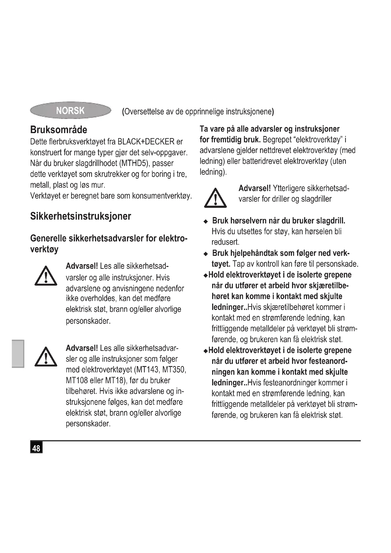 Advarsel! Les alle sikkerhetsad- varsler og alle instruksjoner. Hvis advarslene og anvisningene nedenfor ikke overholdes, kan det medføre elektrisk støt, brann og/eller alvorlige personskader.