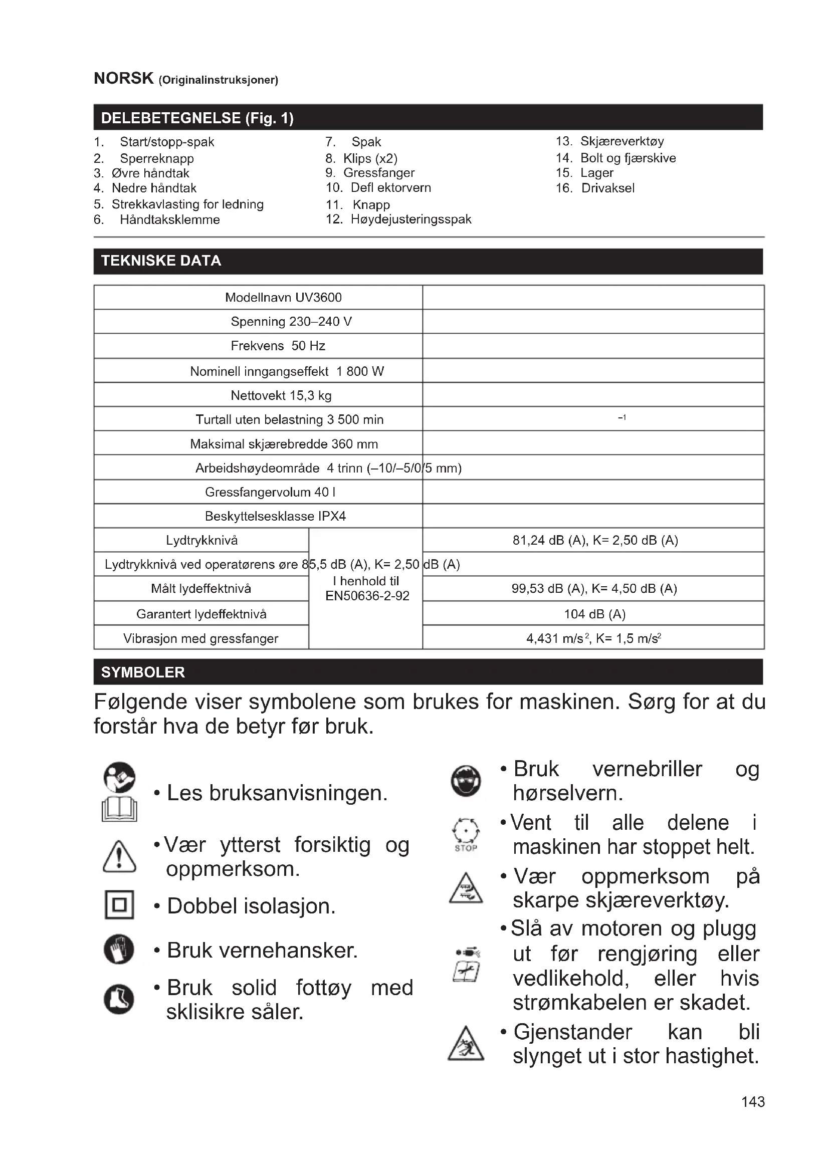 Maksimal skjærebredde 360 mm Arbeidshøydeområde 4 trinn (–10/–5/0/5 mm) Gressfangervolum 40 l Beskyttelsesklasse IPX4 Lydtrykknivå I henhold til EN50636-2-92 81,24 dB (A), K= 2,50 dB (A) Lydtrykknivå ved operatørens øre 85,5 dB (A), K= 2,50 dB (A) Målt lydeffektnivå 99,53 dB (A), K= 4,50 dB (A) Garantert lydeffektnivå 104 dB (A) Vibrasjon med gressfanger 4,431 m/s